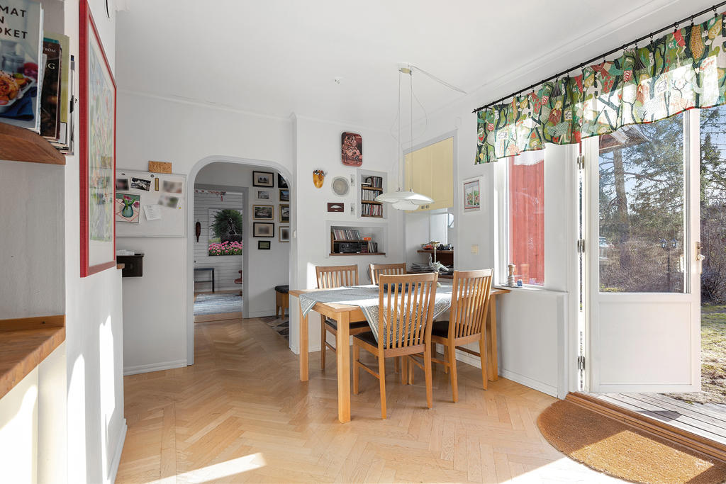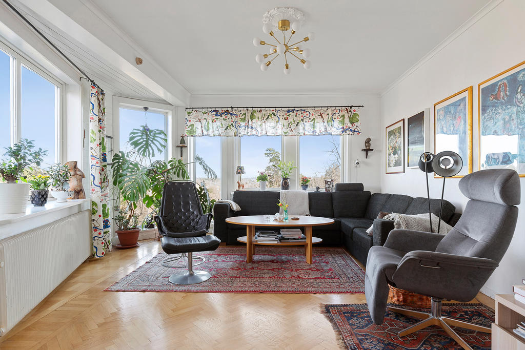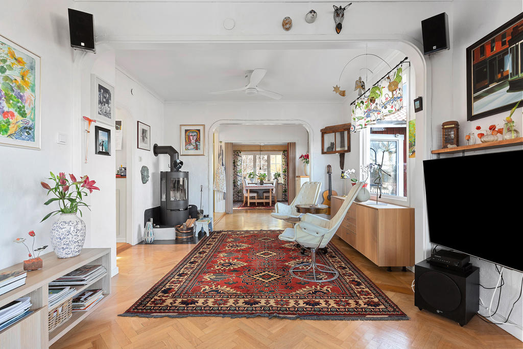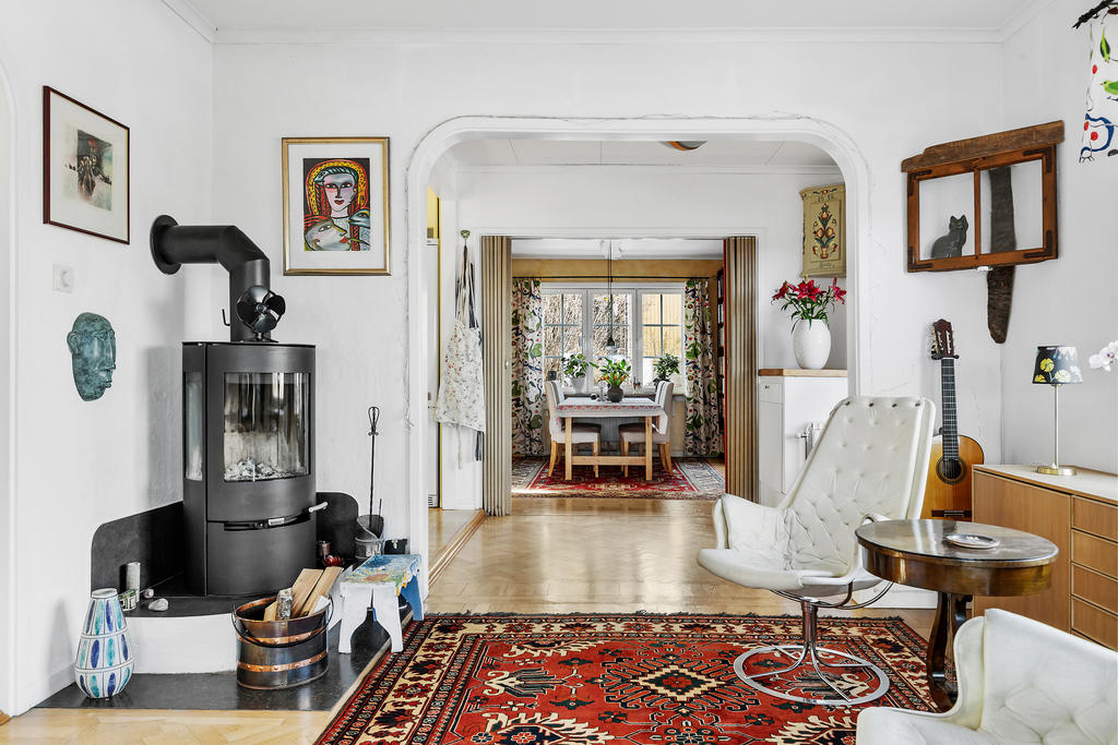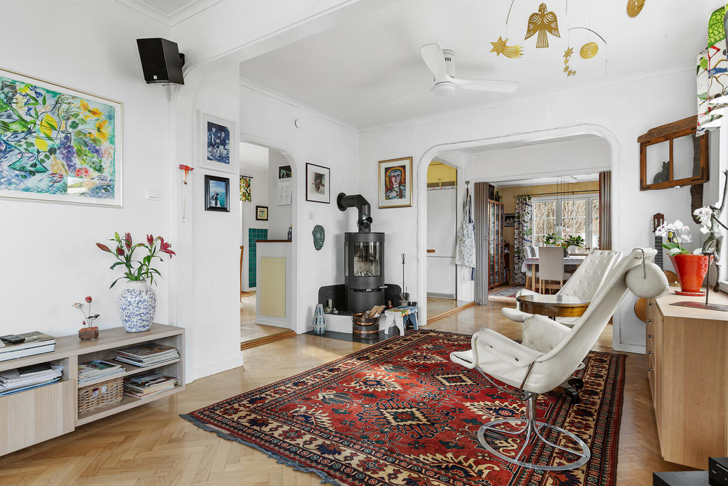 Hjärtat i 30-talsdelen är det generösa vardagsrummet. Här möts man av den klassiska fiskbensparketten och en sprakande braskamin som skapar en genuin atmosfär under vinterhalvåret. Det är också härifrån man blickar ut över omgivningarna genom stora fönsterpartier som bjuder på en panoramavy. I husets 60-talsdel är den tidstypiska holländska parketten bevarad och här finns de karaktärsfulla vikdörrarna kvar som kan skilja av matdelen.