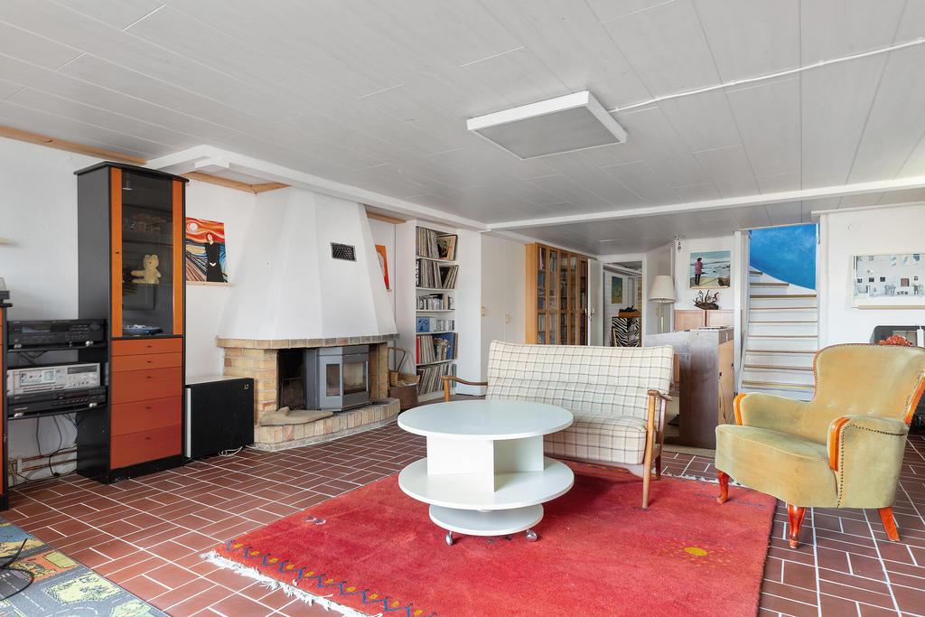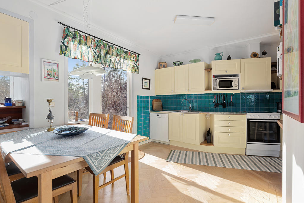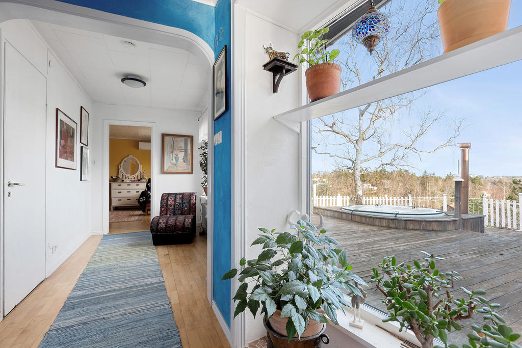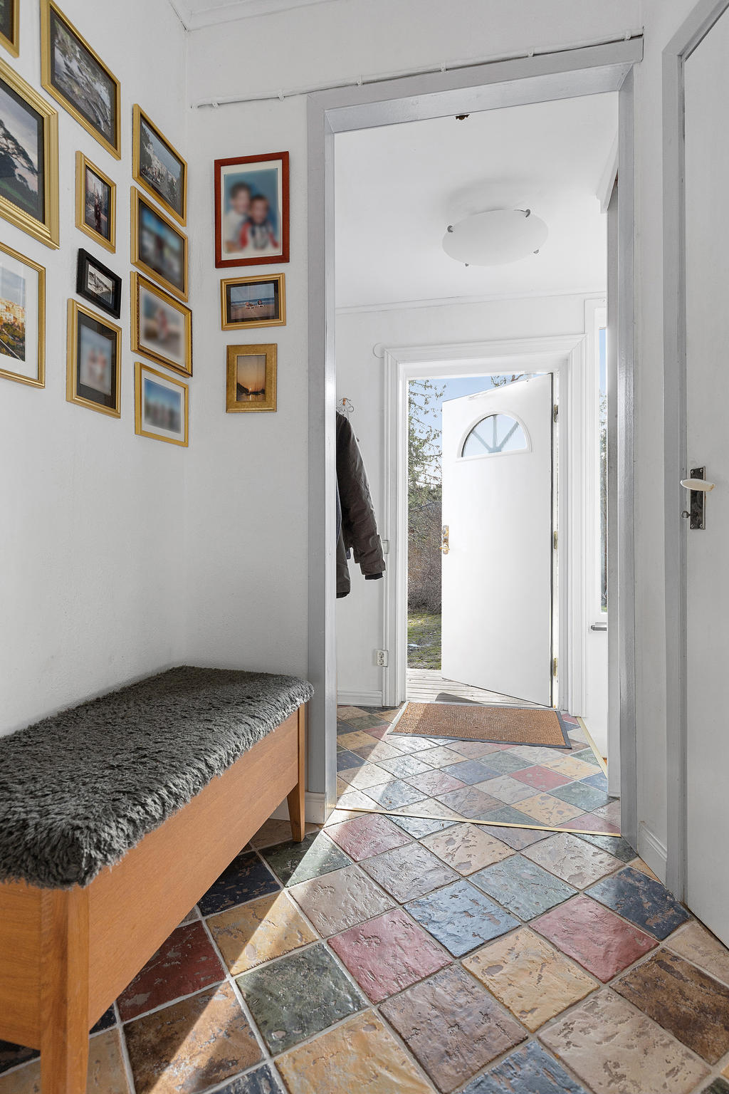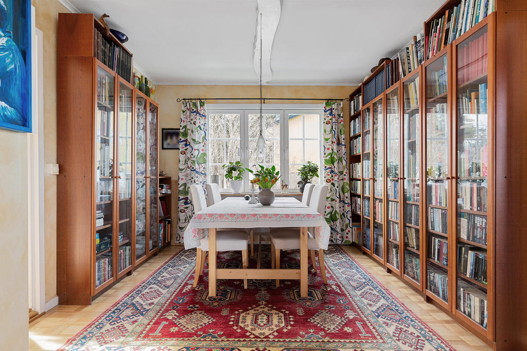 Hjärtat i 30-talsdelen är det generösa vardagsrummet. Här möts man av den klassiska fiskbensparketten och en sprakande braskamin som skapar en genuin atmosfär under vinterhalvåret. Det är också härifrån man blickar ut över omgivningarna genom stora fönsterpartier som bjuder på en panoramavy. I husets 60-talsdel är den tidstypiska holländska parketten bevarad och här finns de karaktärsfulla vikdörrarna kvar som kan skilja av matdelen.
