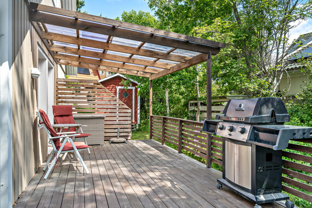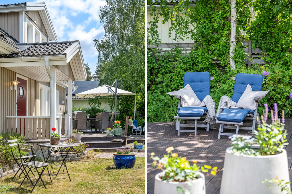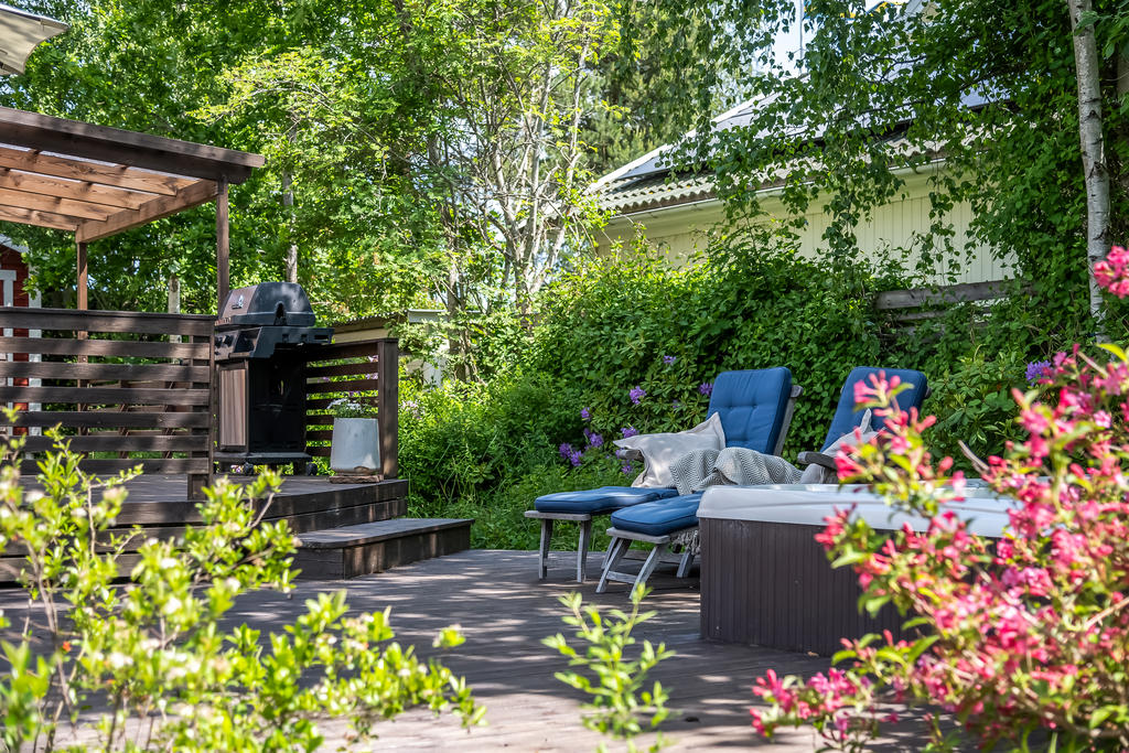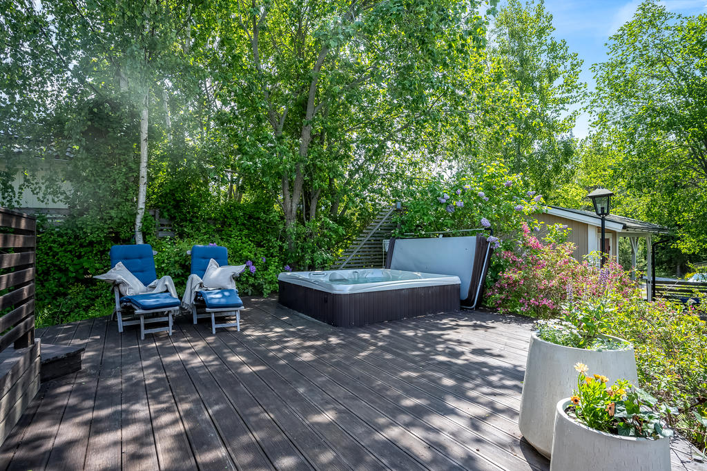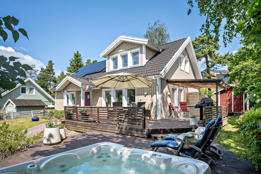 Huset erbjuder även en väl tilltagen altan med inbyggd belysning samt spabad, perfekt för mysiga vinterkvällar.