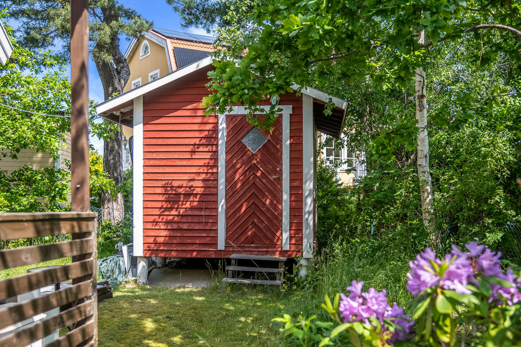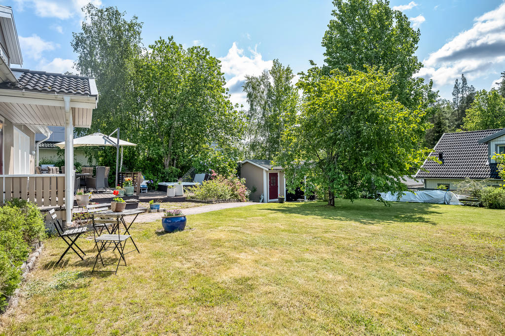 Trädgården är lättskött och i stort sett insynsskyddad, med plana gräsytor som lämpar sig för både lek, trädgårdsprojekt eller kanske ett växthus. Möjligheterna är många för dig med gröna fingrar – eller för dig som bara vill njuta av grönskan.