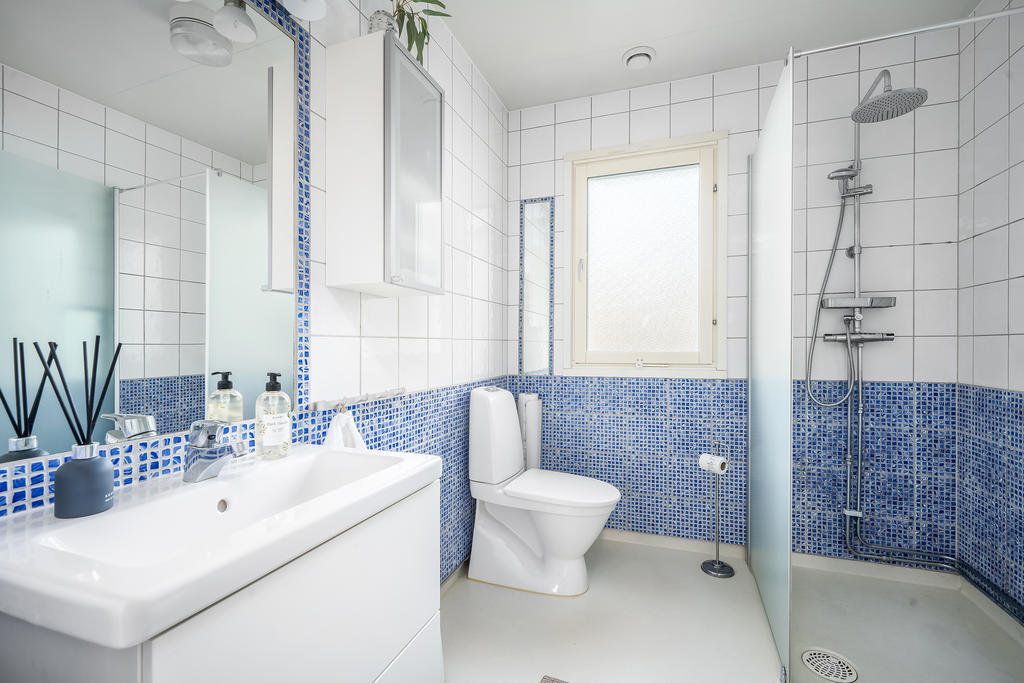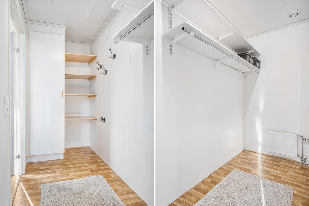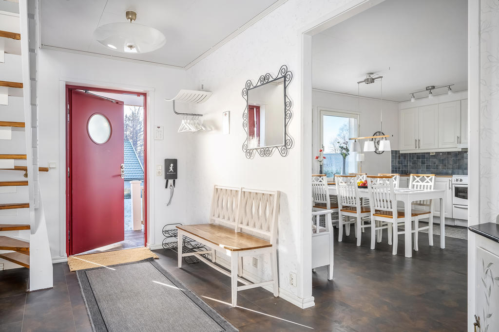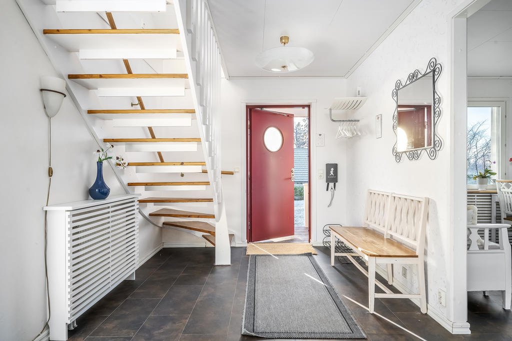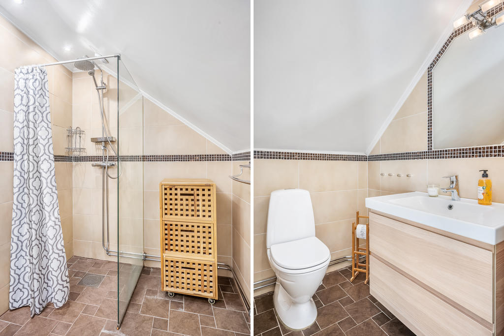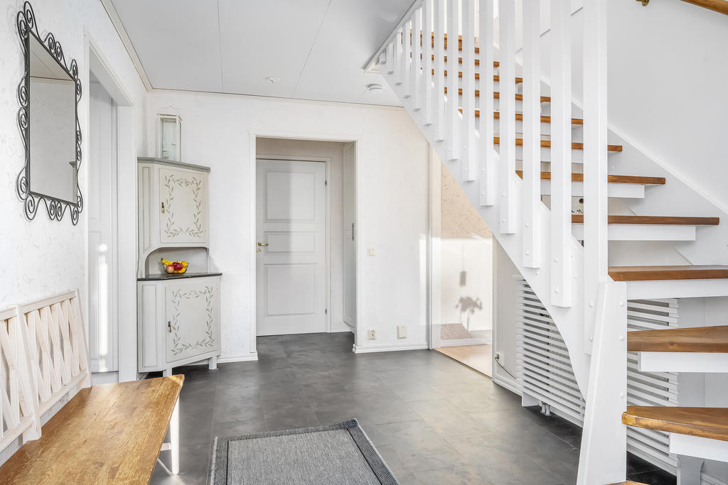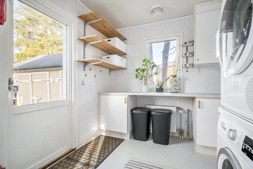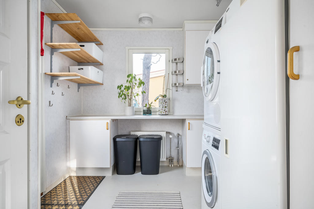 Via köket når du den praktiska tvättstugan med groventré. På entréplan finns även ett badrum med golvvärme och duschkabin.