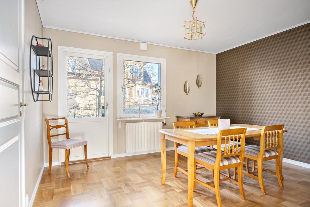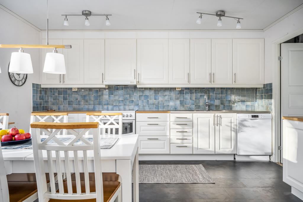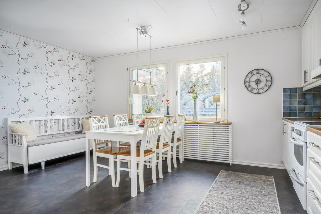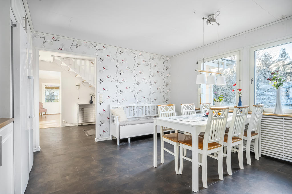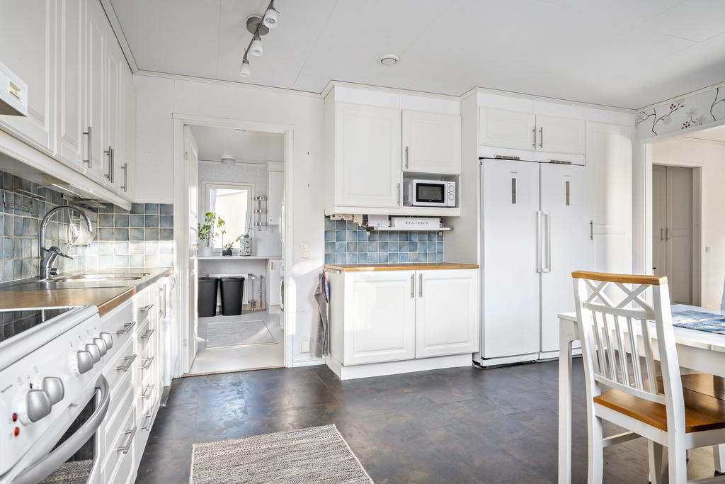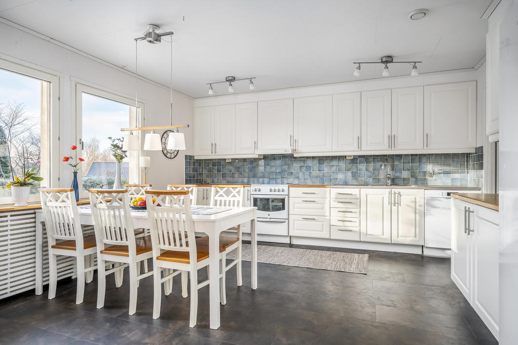 Det rymliga köket går i ljusa toner och erbjuder generöst med förvaring samt stora arbetsytor. Här finns allt du behöver för matlagning och vardagsliv. Intill de stora fönstren finns plats för ett rejält matbord, perfekt för både vardagsmiddagar och festliga tillställningar.