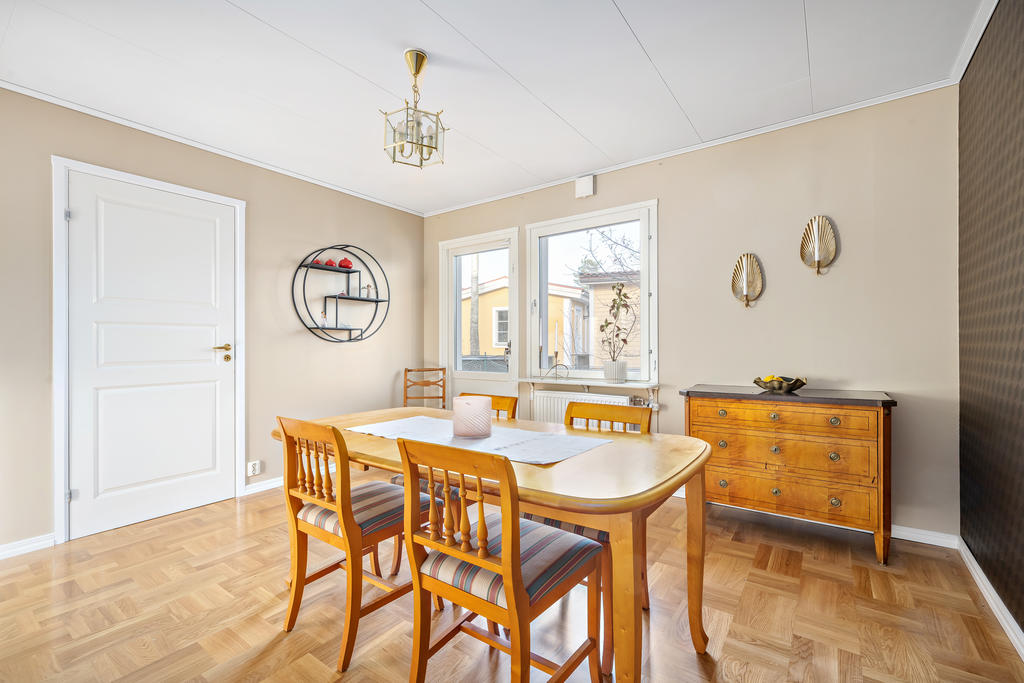 Vardagsrummet är öppet och socialt, med plats för både soffgrupp och underhållningsutrustning. Intill ligger en härlig matsal som rymmer både stora och små sällskap. I original utförande är detta ett sovrum och för den som önskar går det självklart att återställa.