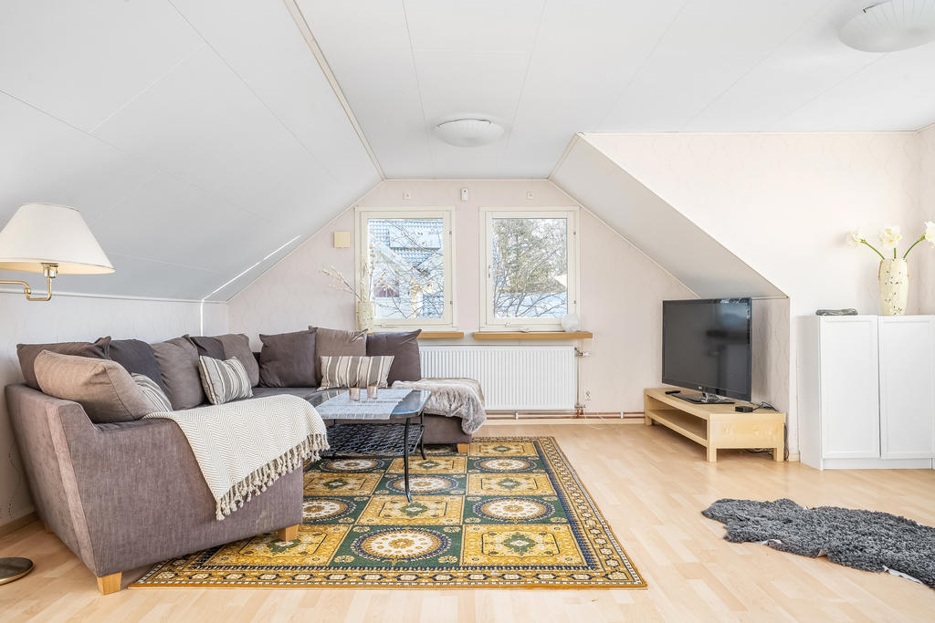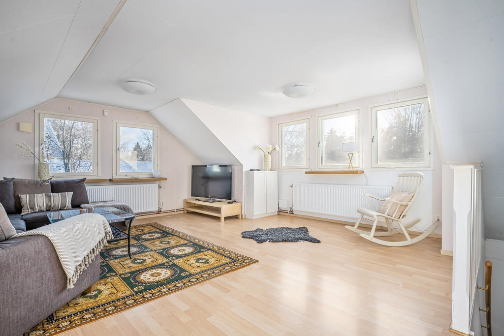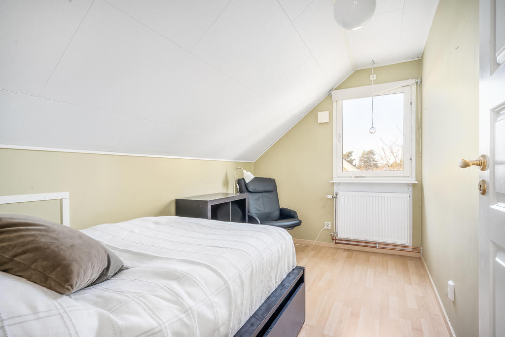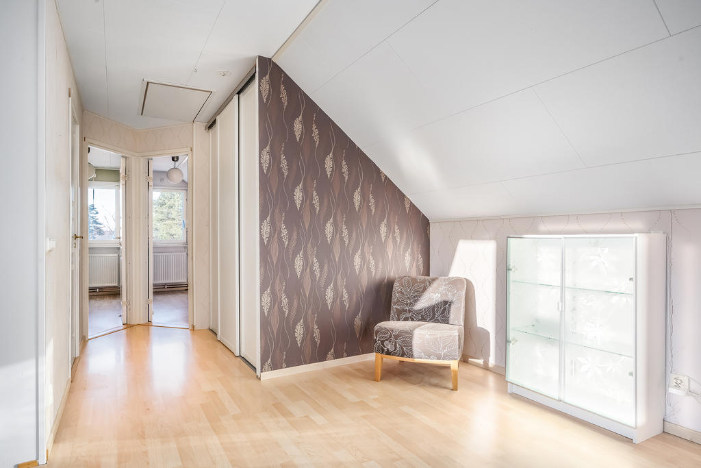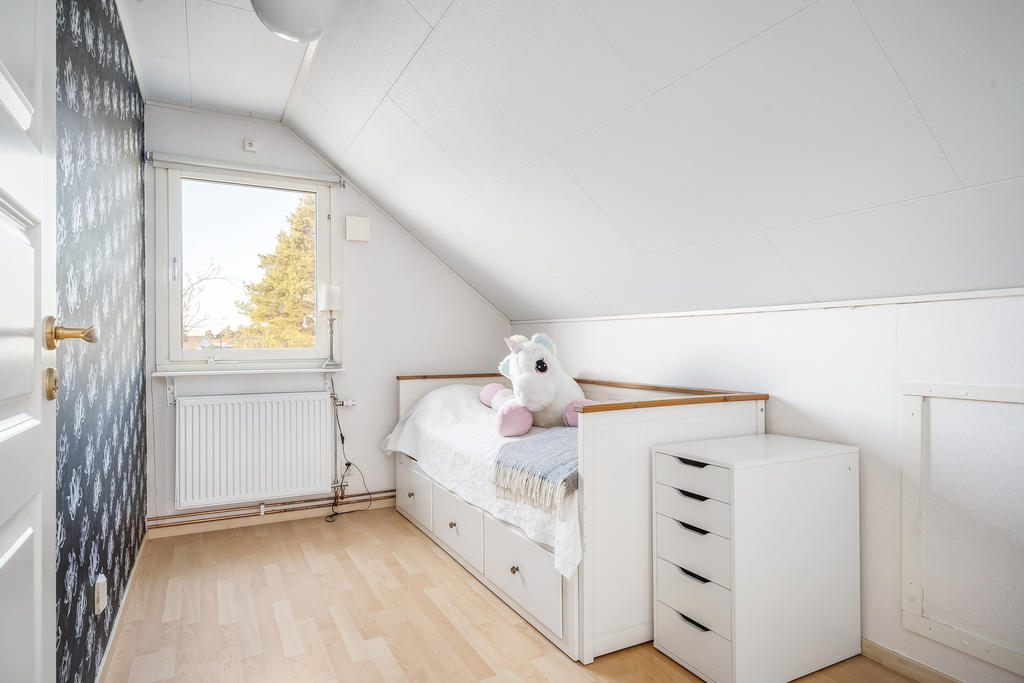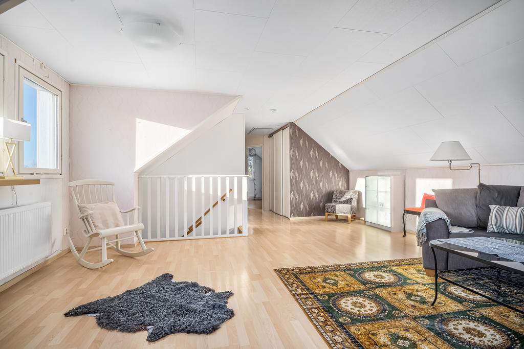 På övre plan finner ni idag två sovrum, ett helkaklat badrum med golvvärme och dusch samt en platsbyggd garderob med skjutdörrar. Vidare på övre plan finner ni ett stort allrum med burspråk som passar perfekt som ett andra allrum/tv-rum/ lekyta för barnen och deras vänner. Här ges plats för både gäster och många vänner att övernatta. En perfekt fördelning där barnen får en egen våning medan de vuxna har hela entréplan att utnyttja. För den som önskar går det att skapa ytterligare sovrum. Se alternativ planritning.