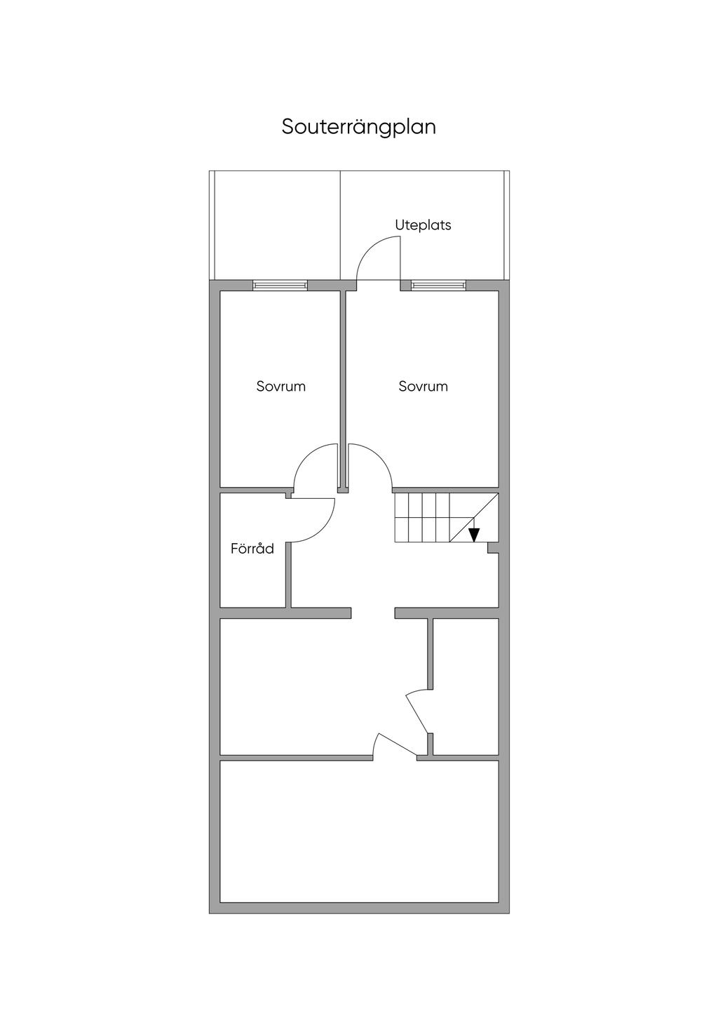 På nedre plan har bostaden anpassats för att skapa ytterligare funktionella ytor. Här finns ett gästrum eller kontor samt ett större förråd. I den andra delen finns två sovrum, varav ett har direkt utgång till husets baksida och den privata altanen. Altanen ligger i ett skyddat och ostört läge och blir en naturlig plats för sommarens middagar, avkoppling och umgänge. Här finns även ett extra förråd för praktisk förvaring.