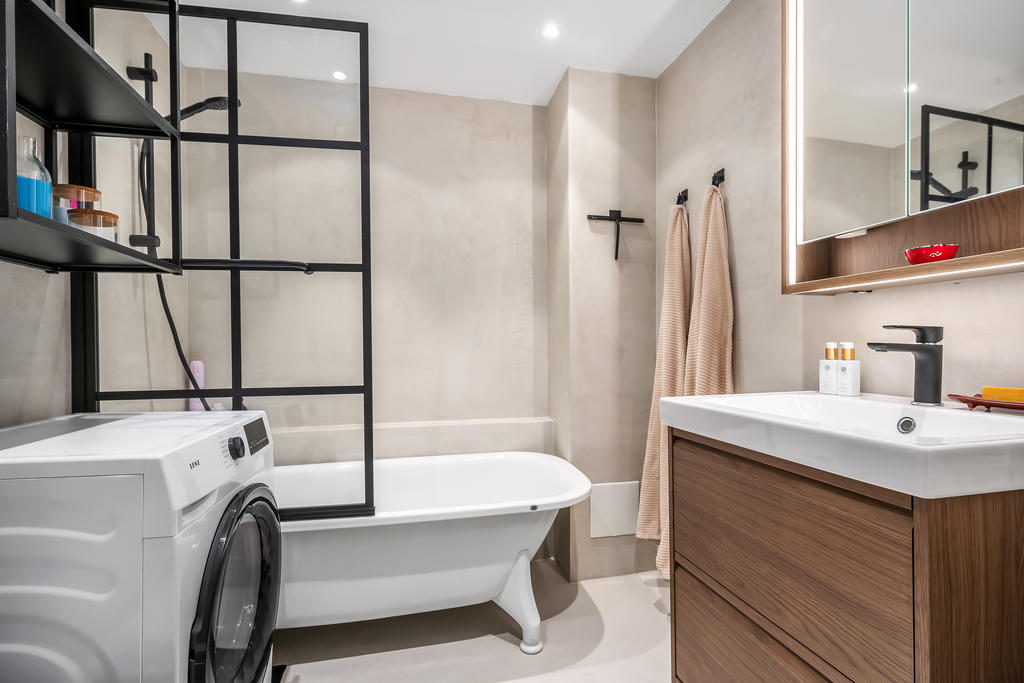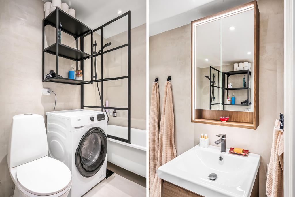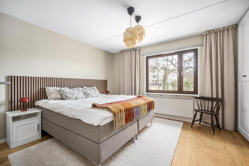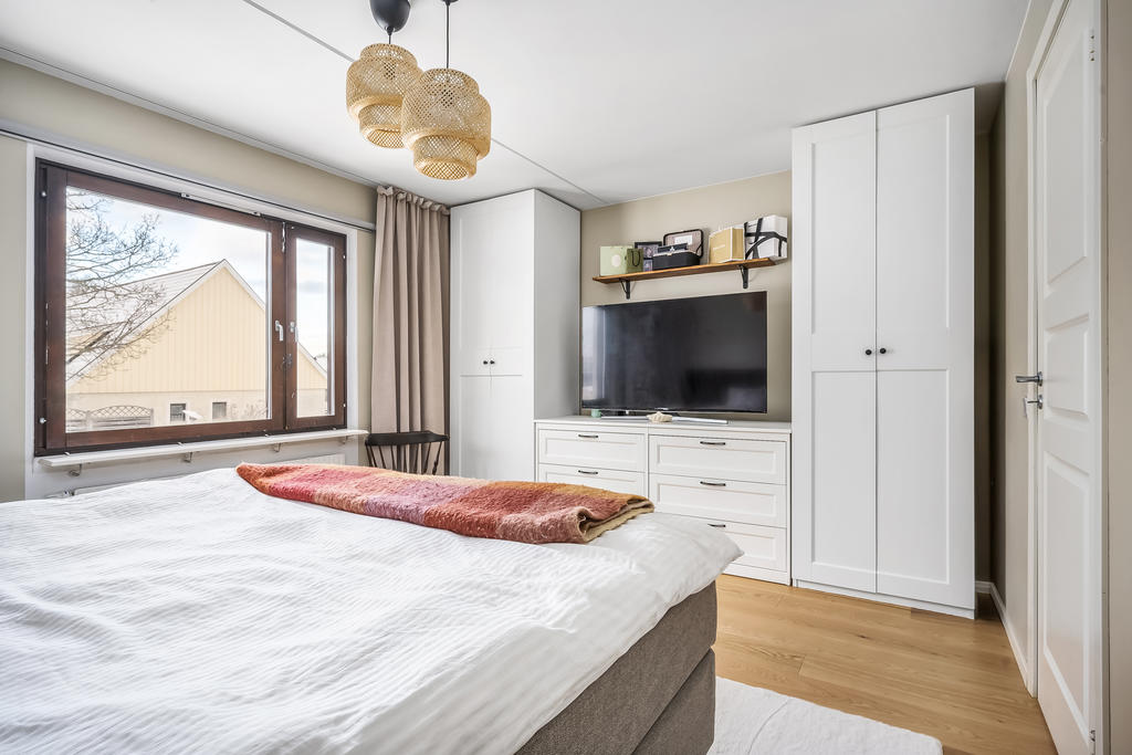 Här finns två rymliga sovrum med gott om förvaring i klädkammare och garderober samt fin utsikt över området. Det stilrena badrummet är utrustat med badkar, tvättmaskin, wc, handfat och kommod.