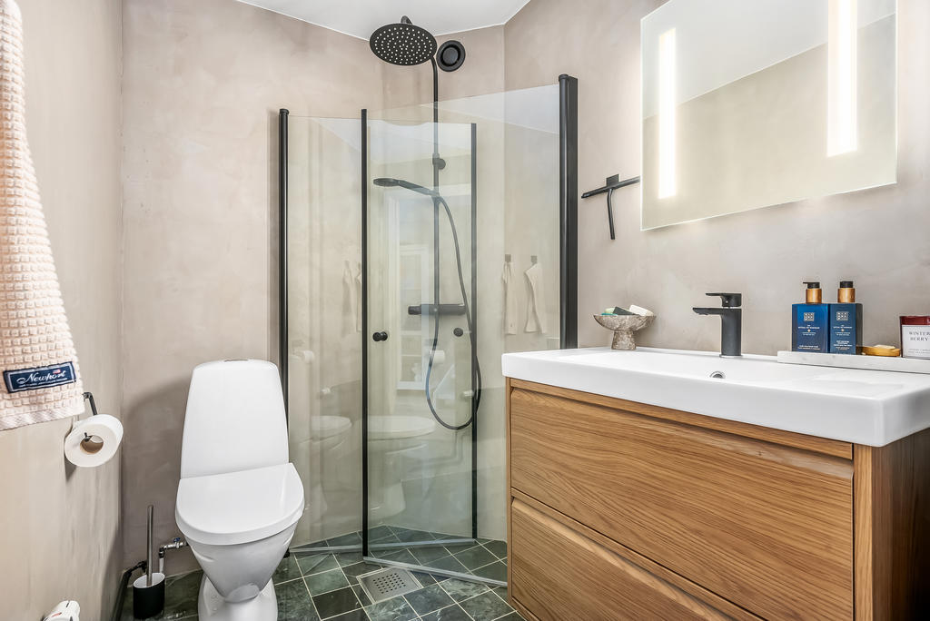 Redan i hallen möts ni av en välkomnande känsla med gott om plats för avhängning. Härifrån öppnar bostaden upp sig med en luftig och modern atmosfär. Köket är inrett i smakfulla nyanser med gott om förvaring, snyggt kakel och integrerade rostfria vitvaror. Härlig köksö centralt placerad i hjärtat av bostaden. Vid det stora fönsterpartiet finns en naturlig plats för matbord med härlig utsikt mot den trallbelagda framsidan. Från köket fortsätter hemmet in i det sociala vardagsrummet med utgång till en solig altan – perfekt för grillkvällar och sommarhäng. På entréplanet finns även ett smakfullt inrett badrum med härlig hotellkänsla utrustat med dusch, wc, handfat, spegel och kommod.