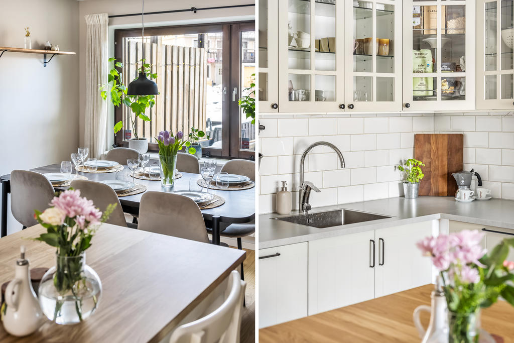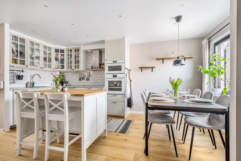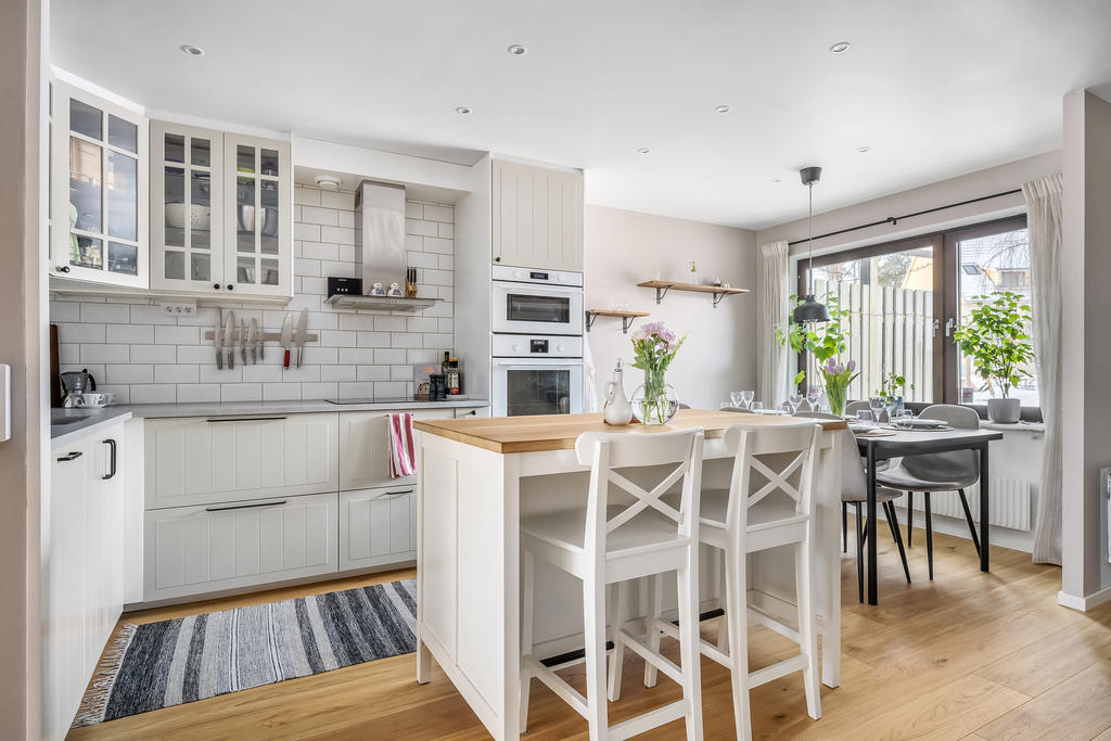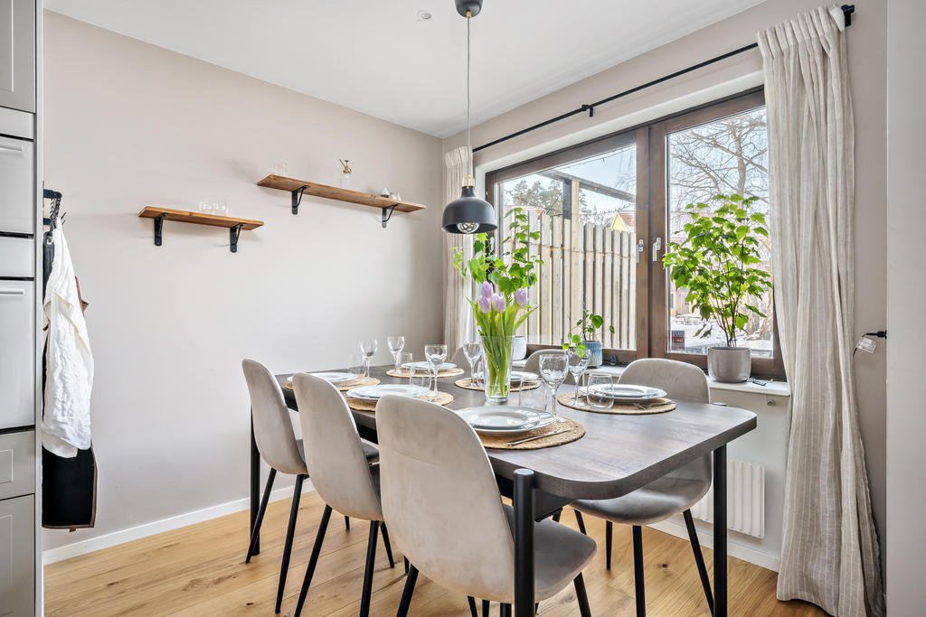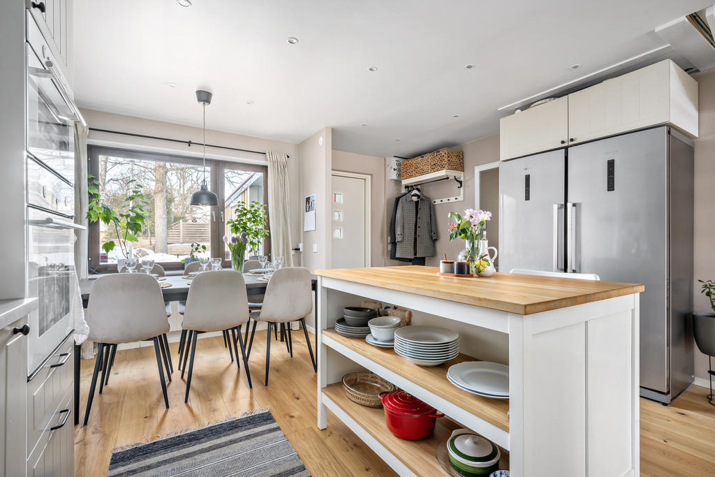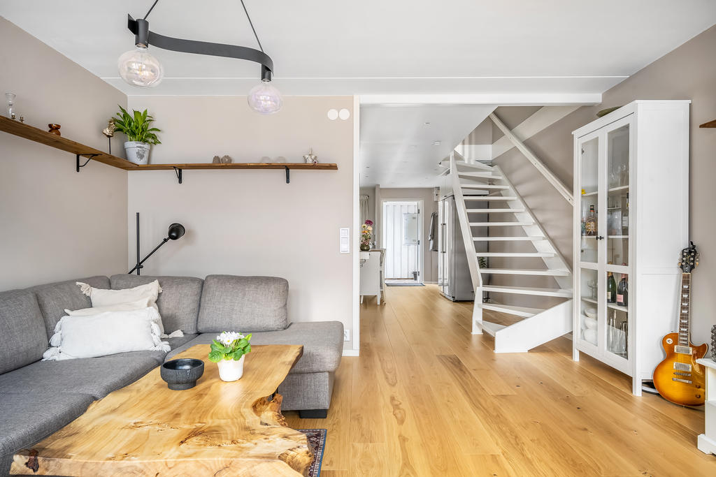 Bostaden är i genomgående mycket fint skick och fördelad på två plan, där varje kvadratmeter är smart utnyttjad. Planlösningen skapar ett härligt flöde mellan kök och vardagsrum – perfekt för både vardagsmys och sociala tillställningar. Här ryms allt från stora middagar med vänner till avkopplande hemmakvällar med familjen. Inne och ute binds samman på ett naturligt sätt, med två generösa uteplatser som gör hemmet lika njutbart året runt.