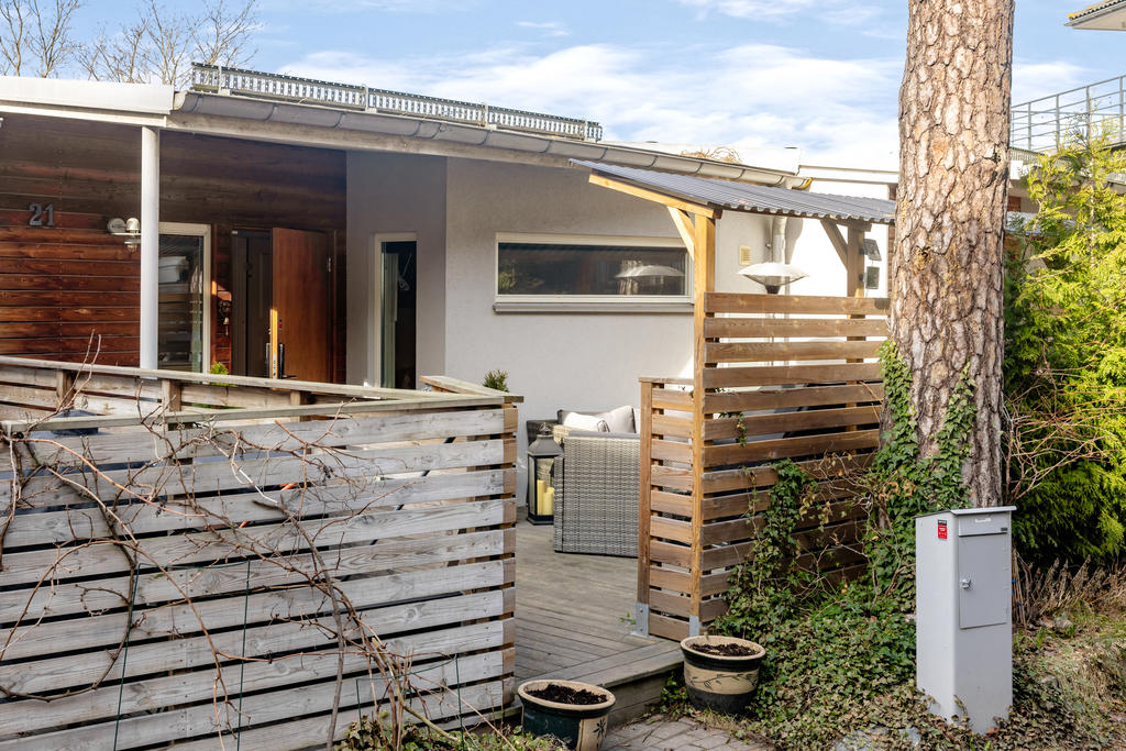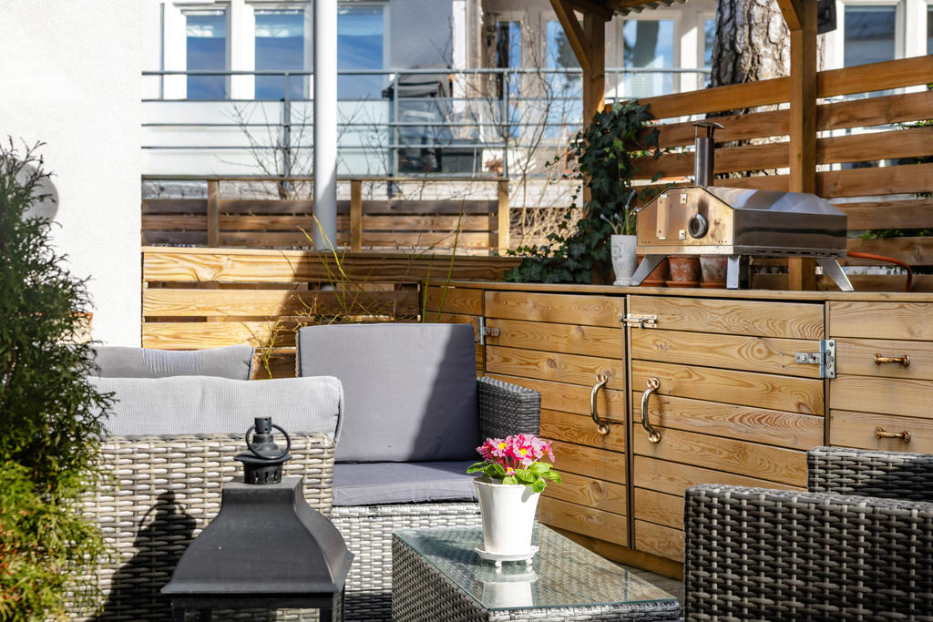 I anslutning till entrén har man byggt en altan där man kan njuta av frukosten i morgonsolen.
