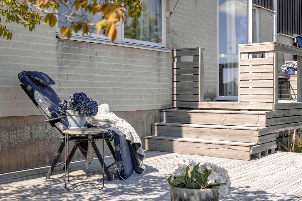 "Ett hem att älska året om – där varje säsong bjuder på nya upplevelser. Sommaren är den mest magiska tiden här. Innergården blir en grönskande oas där du kan njuta av soliga dagar, blommande planteringar och ljumma kvällar på altanen. Tack vare det skyddande taket kan du sitta ute även när sommarregnet smattrar mjukt mot taket – en plats att koppla av, äta långa middagar och umgås. Hösten förvandlar omgivningen till ett färgsprakande konstverk. Naturen runt omkring inbjuder till långa promenader bland guldfärgade löv, och hemma kan du tända ljus, kura ihop dig i ateljén eller njuta av en varm kopp te på altanen. Vintern bjuder på en helt annan, men lika magisk, upplevelse. Sätt dig i soffan framför den sprakande braskaminen i vardagsrummet, medan snön gnistrar utanför de stora fönsterpartierna. Den magiska utsikten över Saltsjöbaden blir sagolik som ett vinterland. Här finns en harmoni som gör vintern till en tid att verkligen uppskatta. Snötäcket på innergården glittrar och ljusslingor lyser vackert igenom snön längs taket som går över altanen. Våren är den tid då allt vaknar till liv igen. Trädgården fylls av de första knopparna, och du kan återigen börja njuta av livet utomhus. Ljuset flödar in genom de stora fönstren och ger huset en extra energi – precis som om det vaknar till liv tillsammans med naturen. Oavsett årstid är detta ett hem som bjuder in till livskvalitet och njutning. Här får du en bostad där du kan känna dig hemma året om – med varje säsong som en ny anledning att älska platsen ännu mer."