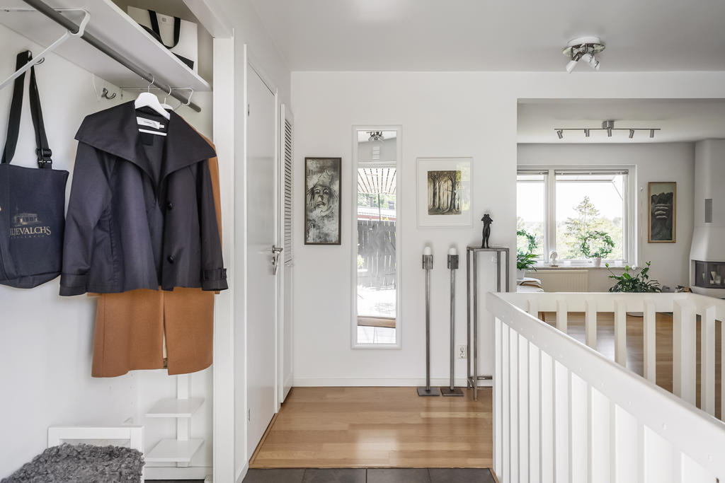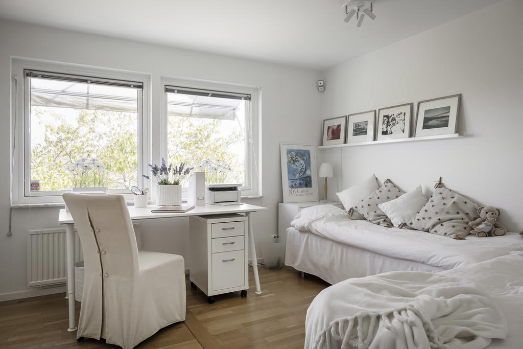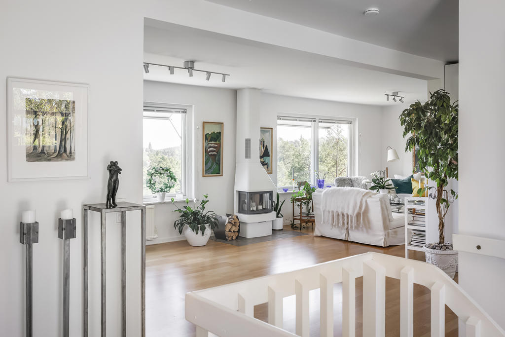 Invändigt möts du av en ljus och luftig atmosfär, där den moderna stilen med genomgående vita ytskikt skapar en tidlös och stilren känsla. Huset är fördelat på två plan och erbjuder gott om utrymme för den stora familjen, men fungerar lika väl som ett rymligt och bekvämt boende för den som vill njuta av lugnet efter pensionen. Planlösningen är smart och flexibel, med generösa sällskapsytor där vardagsrummet badar i ljus tack vare de stora fönsterpartierna. Härifrån har du dessutom en helt unik utsikt över området – en vy som bara detta hus kan erbjuda tack vare dess optimala placering. De öppna ytorna skapar en naturlig samlingspunkt för både vardag och fest. Sovrummen är rymliga och inbjudande, med enkla möjligheter att sätta egen prägel och skapa en personlig touch. Det finns många alternativ för att skapa flera sovrum om behovet finns, och med annan planlösning kan huset rymma upp till 4–5 sovrum. I samfällighetsavgiften ingår garageplats, och dessutom fri parkering på det stora övre parkeringsdäcket – en stor fördel för både boende och besökare. Här finns det alltid gott om lediga platser. Oavsett om du söker ett hem för familjelivets alla skeden eller en plats att njuta av livets lugnare dagar, erbjuder detta hus en unik kombination av modern komfort, naturnära charm och en svårslagen utsikt.