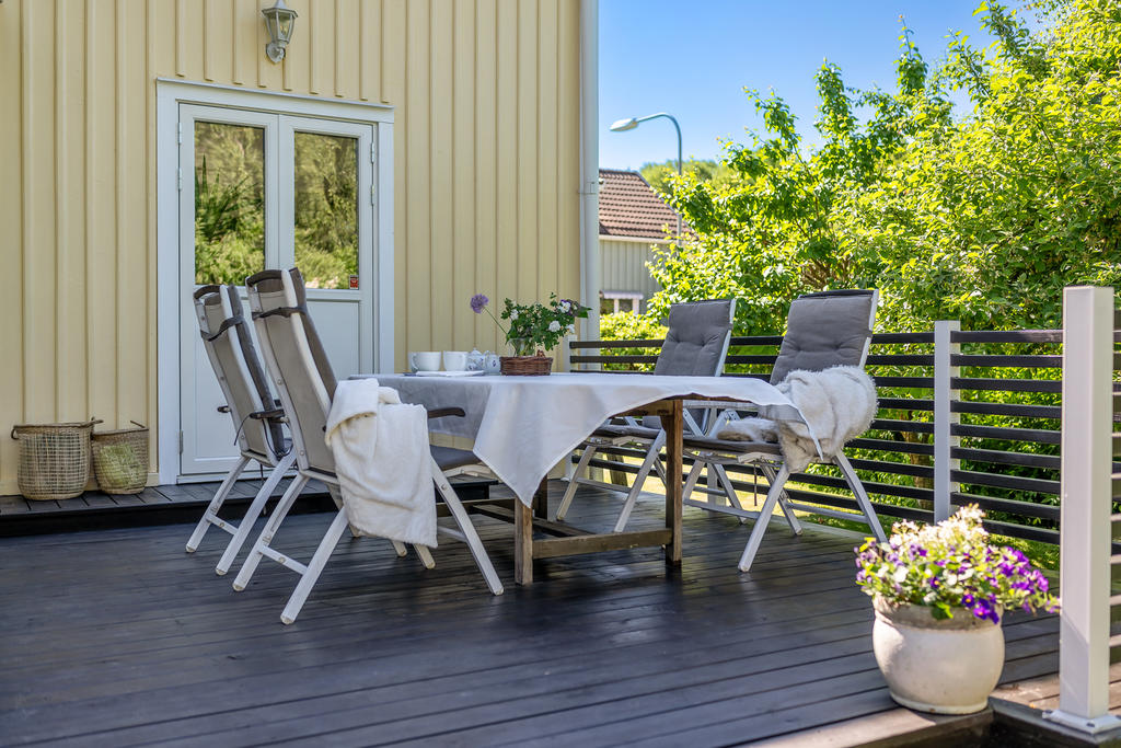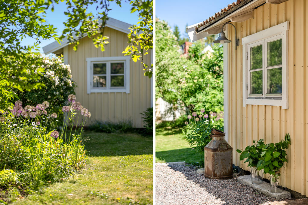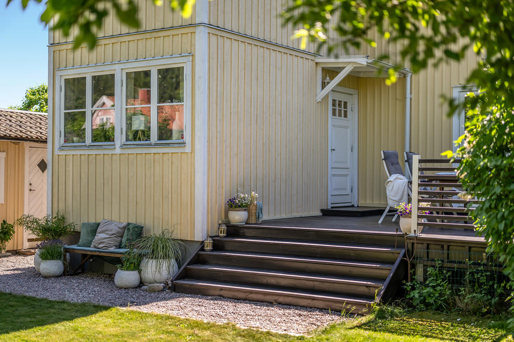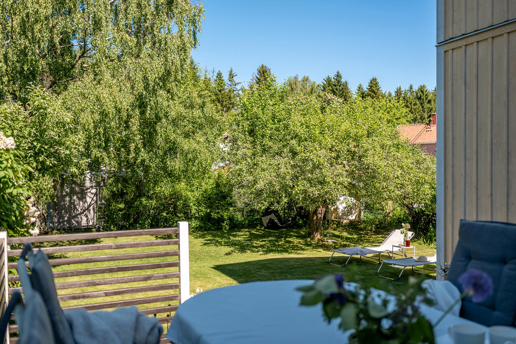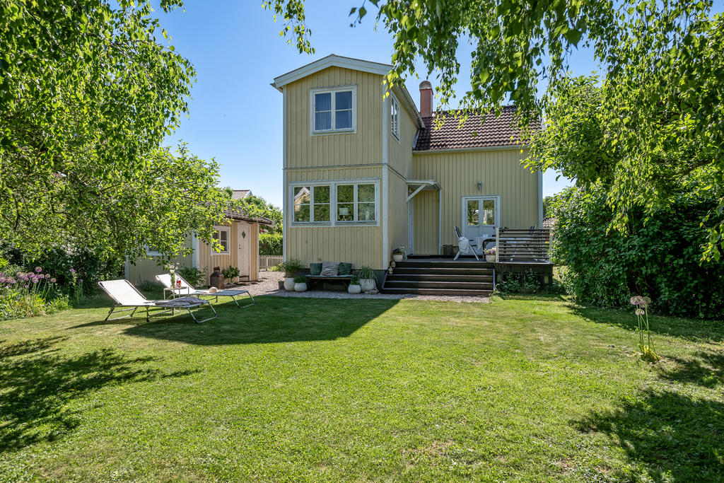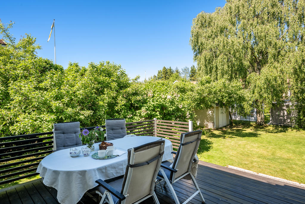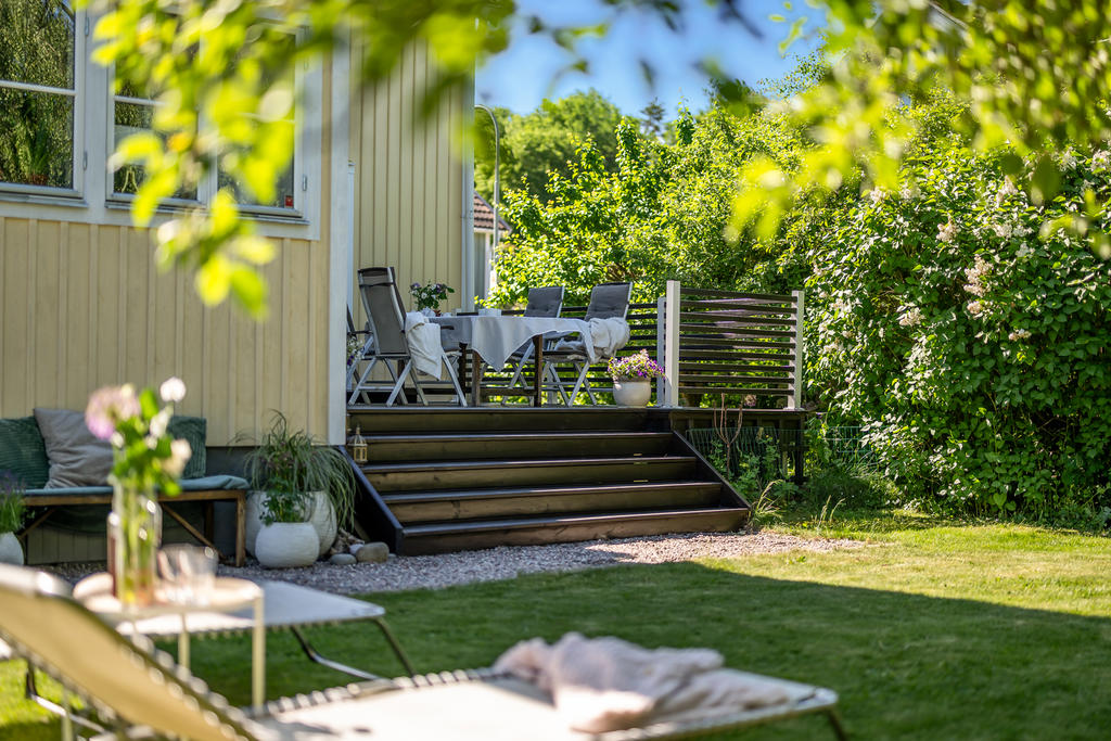 Trädgården är en uppvuxen och lummig oas med äppel- och plommonträd, blommande buskar och gott om plats för lek och spel. Här har kalas, studentfiranden och somriga middagar blivit fina minnen. Altanen fungerar som en självklar förlängning av huset med härlig kvällssol och ett insynsskydd som är som allra bäst när syrener och grönska står i full blom. Läget är lugnt och tryggt, utan genomfartstrafik – en plats där barn kan cykla och grannar hälsa.