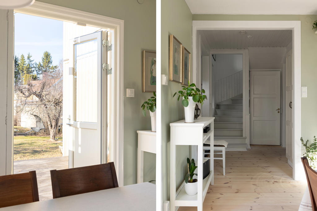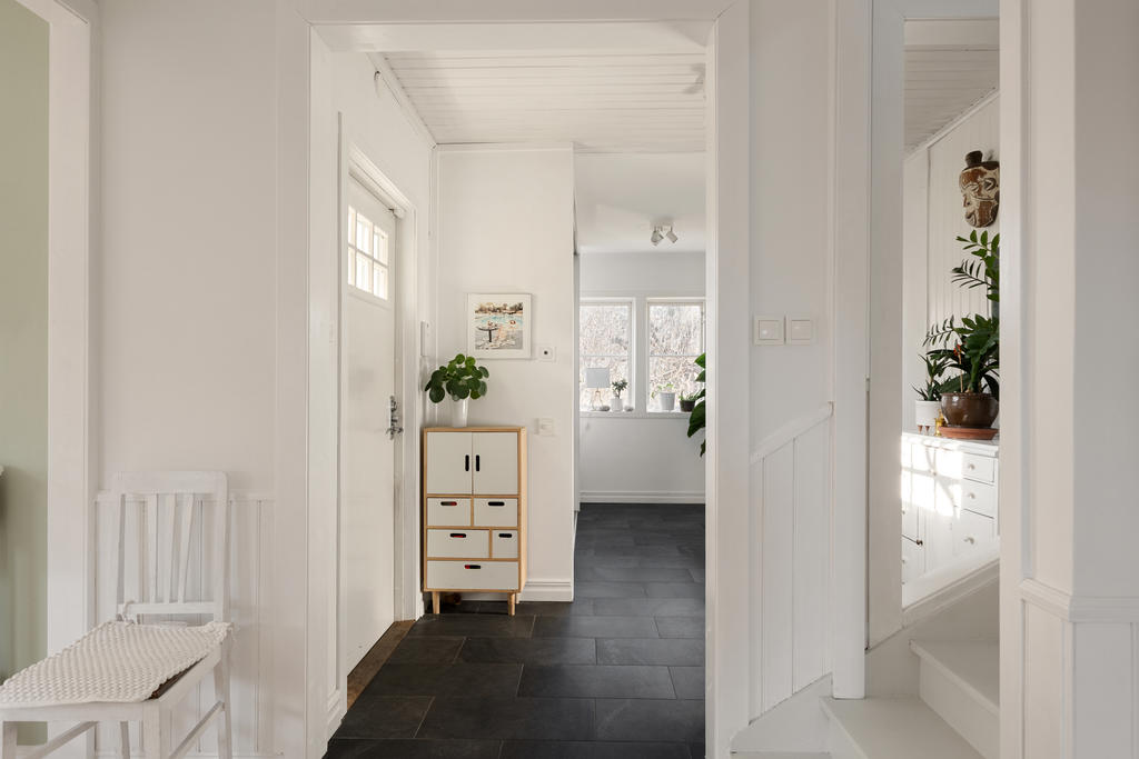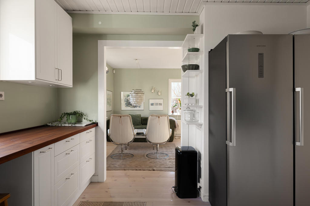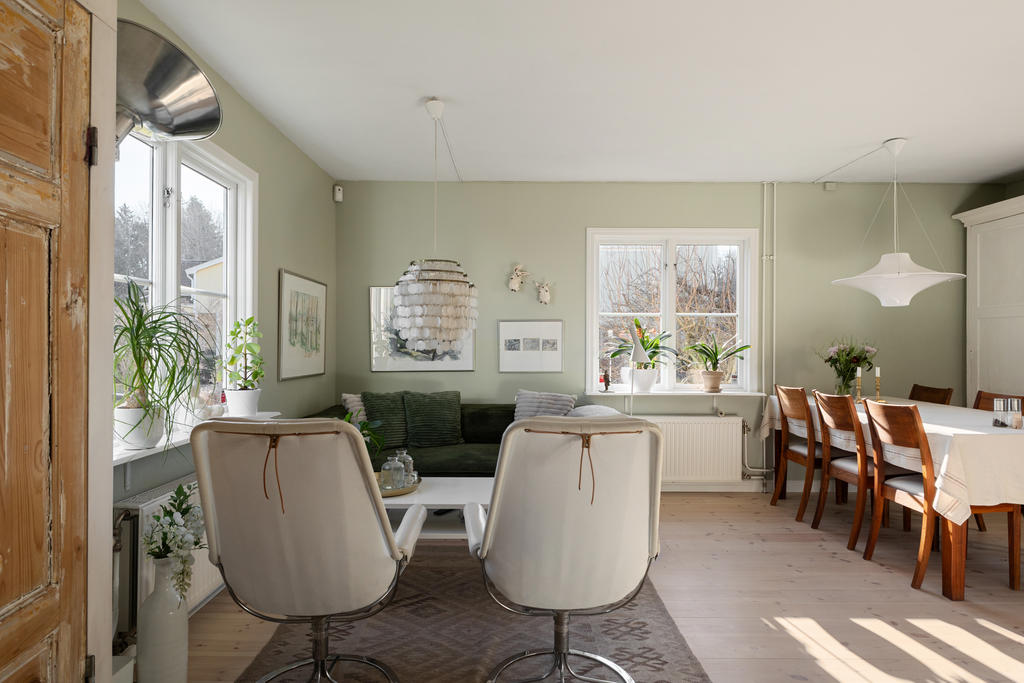 Huset är smakfullt tillbyggt och renoverat med omsorg, i en fin balans mellan det fräscha och moderna och de charmiga detaljer som ger karaktär. Den öppna planlösningen skapar en härlig rymd och kontakt mellan rummen – perfekt för familjeliv. Det generösa köket är hemmets naturliga samlingspunkt, med gott om plats för både matlagning och umgänge. Två renoverade badrum förenklar vardagen, och källarplanet med eget rum och badrum ger flexibilitet för gäster, tonåringar, hemmakontor eller när någon behöver lite extra lugn och ro.