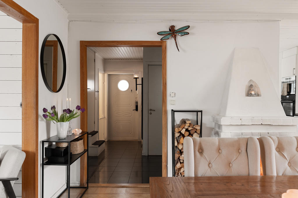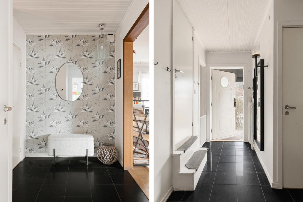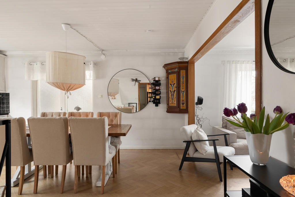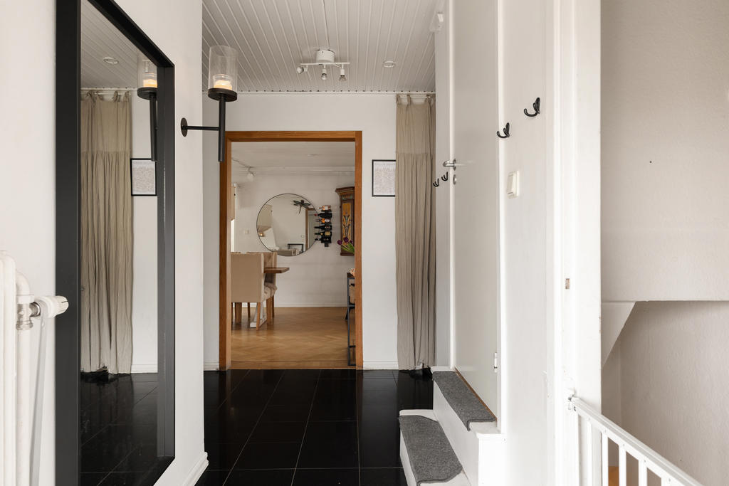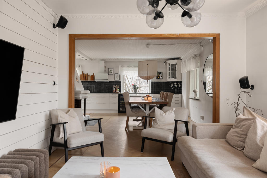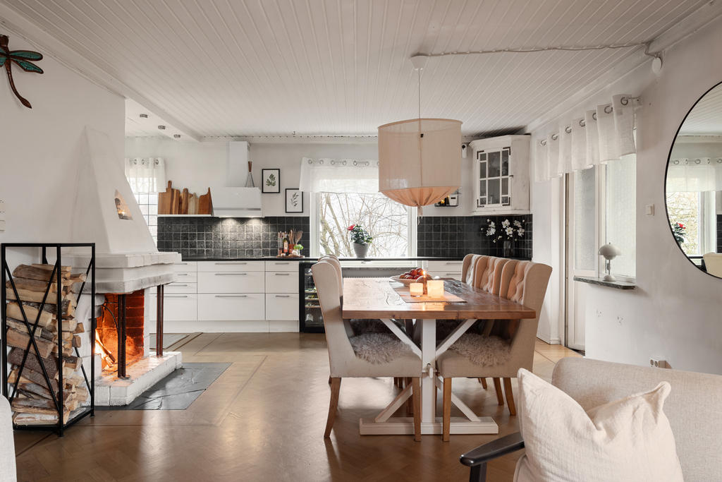 Huset är en klassisk 50-talsvilla med många bevarade kvaliteter, såsom vacker fiskbensparkett, öppen spis och generösa sällskapsytor. Entréplanet är hjärtat i hemmet där familj och vänner kan samlas. Här möts du av stora, luftiga rum och en öppen planlösning mellan kök och vardagsrum som skapar en social och inbjudande atmosfär. Den öppna spisen höjer mysstämningen på vinterhalvåret. Intill köket finns en rymlig matplats med gott om sittplatser – perfekt för stora middagar och festliga tillfällen.
