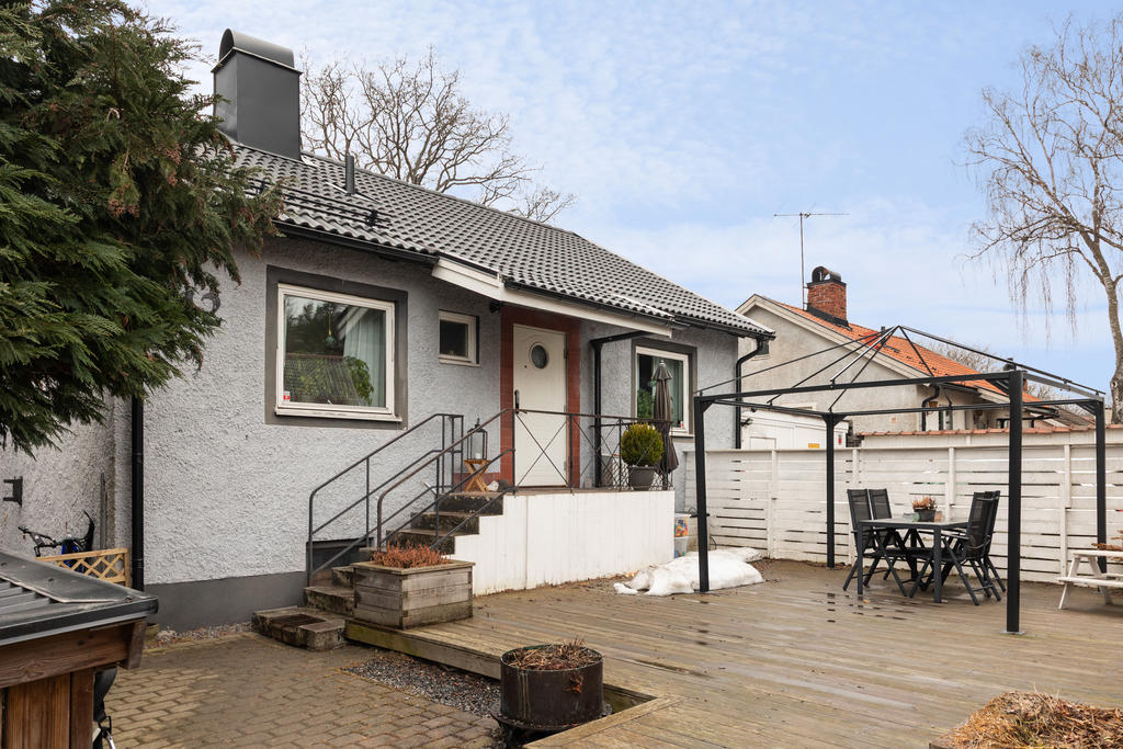 Stor insynsskyddad trädäckad altan på husets framsida samt stort trädäck på baksidan vilket ger fina möjligheter att kunna grilla och sola under sommarhalvåret. Insynsskyddad framsida.