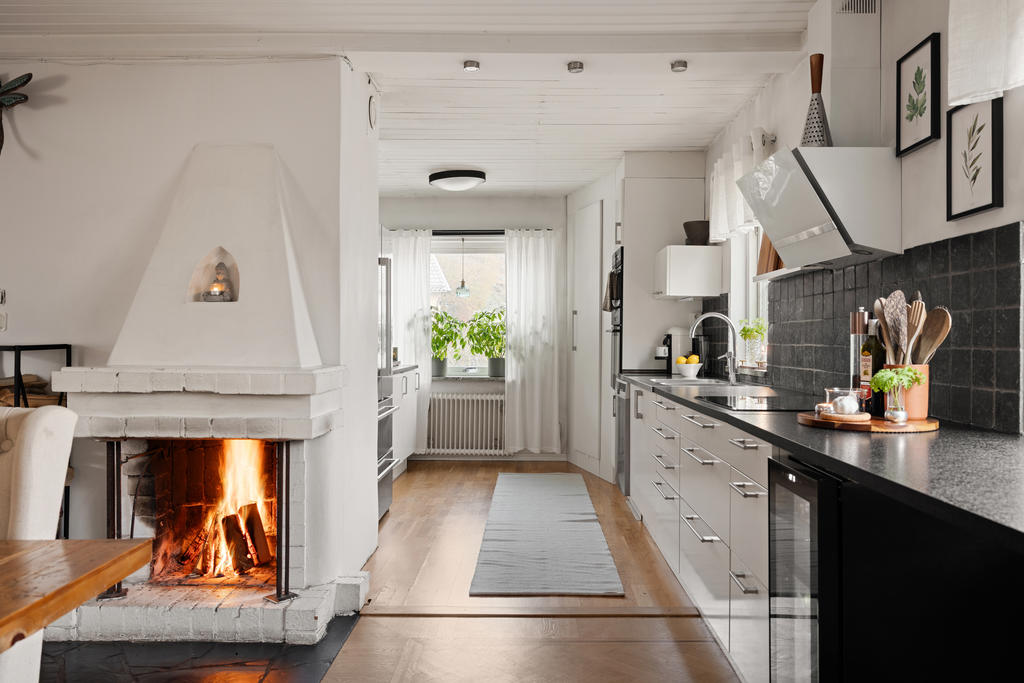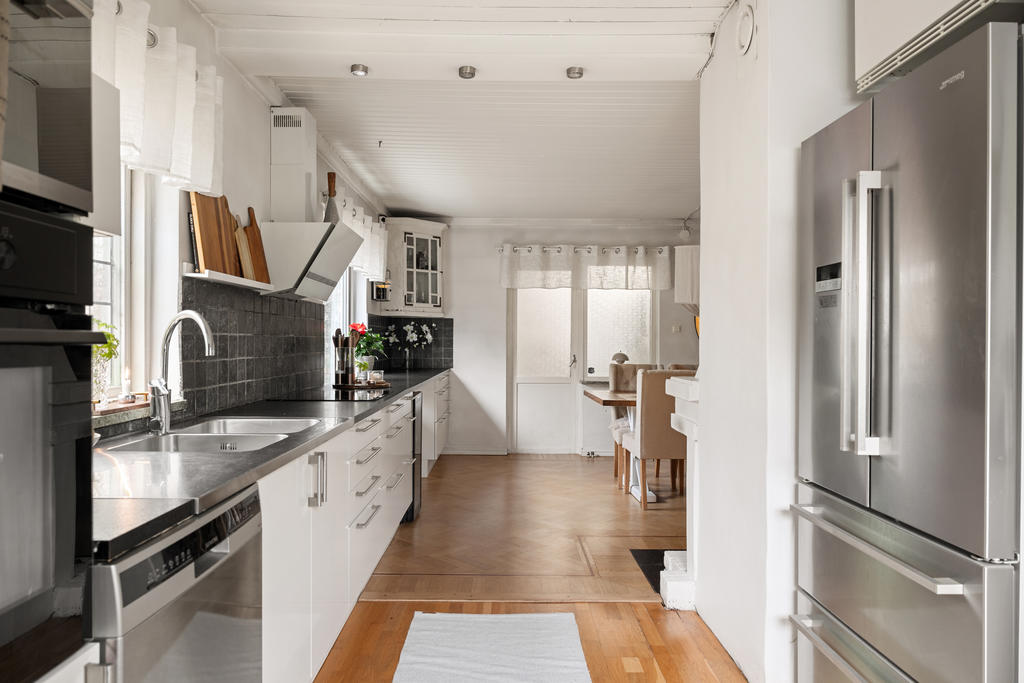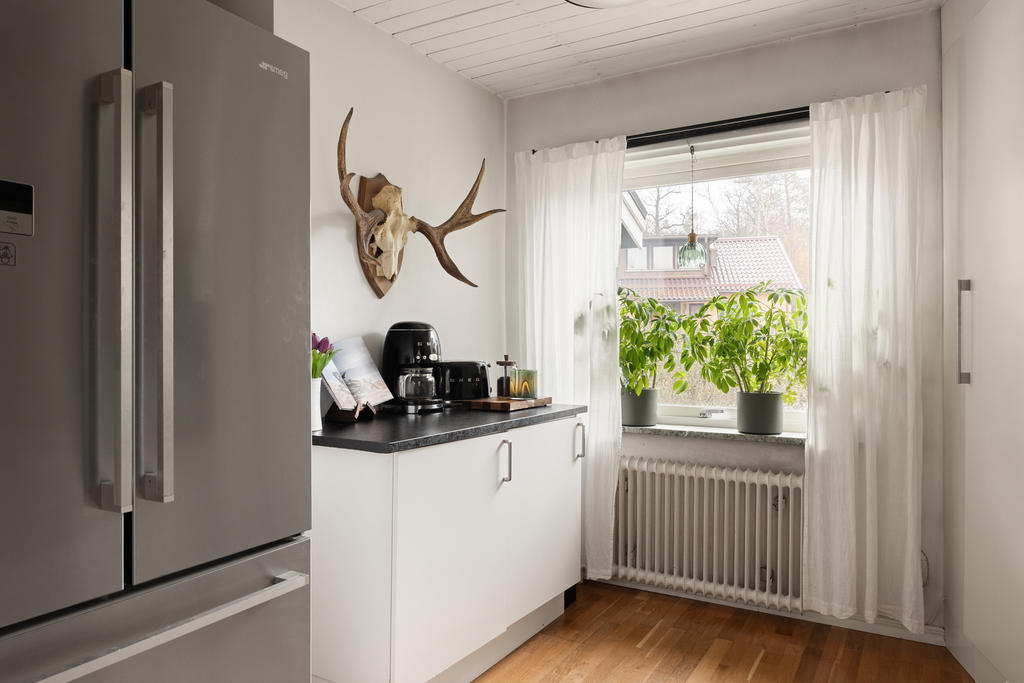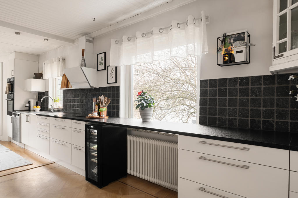 Köket är modernt och renoverat med gott om arbetsyta och generösa förvaringsmöjligheter, vilket gör det till en dröm för den matlagningsintresserade. Här finns även ett praktiskt skafferi som ger extra förvaring och funktion i vardagen. Flera fönster i olika väderstreck ger ett fint och naturligt ljusinsläpp genom hela entréplanet.