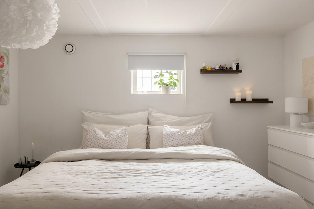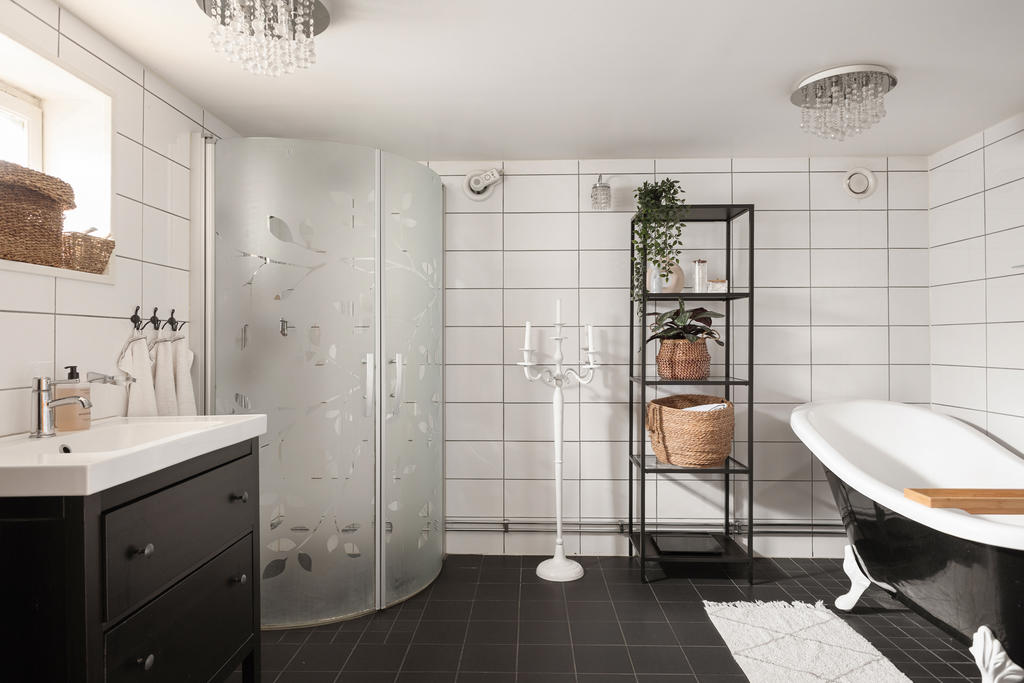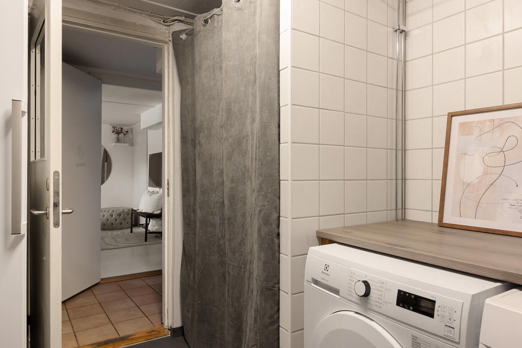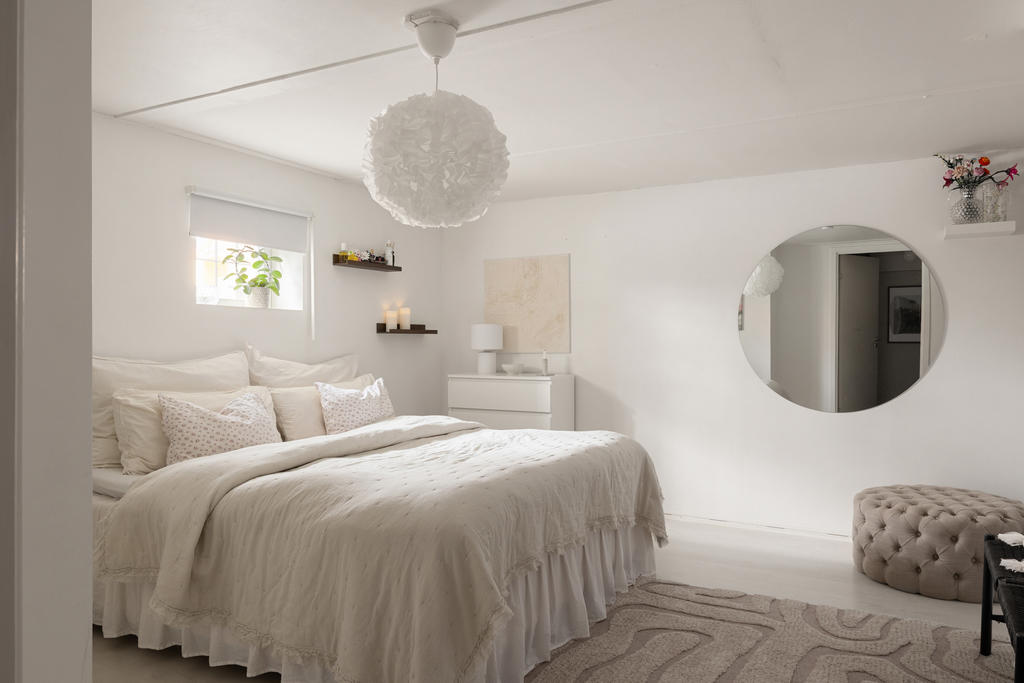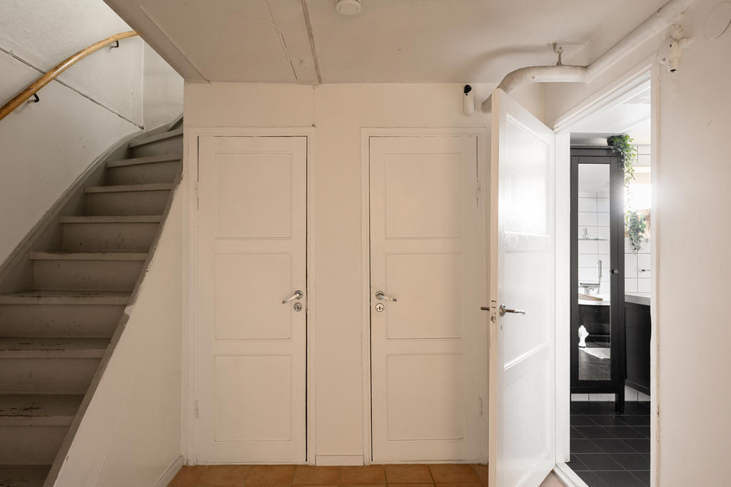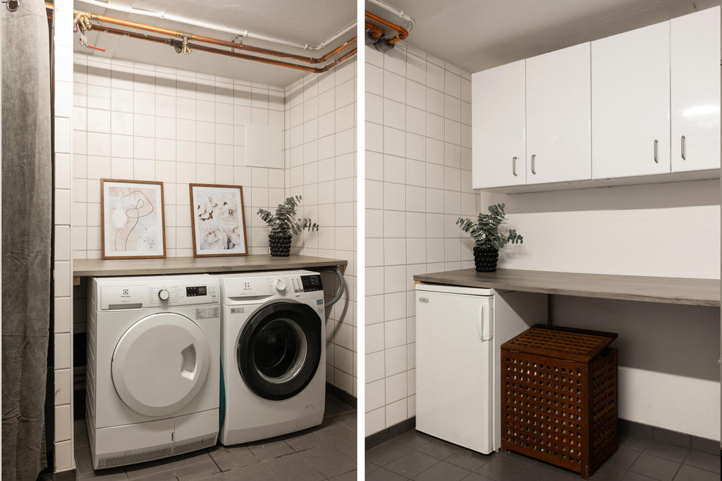 I källarplanet finns gott om extra utrymme. Här finns ett stort arbetsrum som även kan användas som gästrum eller hobbyrum samt ett rymligt, renoverat och ljust sovrum – perfekt som tonårsrum. Här finns också en praktisk tvättstuga samt med tvättmaskin och torktumlare samt en stor extra frys, smakfullt renoverat badrum som rymmer både badkar och dusch och har behaglig vattenburen golvvärme.
