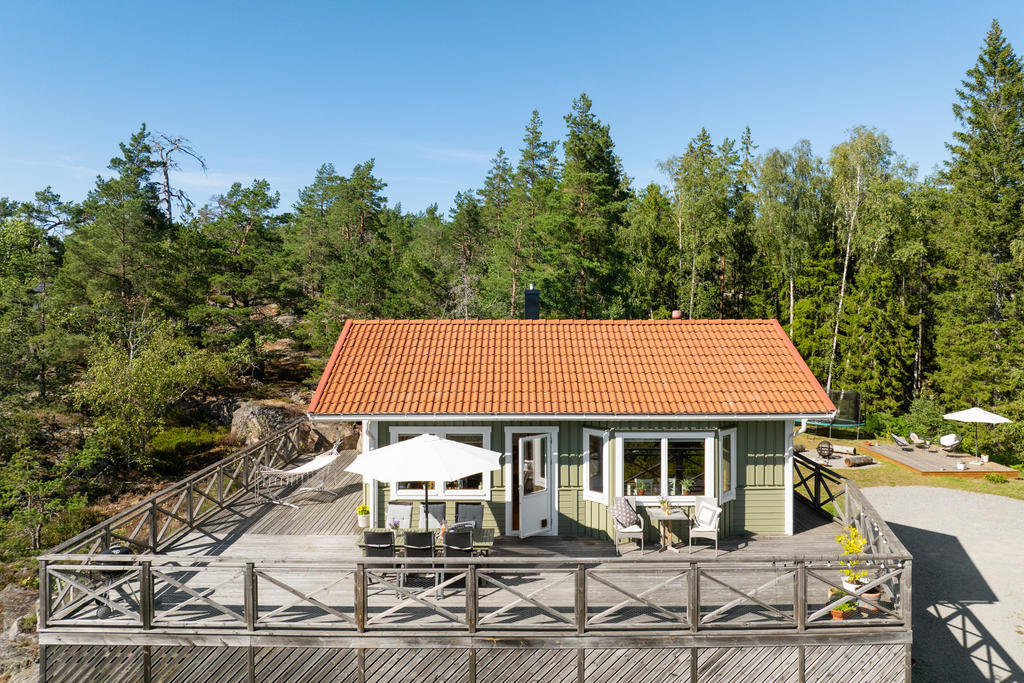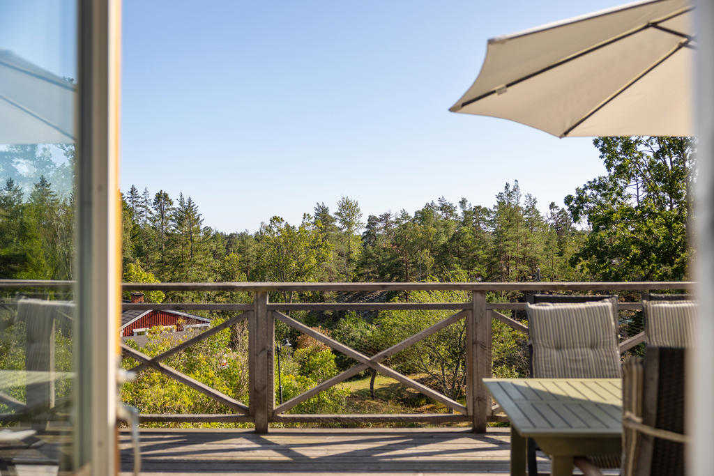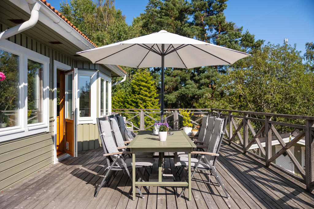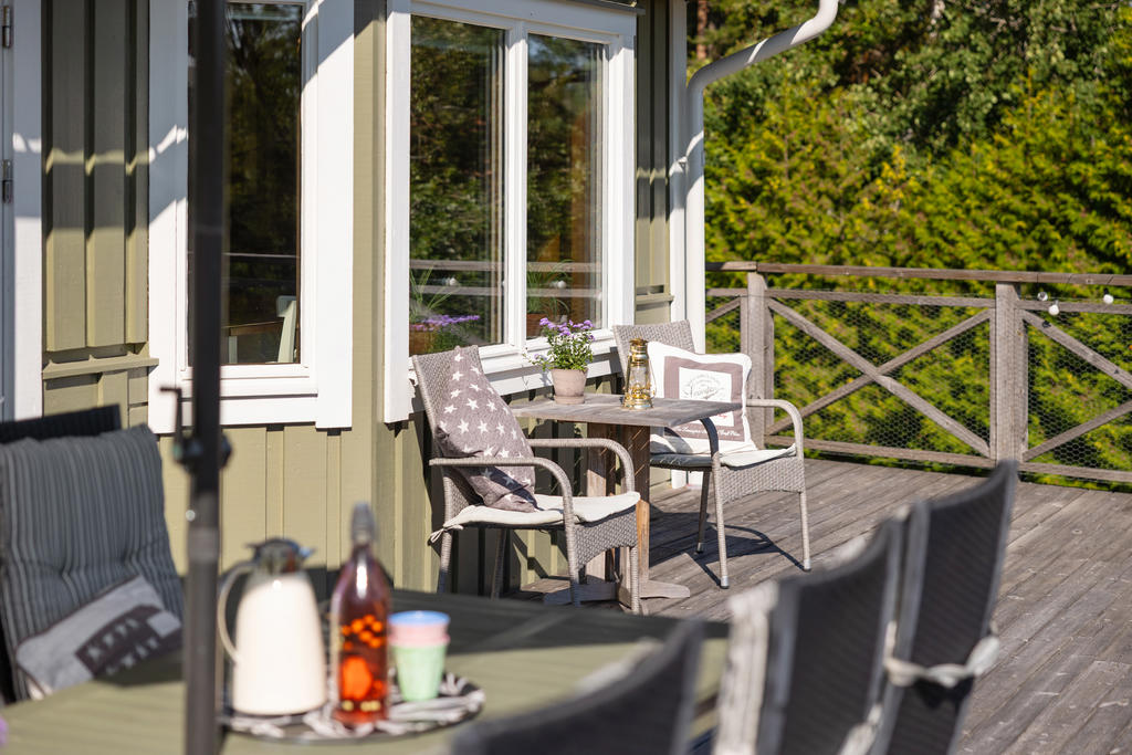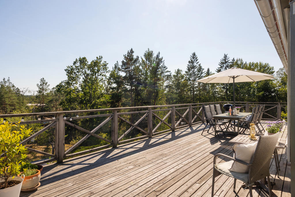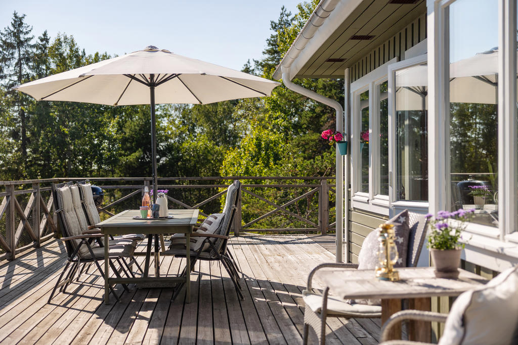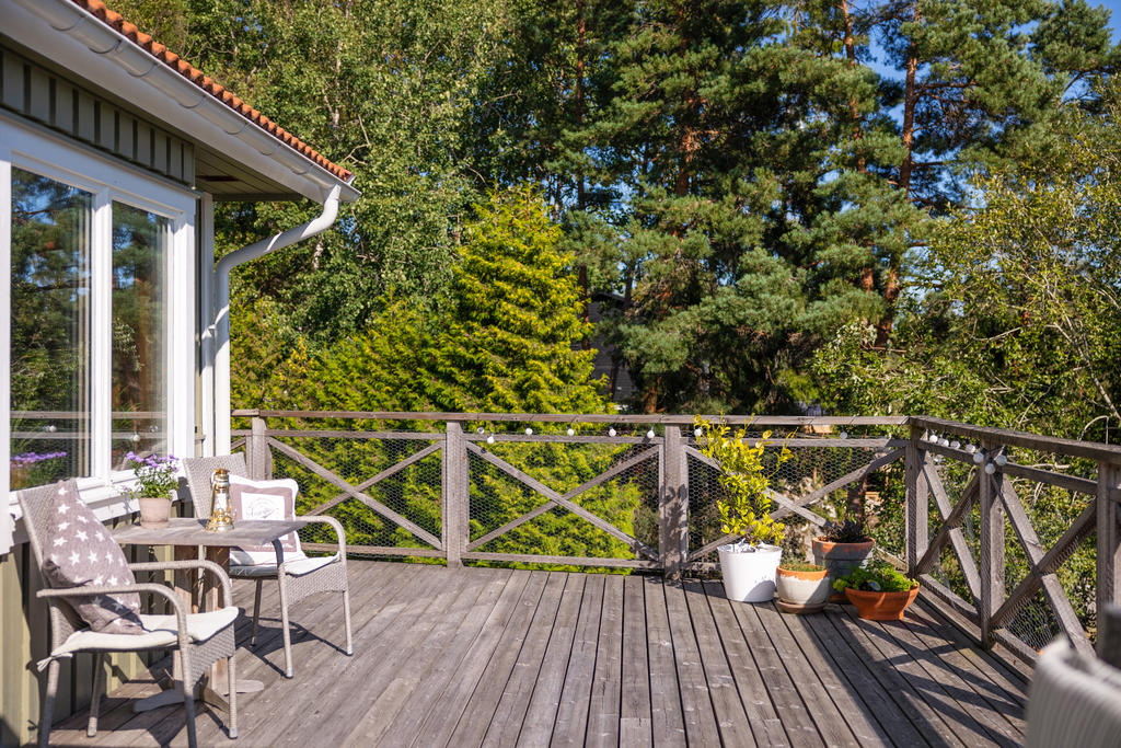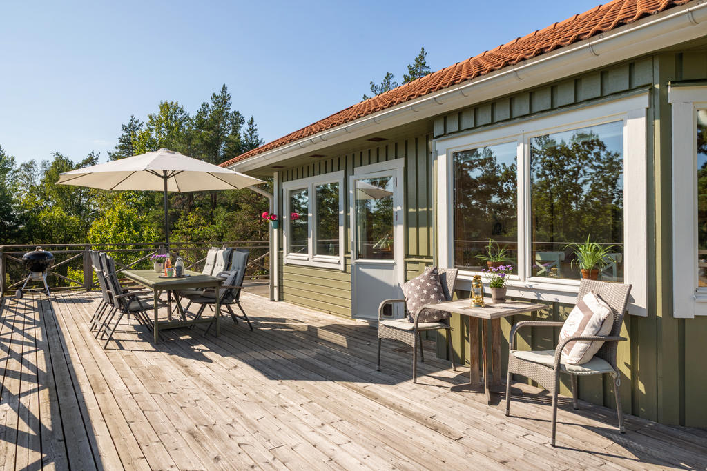 - Stor terass som sträcker sig runt huset.