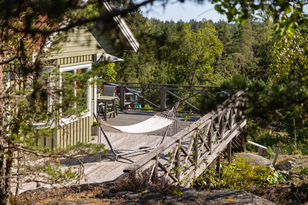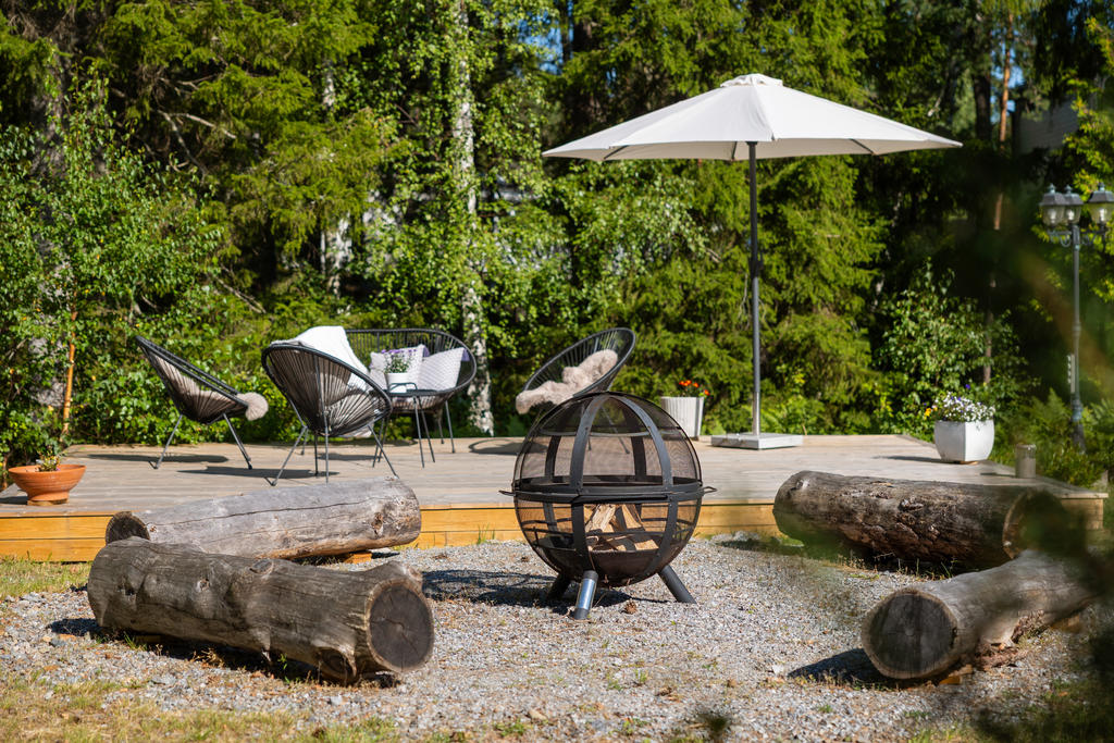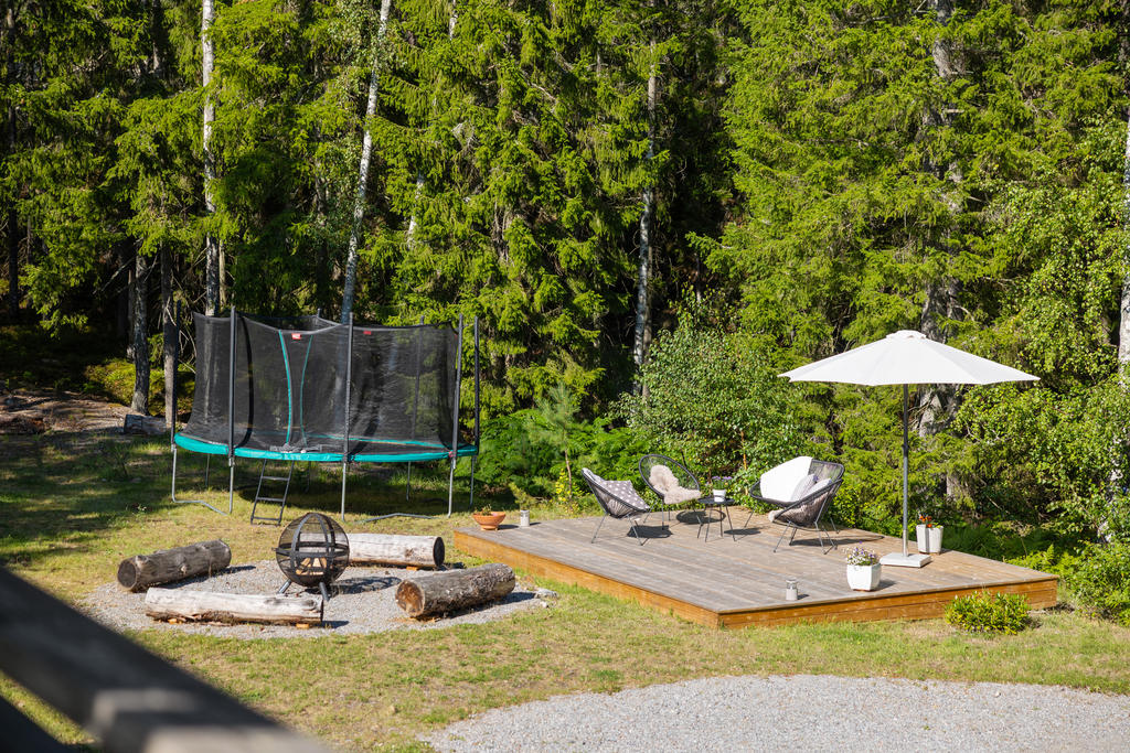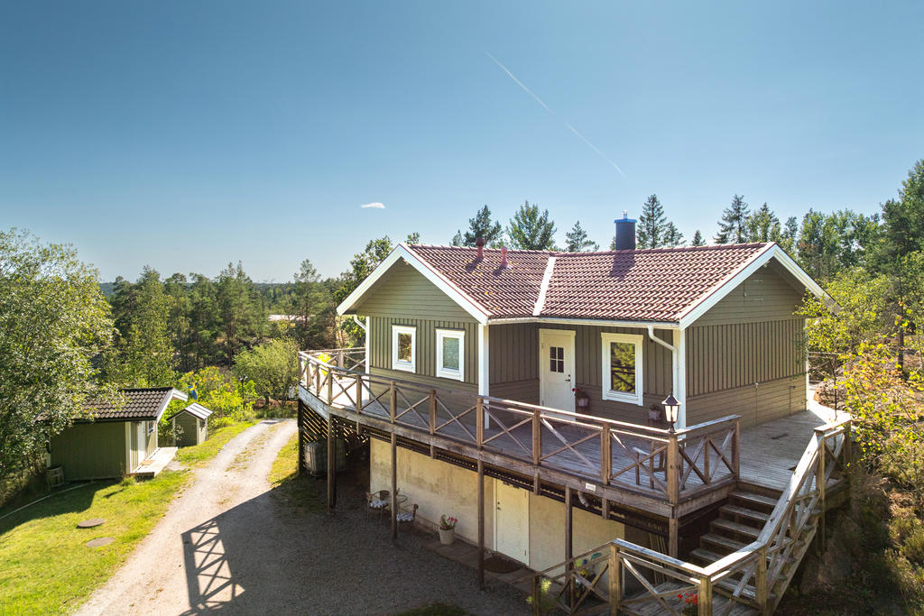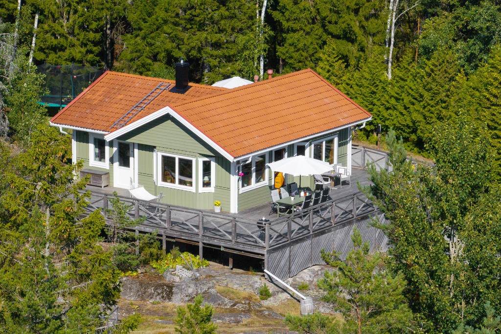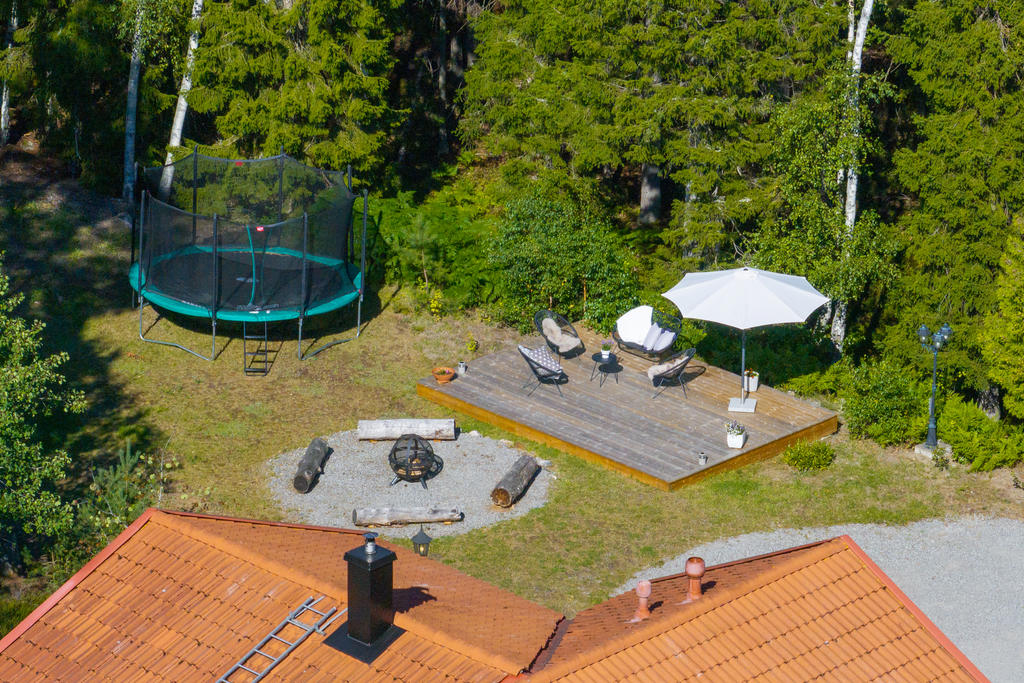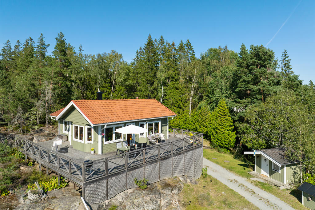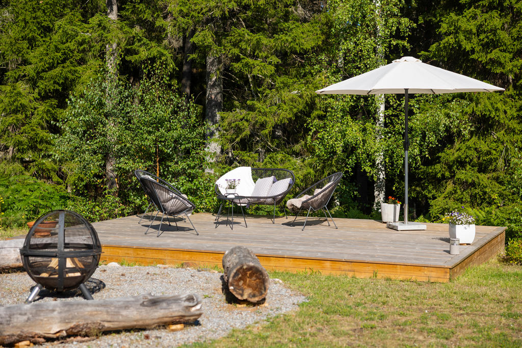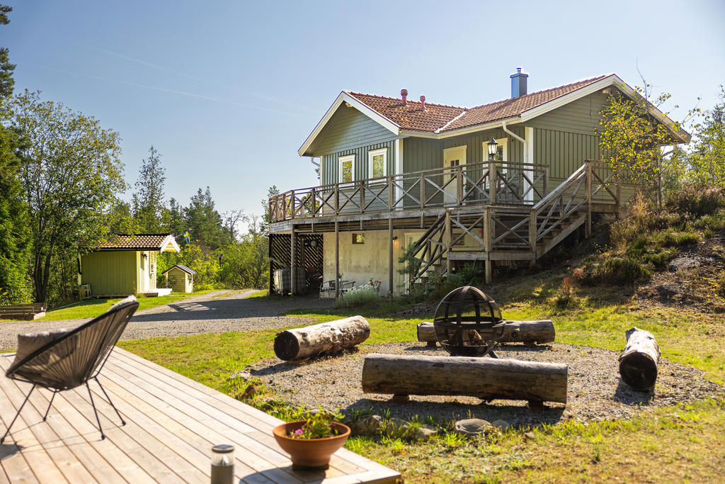 - Stor terass som sträcker sig runt huset.
