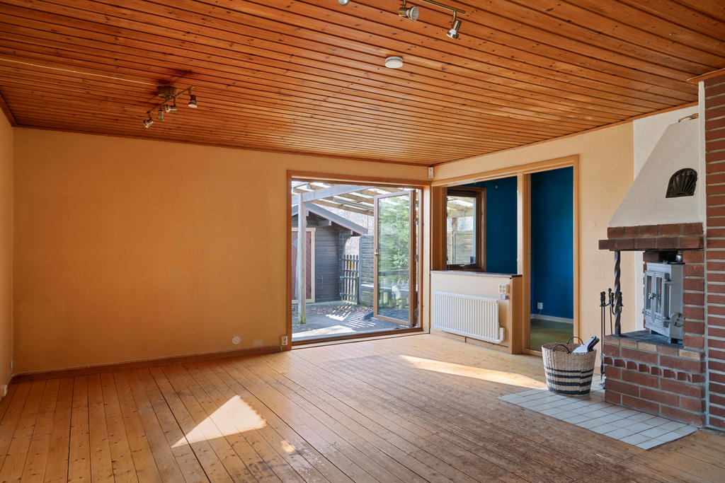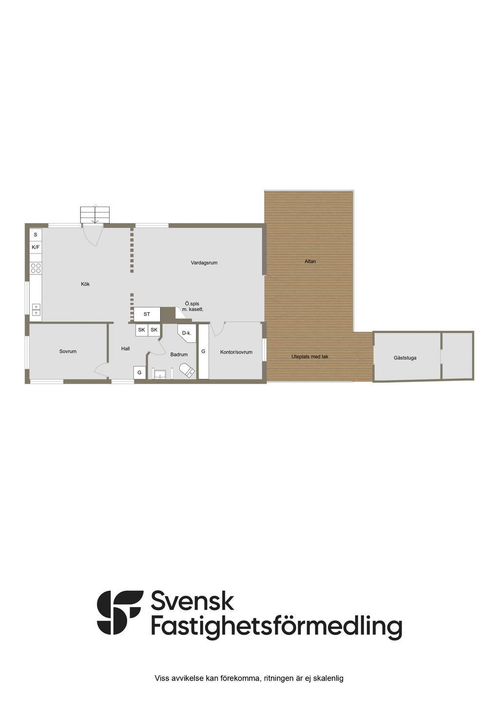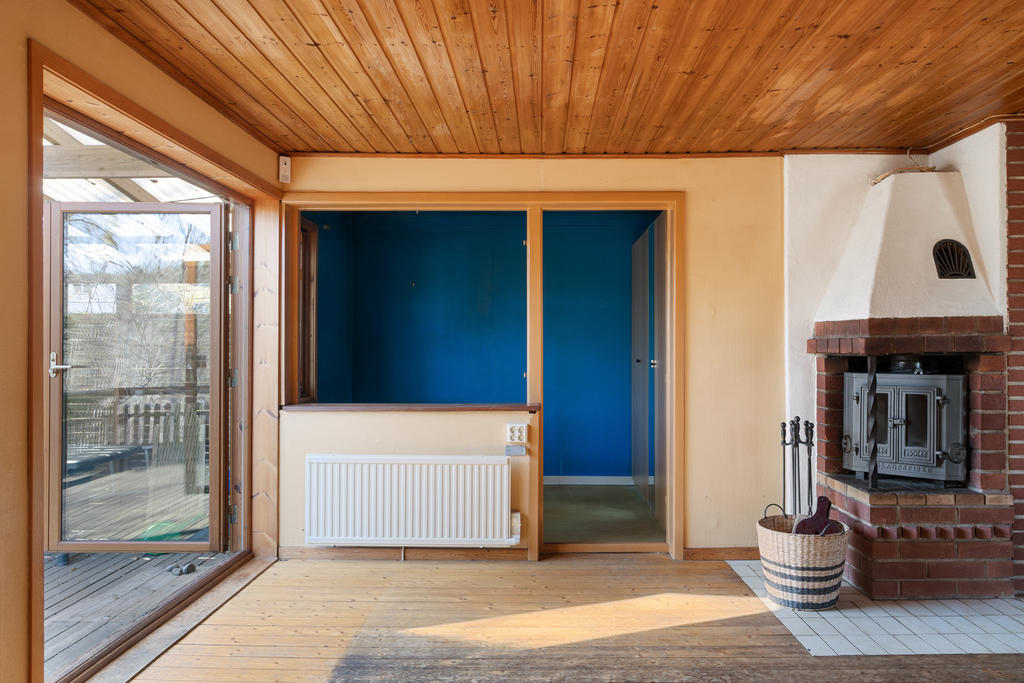 Väl inne i huset finner du ett kök utrustat med kyl/frys, skåpsförvaring, spis med ugn samt diskho. Vid köket finns plats för matbord. Stort vardagsrum med fin öppen spis med kassett och stora glasade dörrar mot uteplatsen. Vidare finner du ett sovrum och ett kontor som enkelt kan göras om till ytterligare sovrum. Slutligen finner du en hall med förvaring och badrum utrustat med duschkabin, wc och handfat.