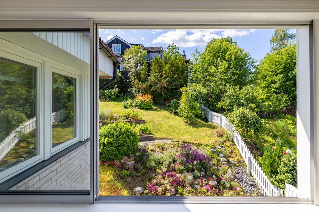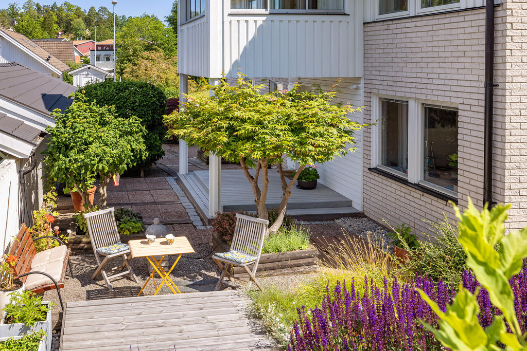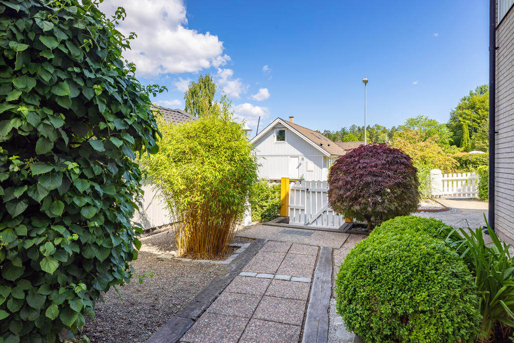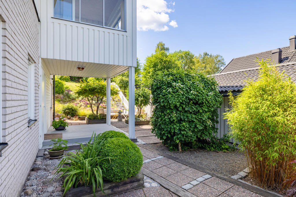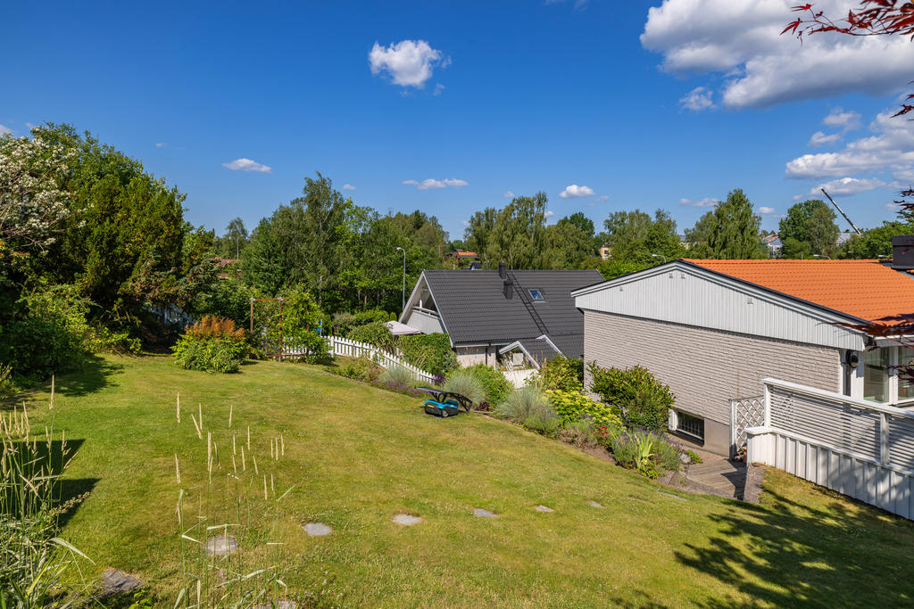 Den generösa hörntomten bjuder på ljus och frihet med plats för lek, trädgårdsdrömmar eller soliga stunder på altanen. Nedanför altanen sträcker sig en unik terrassodling som ger tomten karaktär och möjligheter för den odlingsintresserade. Vid ingången till nedre plan välkomnas du av en charmig japansk-inspirerad trädgård med en inbjudande entré och en mysig plats perfekt för en lugn fikastund. Tomten erbjuder även gott om plats för parkering (4 st p-platser) och i anslutning till huset finns ett praktiskt garage som underlättar vardagen.