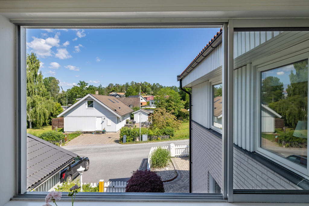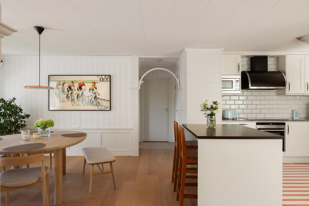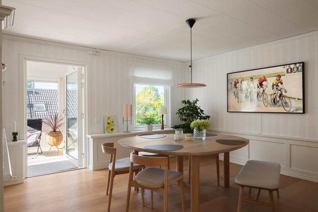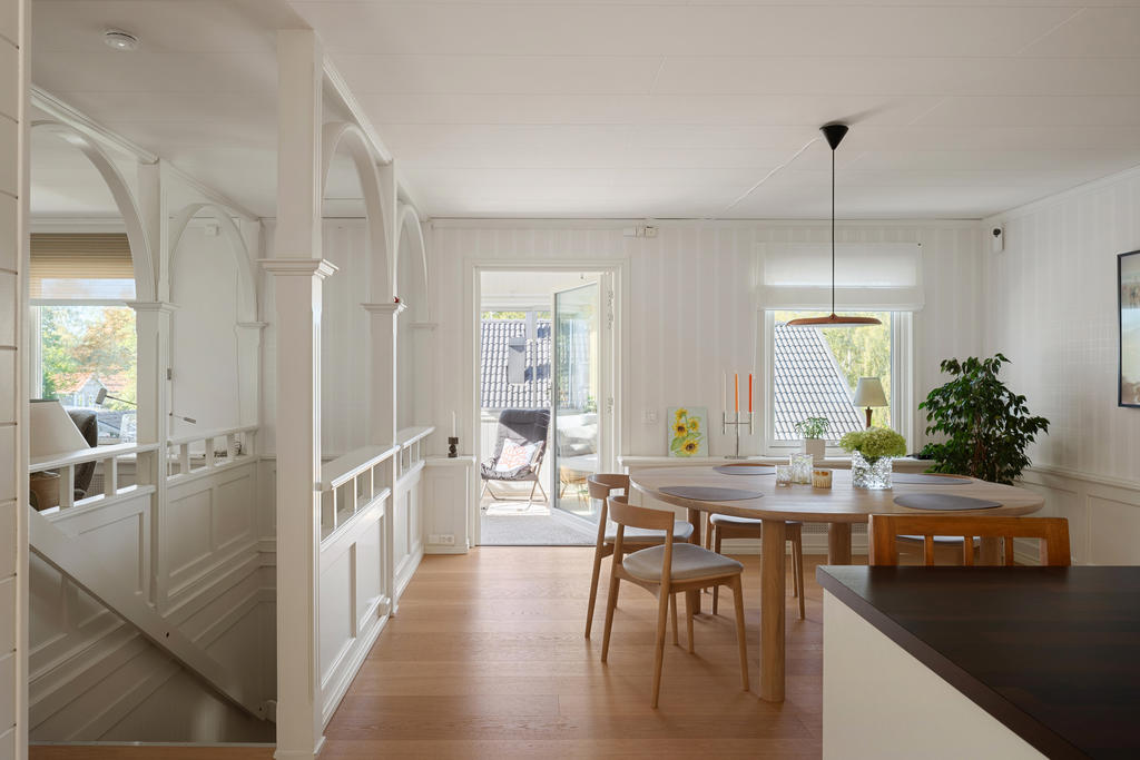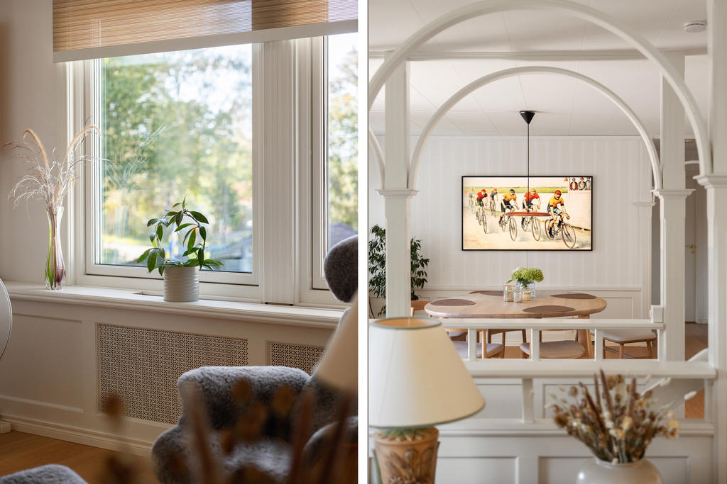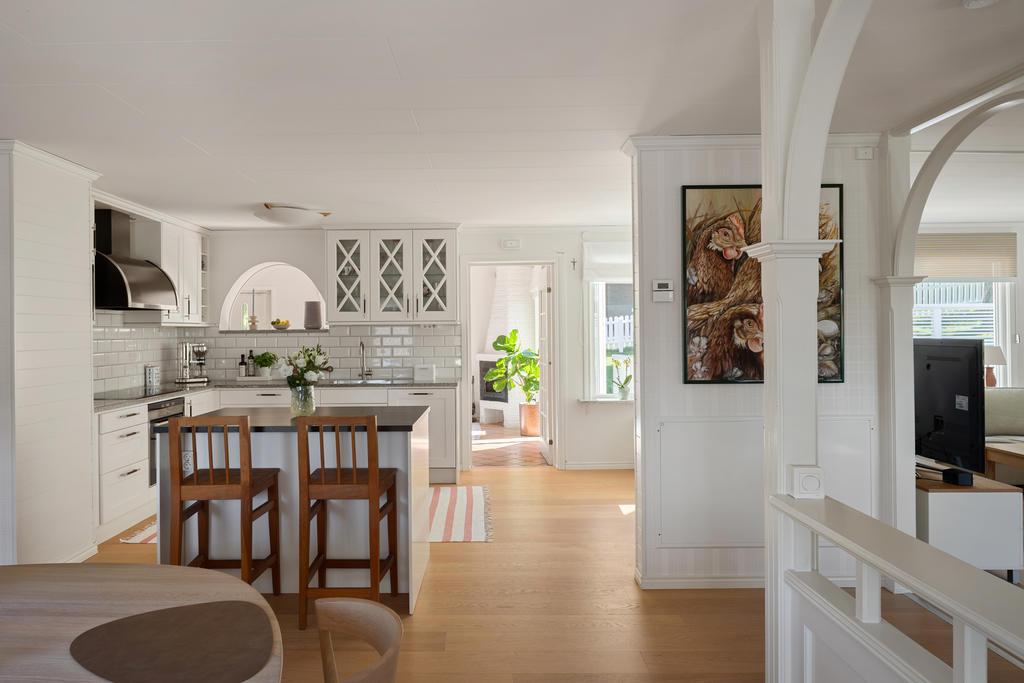 Via en elegant glasinnerdörr kliver du in i husets hjärta med ett stort och ljust Ballingslöv-kök i ask med köksö och en charmig sittplats vid fönstret. Här smälter träpaneler samman med det moderna och den öppna planlösningen skapar ett socialt flöde till matplatsen och en sömlös övergång till det rymliga uterummet via en helglasad balkongdörr. Vardagsrummet, som sträcker sig genom hela huset med fönster åt båda håll, bjuder på flexibilitet och ljus. Intill ligger master bedroom med klädkammare och en mindre toalett, allt sammanhållet av stilrena Kährs ekgolv och vattenburen golvvärme. Nya treglasfönster ramar in varje rum med energieffektivitet och elegans.