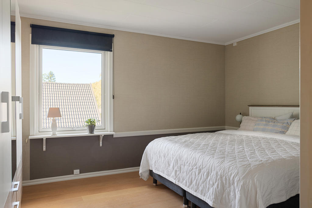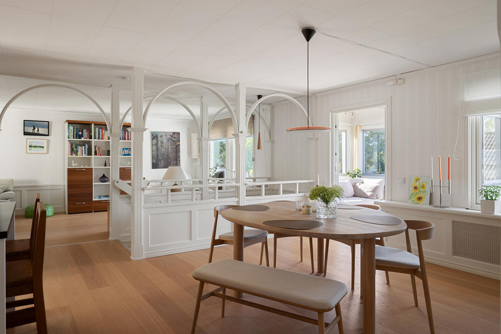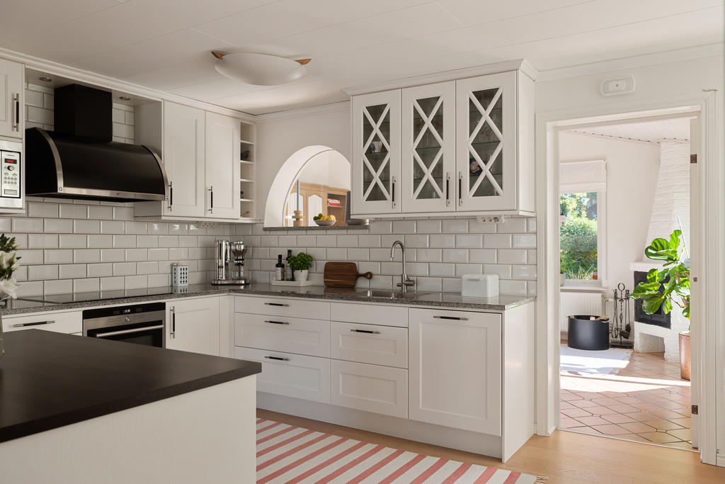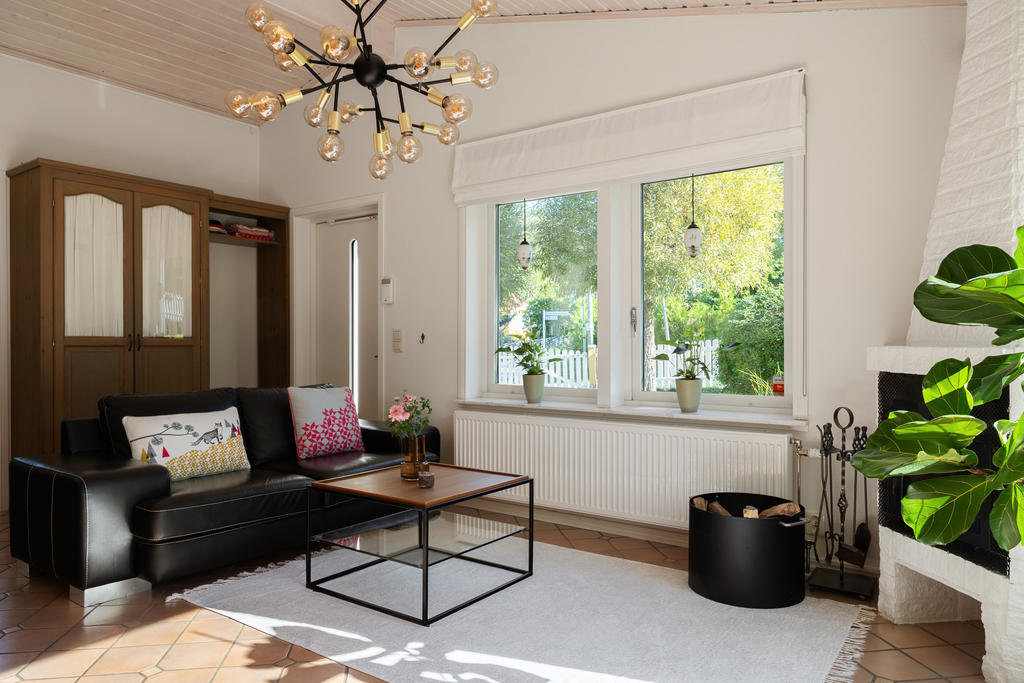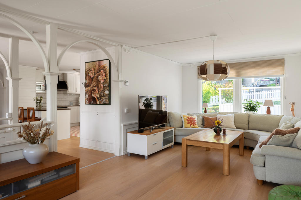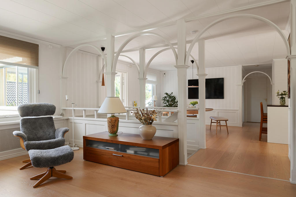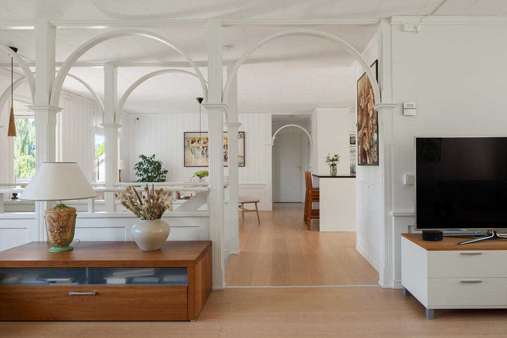 Via en elegant glasinnerdörr kliver du in i husets hjärta med ett stort och ljust Ballingslöv-kök i ask med köksö och en charmig sittplats vid fönstret. Här smälter träpaneler samman med det moderna och den öppna planlösningen skapar ett socialt flöde till matplatsen och en sömlös övergång till det rymliga uterummet via en helglasad balkongdörr. Vardagsrummet, som sträcker sig genom hela huset med fönster åt båda håll, bjuder på flexibilitet och ljus. Intill ligger master bedroom med klädkammare och en mindre toalett, allt sammanhållet av stilrena Kährs ekgolv och vattenburen golvvärme. Nya treglasfönster ramar in varje rum med energieffektivitet och elegans.