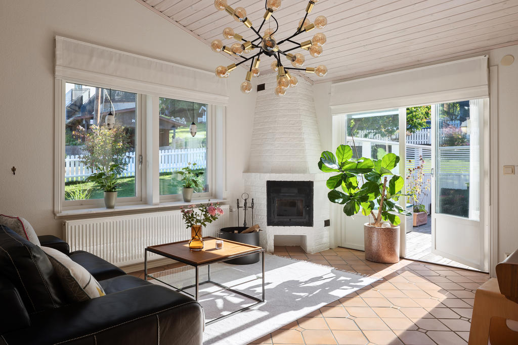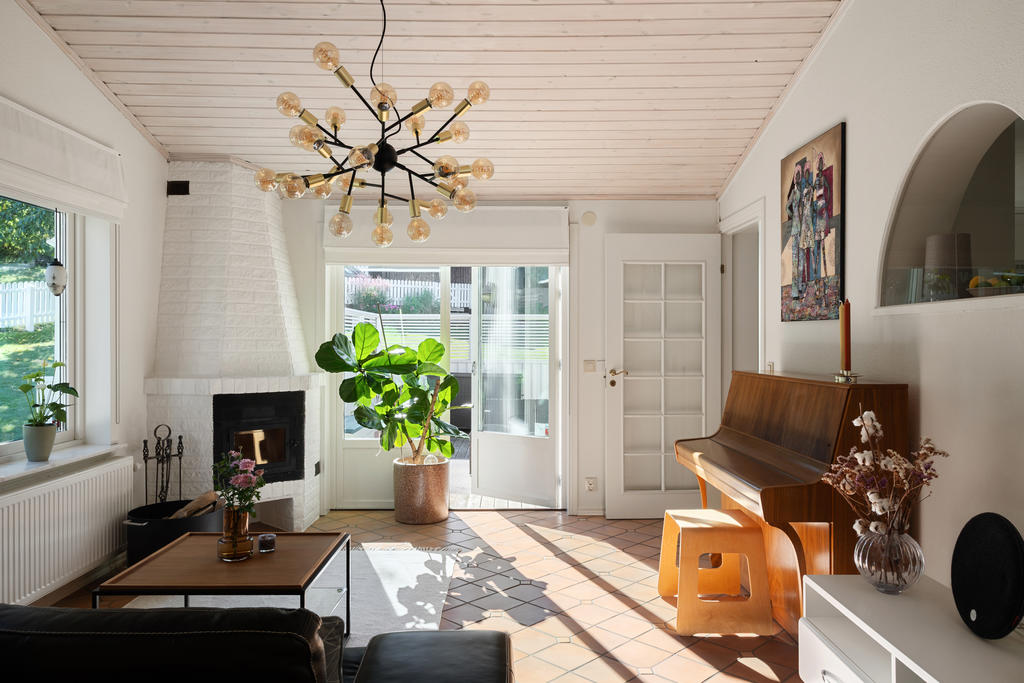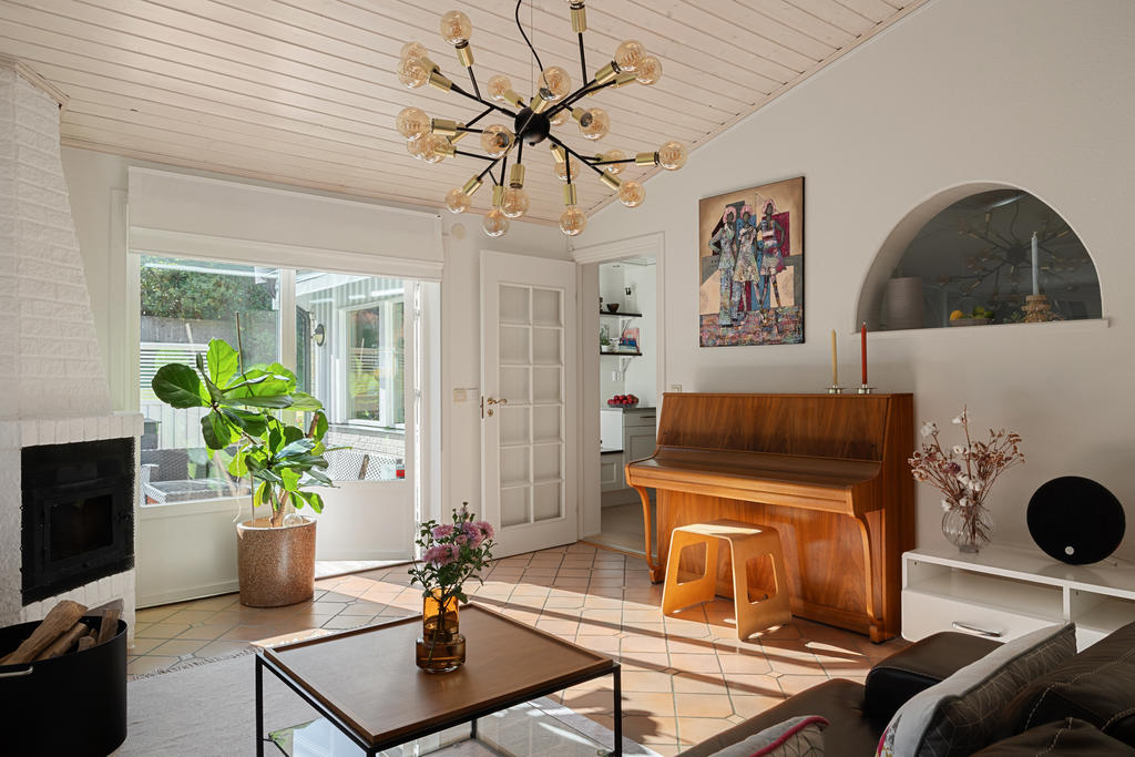 Stig in genom huvudentrén och möt ett ljust och luftigt sällskapsrum som genast sätter tonen. Stora fönsterpartier fyller rummet med naturligt ljus medan dubbla altandörrar öppnar upp mot en inbjudande altan och trädgård.