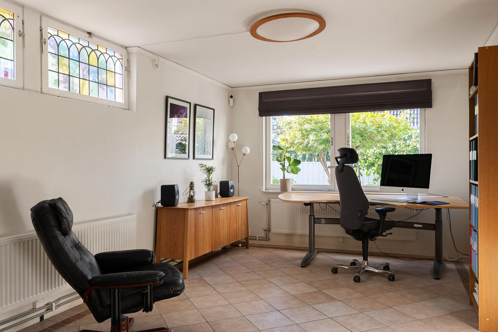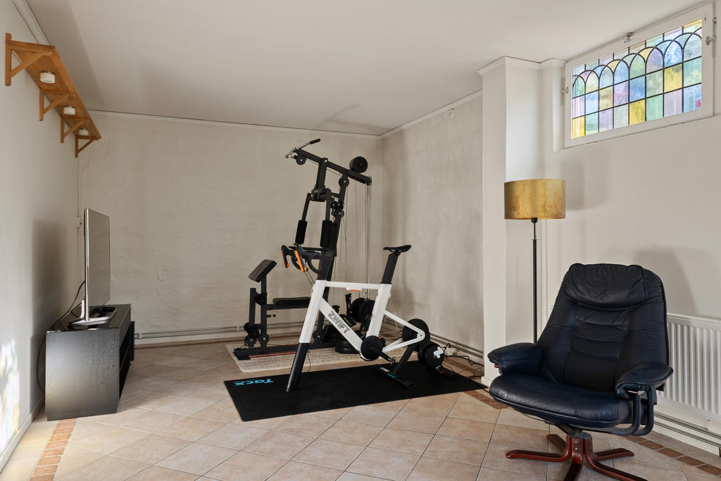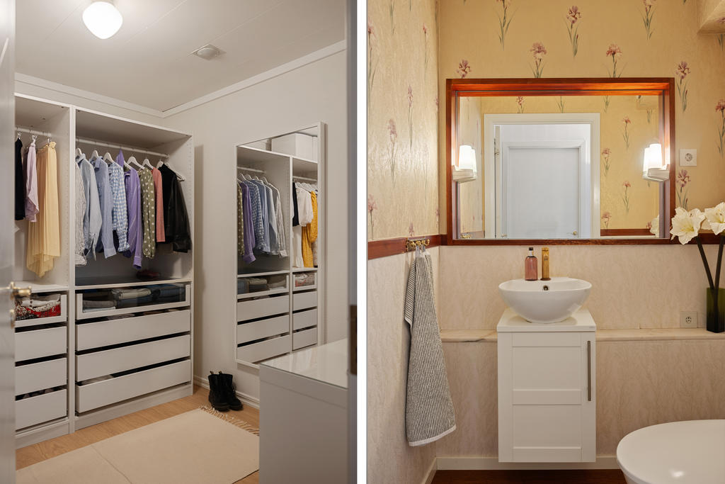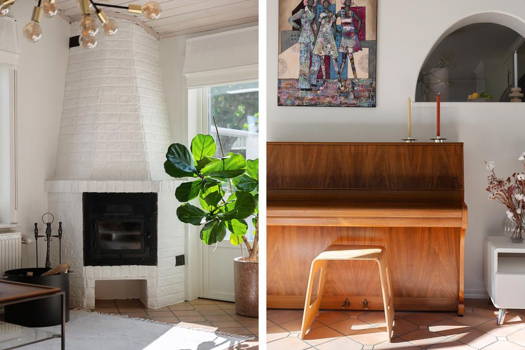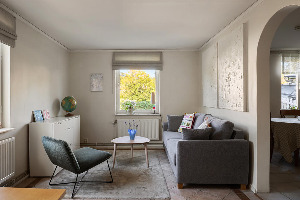 Rummet, med öppen spis, klinkergolv med elslingor och vattenburna radiatorer, bjuder på en härlig rymd tack vare takhöjden upp till nock. Perfekt för både mysiga kvällar och trevliga stunder med familj och vänner. Intill finner du ett smakfullt sovrum med enstavig Kährs ekparkett och vattenburen radiator där högt i tak förstärker känslan av rymd och exklusiv karaktär. Bredvid finns ett nyrenoverat badrum med exklusiva material, stora kakelplattor, dusch, badkar och måttanpassade möbler – ett stilrent och funktionellt utrymme för vardagens rutiner.