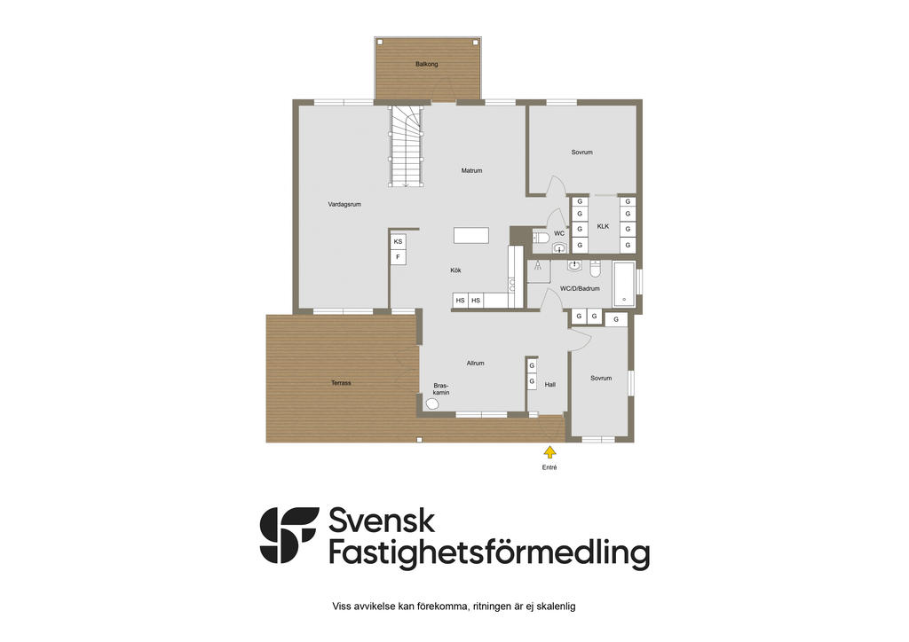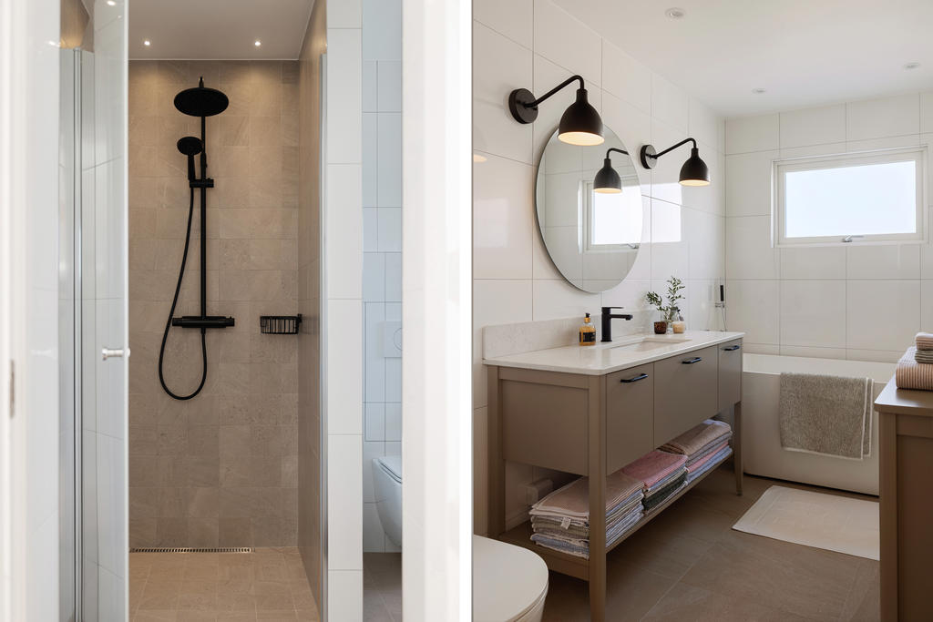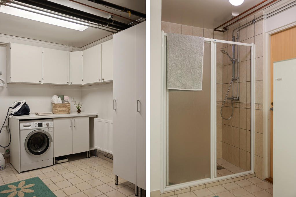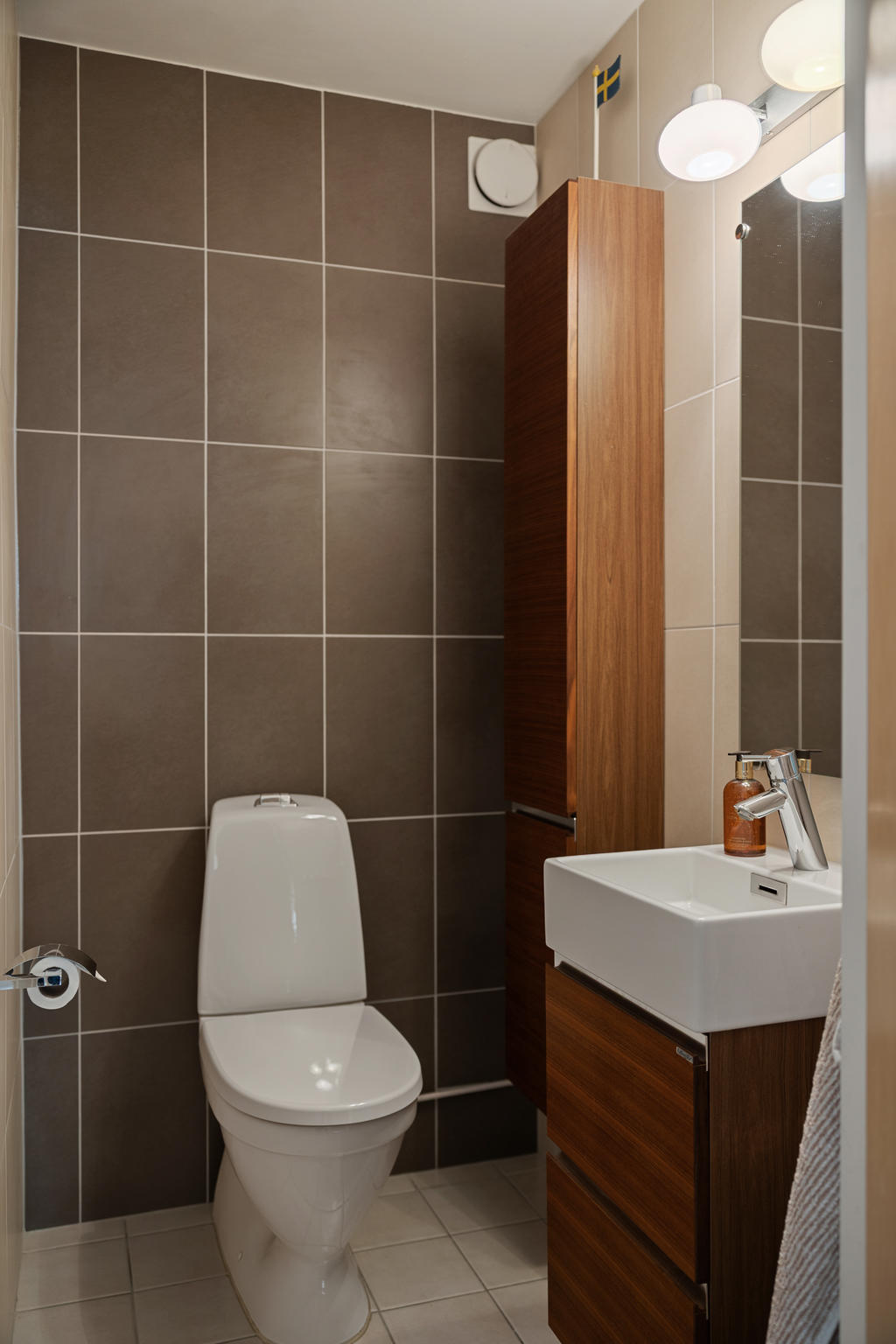 En vacker ektrappa leder dig till nedre plan, där en inbjudande hall med stilrent klinkergolv, behaglig golvvärme och praktiska garderober med skjutdörrar välkomnar dig. Här finner du huvudentrén för nedre plan, med direkt access till en funktionell tvättstuga som rymmer både dusch, bergvärmepump och varmvattenberedare. En separat toalett i anslutning till hallen adderar extra bekvämlighet.
