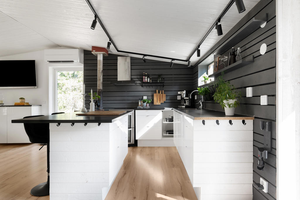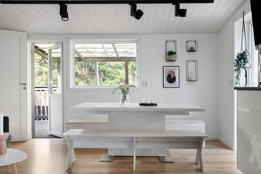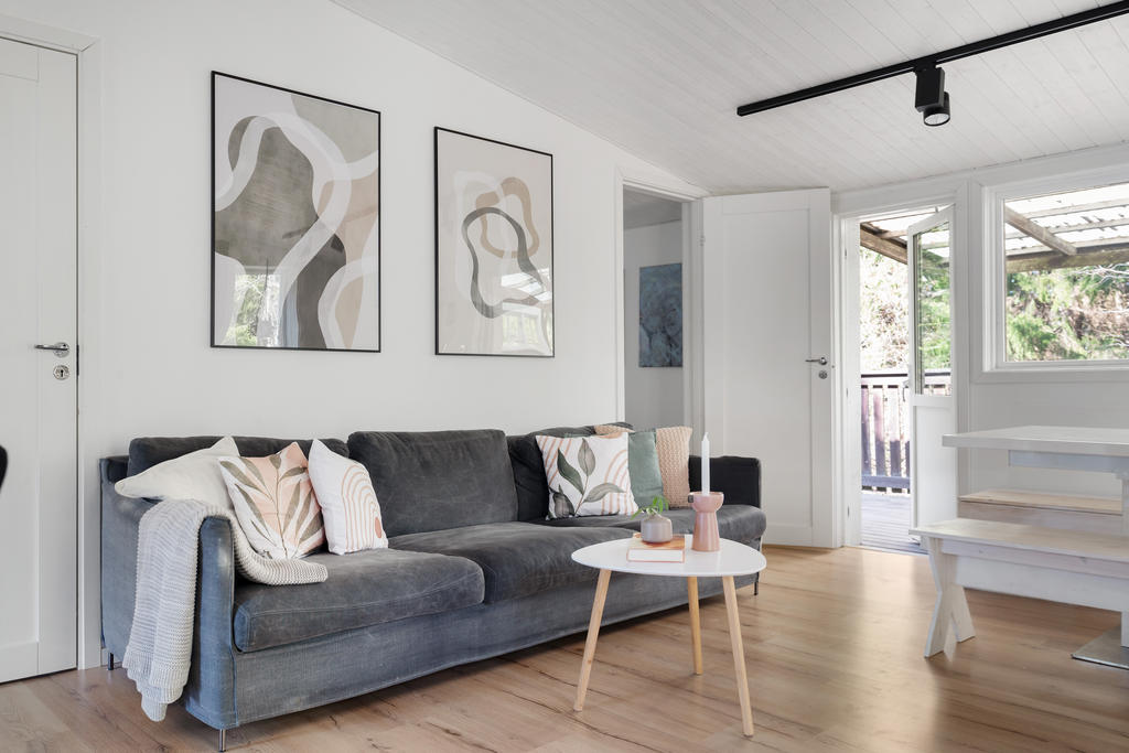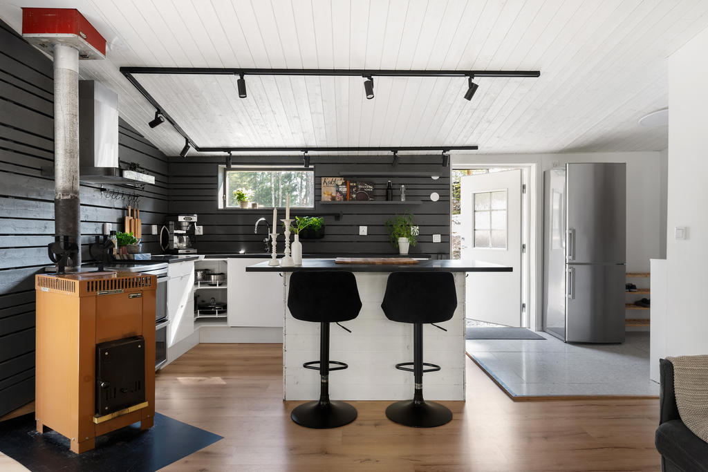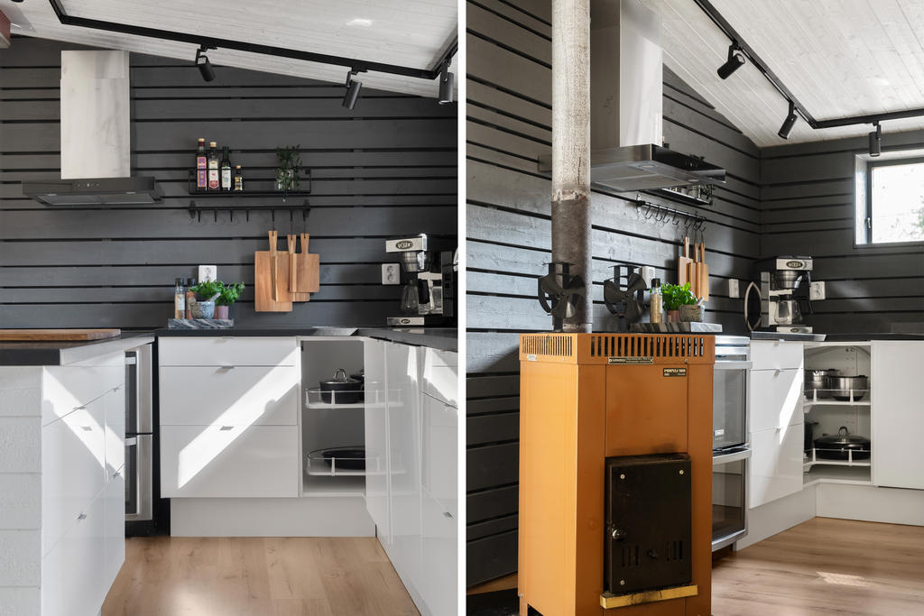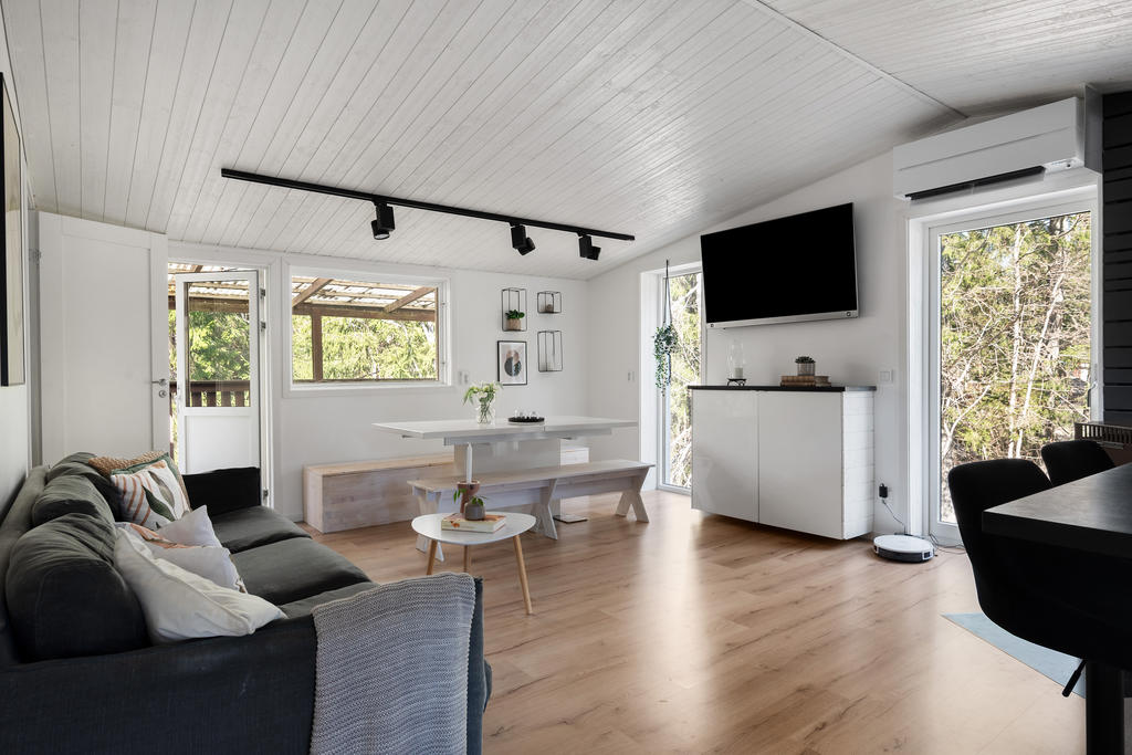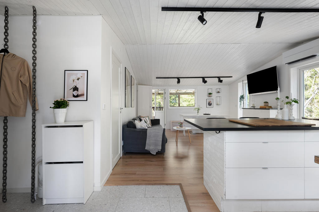 Kök och vardagsrum ligger i öppen planlösning med fönster i tre väderstreck som ger fint ljus och utsikt mot grönska. Köket i vinkel erbjuder gott om förvaring och bra bänkytor. Den stora köksön blir en naturlig plats att samlas kring. Vardagsrummet är rymligt med plats för både matgrupp och soffgrupp och den vedeldade kaminen ger både värme och en mysig känsla. Från vardagsrummet når du en trädäckad altan under tak, en enkel och användbar yta för både vardag och sommar.