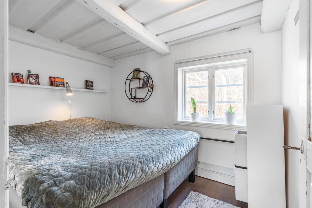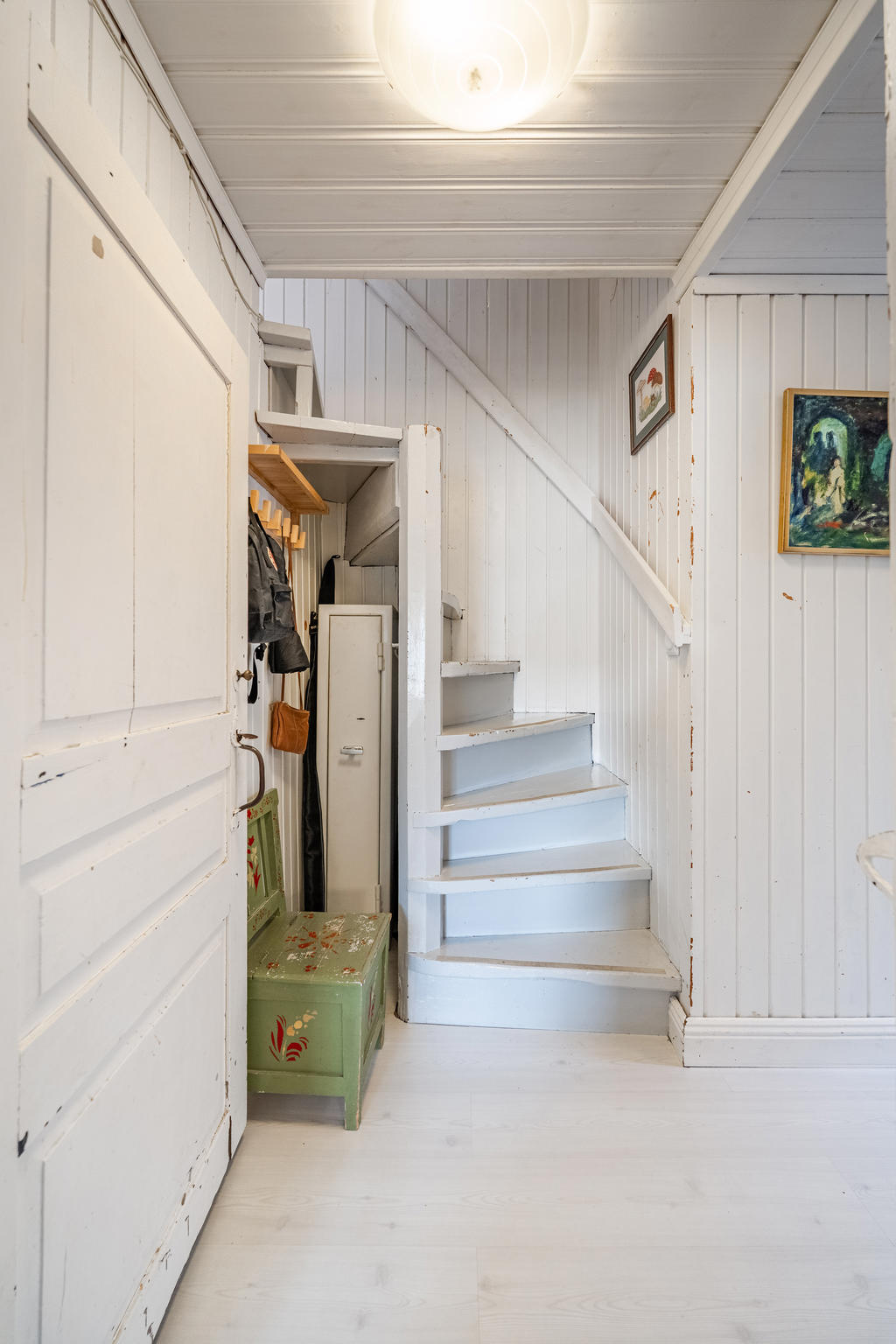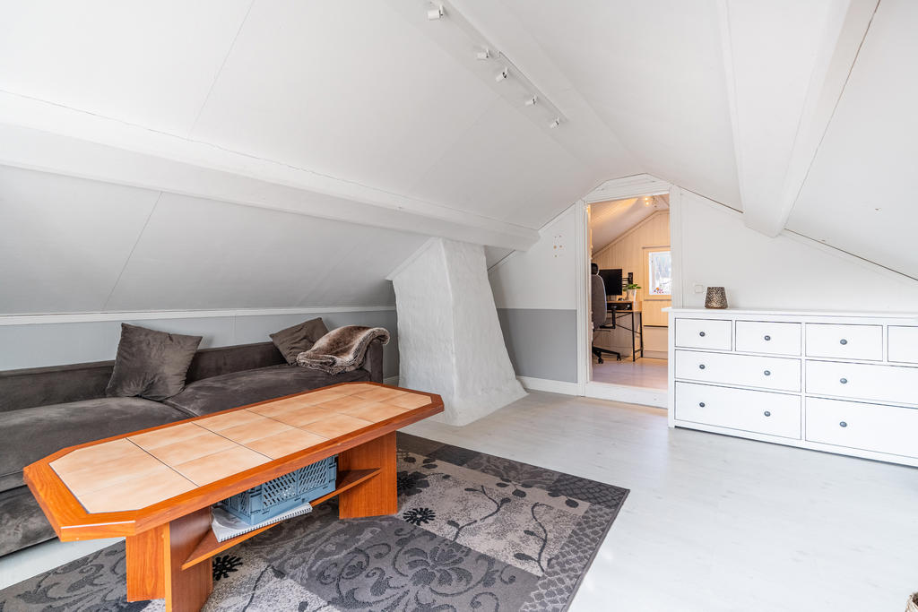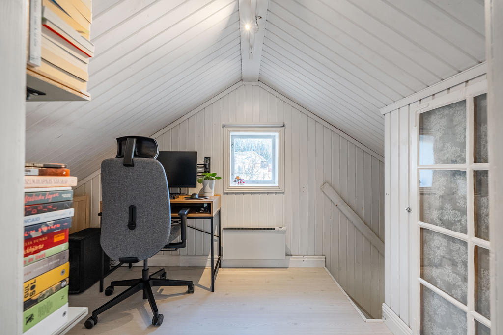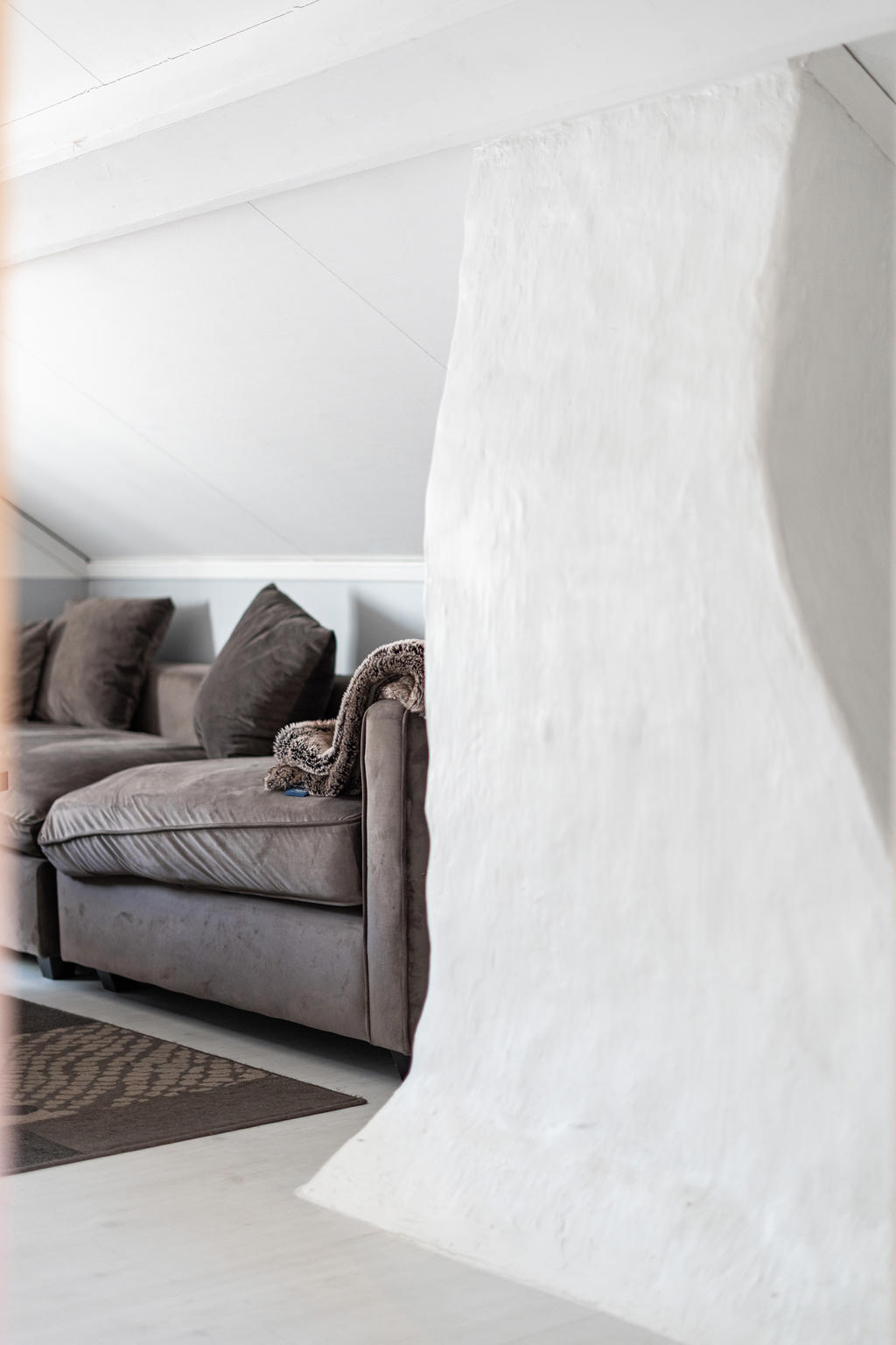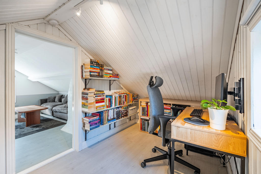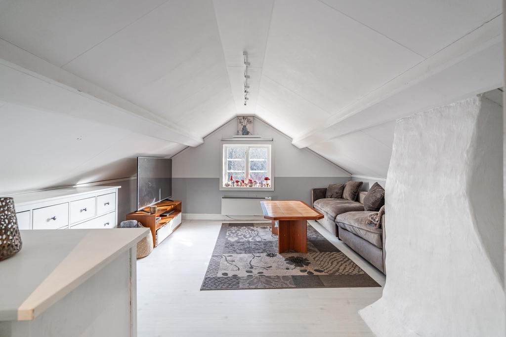 En ljust gråmålad trappa leder upp till övre plan där du möts av en mindre hall med plats för en mindre konstorsyta med ljust laminatgolv och vitmålad träpanel på både väggar och tak. Här finns även praktisk förvaring i en kattvind med lucka ovanför trapphuset. Allrummet på övre plan är rymligt för både soffgrupp och tv-möbler. Ett bedårande och mycket rogivande rum som tidigare nyttjades som ett master bedroom. Det generösa ljusinsläppet här uppe tillsammans med de ljusa, dämpade färgvalen skapar en harmonisk atmosfär. Golvet är i vitt/ljust laminat och väggarna är målade i ljusa toner av vitt och grått.
