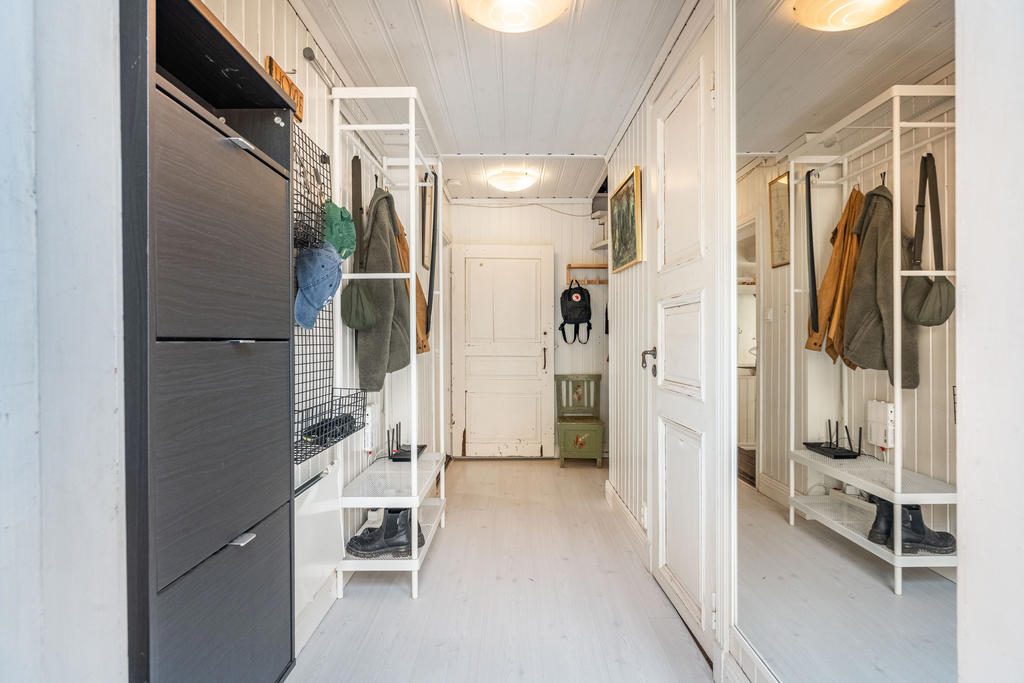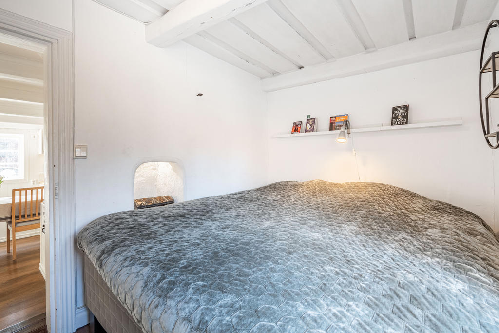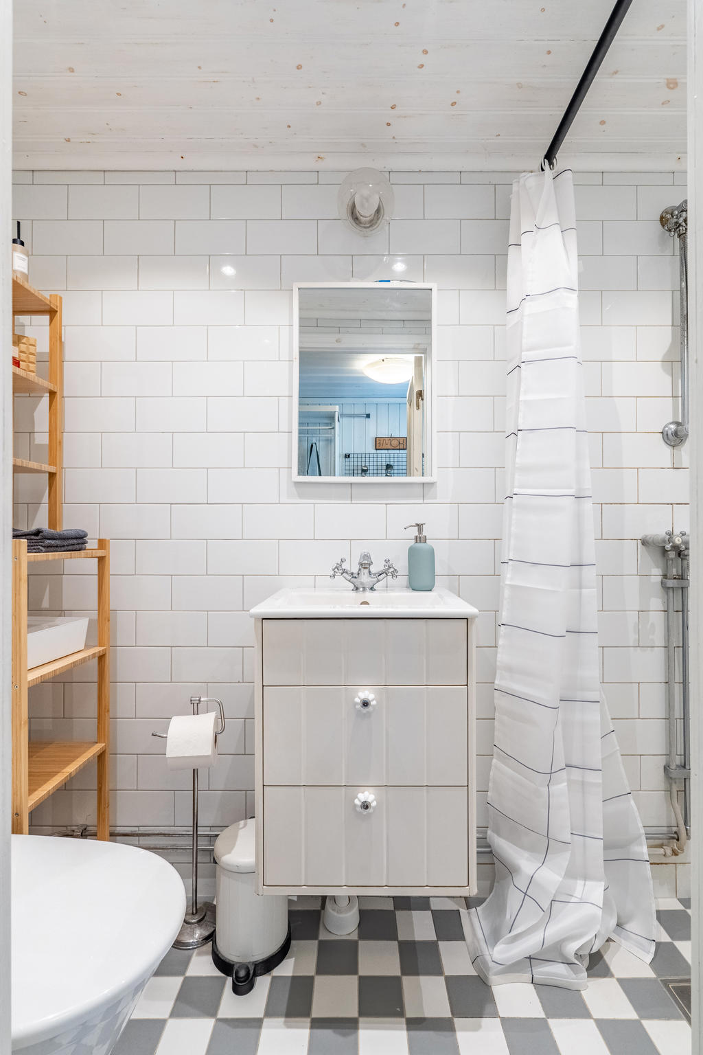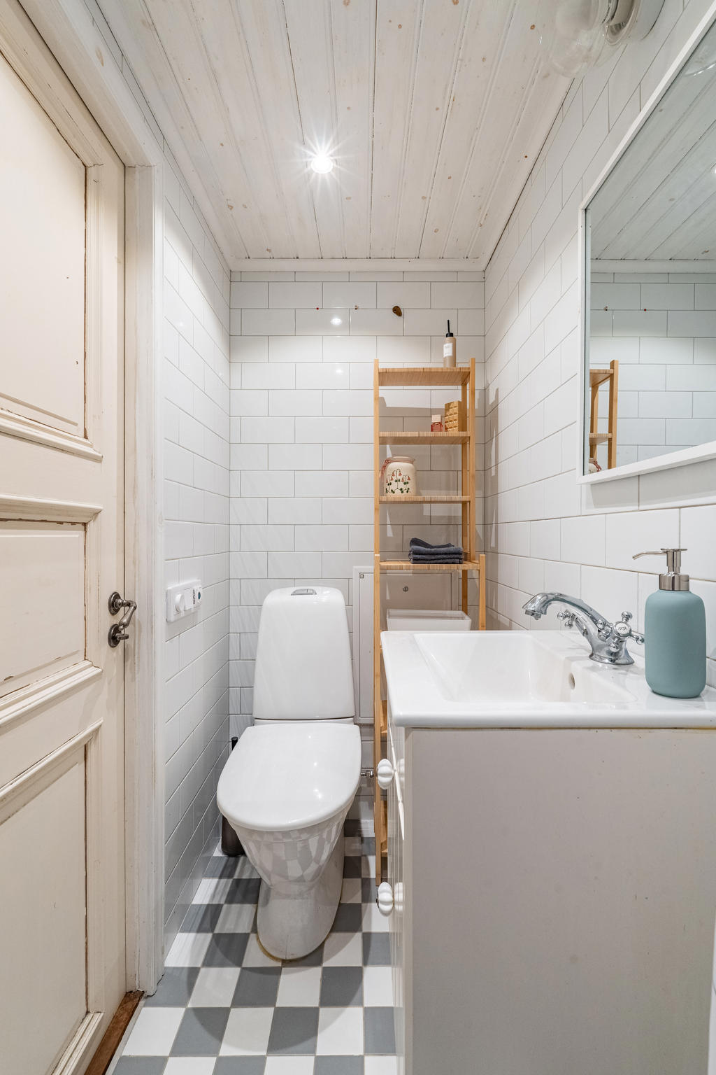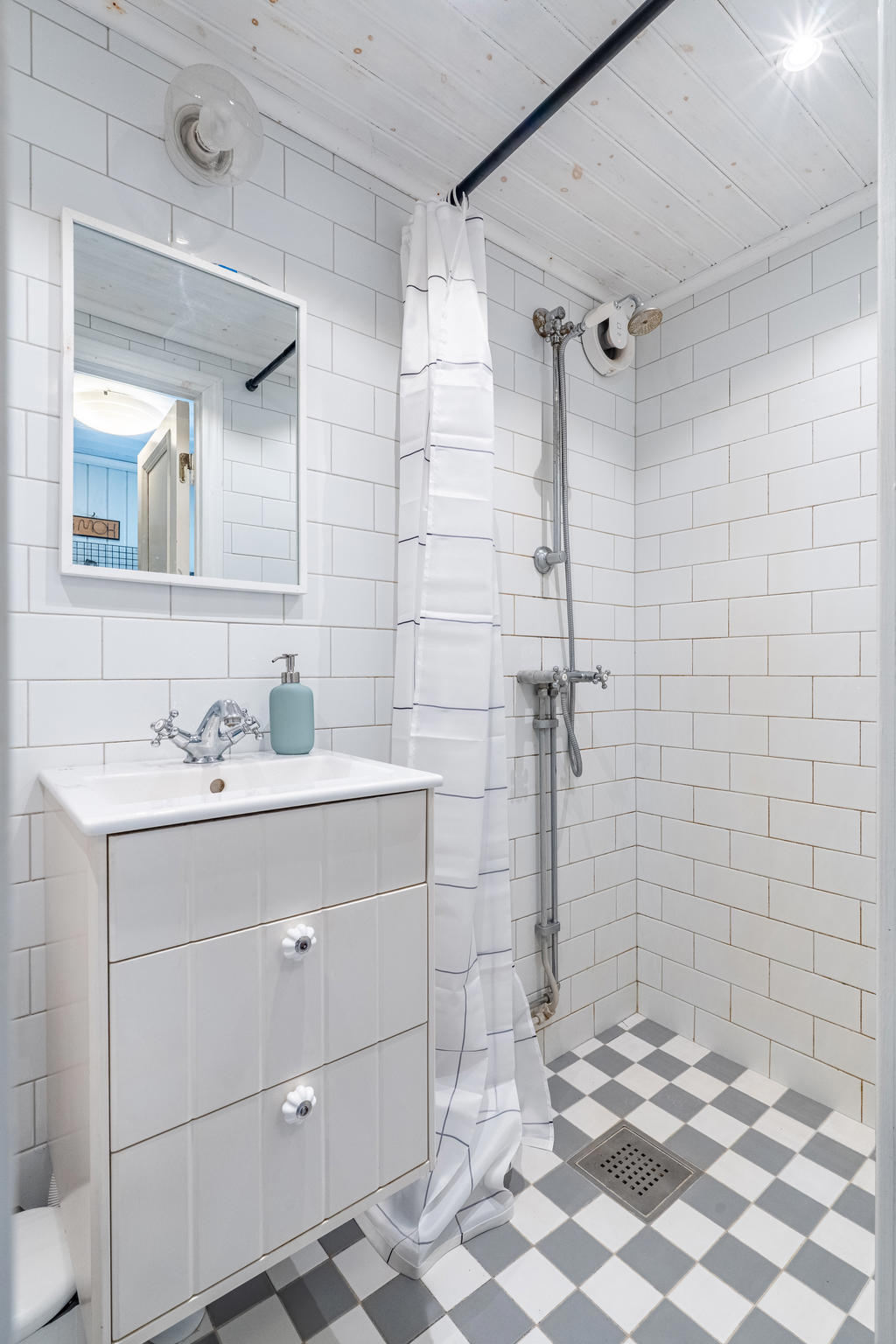 Du välkomnas in via en charmig farstukvist som leder till entrén. Hallen är ljus och inbjudande med plats för avhängning. Golvet är belagt med slitstarkt och lättskött laminat och väggar samt tak pryds av vitmålad träpanel, vilket sätter tonen direkt. Härifrån nås badrummet till höger, köket till vänster och trappan som leder vidare upp till övre plan. Köket är något alldeles extra och utstrålar både charm och funktion. Här har varje detalj fått sin plats med gott om förvaring och en genomtänkt planlösning. Vid fönstret finns en platsbyggd sittplats med förvaring undertill – en perfekt plats för morgonkaffet. Den bevarade spiskåpan med tillhörande gjutjärnsvedspis bidrar med både karaktär och hög mysfaktor, och fungerar även utmärkt för matlagning. Köket är utrustat med integrerad kyl och frys, induktionshäll med ugn och fläkt, integrerad diskmaskin samt integrerad tvättmaskin. Ovanför de gedigna träbänkskivorna sitter vitt kakel och golvet består av laminat med behagliga värmeslingor. Synliga vitmålade takbjälkar och pärlspont på väggarna förstärker den lantliga känslan. I direkt anslutning till köket ligger ett mindre rum som idag används som sovrum. Även här finns laminatgolv och vitmålade väggar. En liten nisch i väggen, som tidigare varit eldstad, används idag för levande ljus och skapar en lugn och stämningsfull atmosfär. Badrummet är renoverat och håller modern standard med helkaklade vita väggar och klinker i ljusgrått och vitt på golvet, även här med golvvärme. Utrustningen består av duschplats, handfat med underskåp, spegel samt wc.