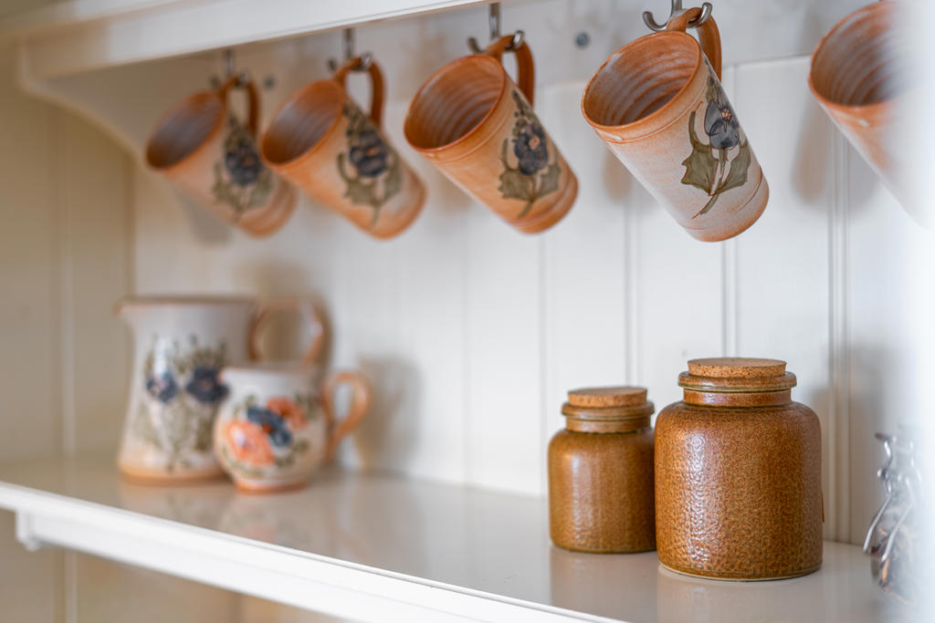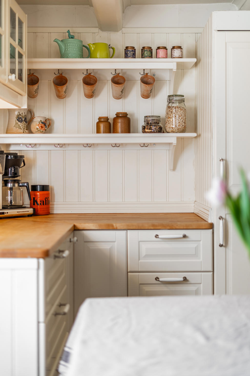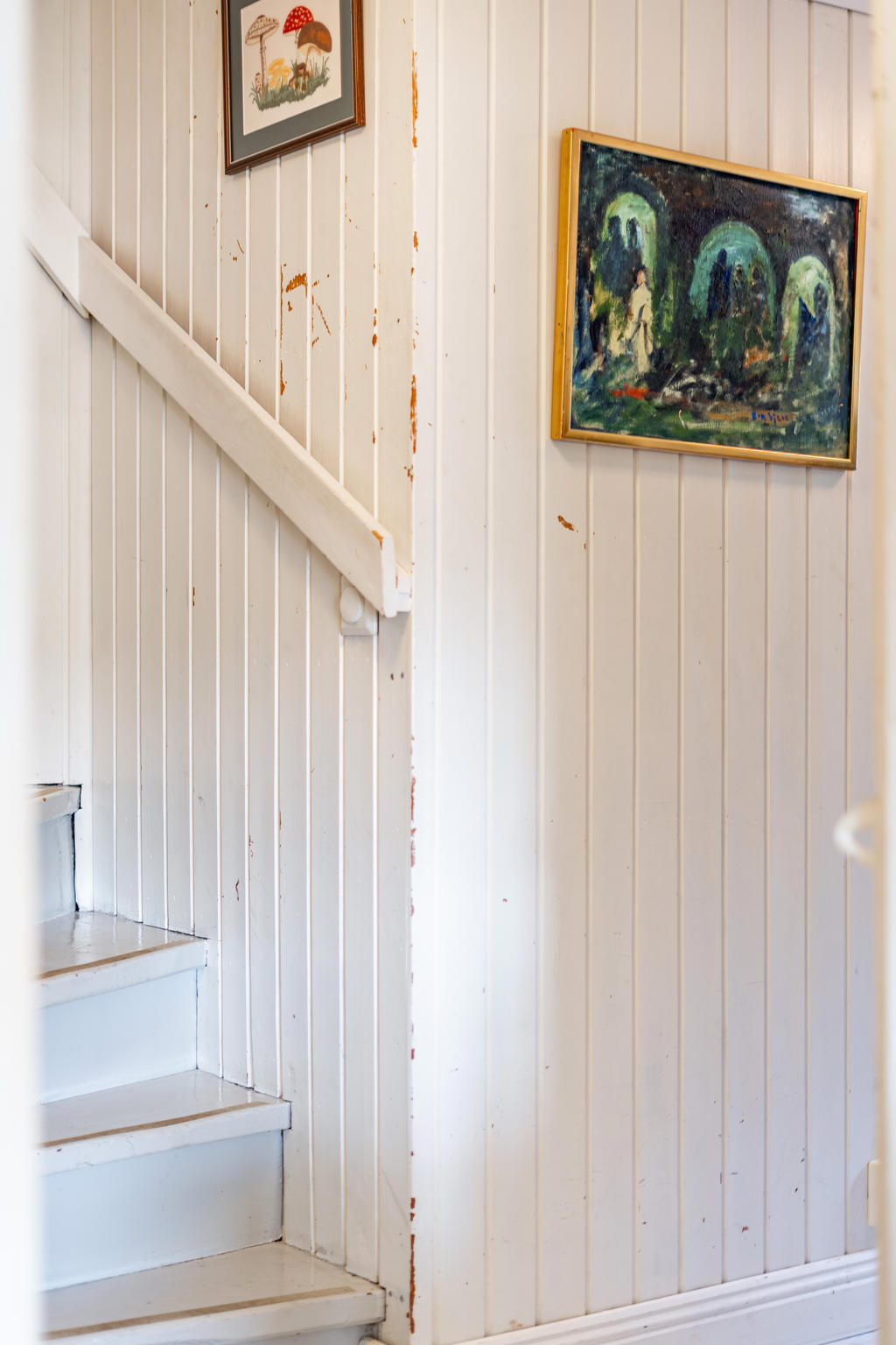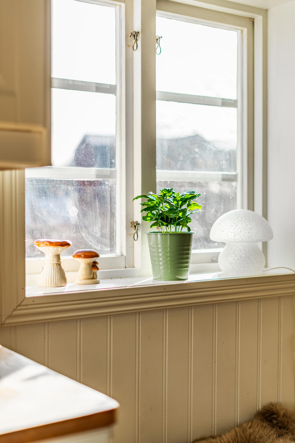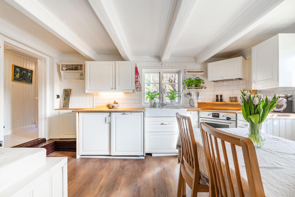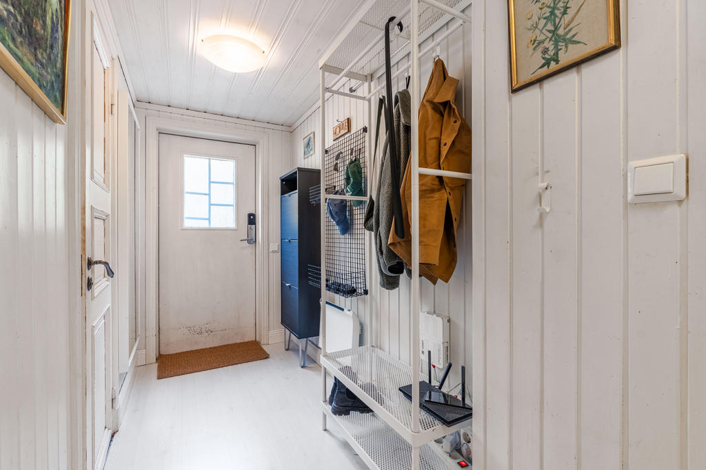 Du välkomnas in via en charmig farstukvist som leder till entrén. Hallen är ljus och inbjudande med plats för avhängning. Golvet är belagt med slitstarkt och lättskött laminat och väggar samt tak pryds av vitmålad träpanel, vilket sätter tonen direkt. Härifrån nås badrummet till höger, köket till vänster och trappan som leder vidare upp till övre plan. Köket är något alldeles extra och utstrålar både charm och funktion. Här har varje detalj fått sin plats med gott om förvaring och en genomtänkt planlösning. Vid fönstret finns en platsbyggd sittplats med förvaring undertill – en perfekt plats för morgonkaffet. Den bevarade spiskåpan med tillhörande gjutjärnsvedspis bidrar med både karaktär och hög mysfaktor, och fungerar även utmärkt för matlagning. Köket är utrustat med integrerad kyl och frys, induktionshäll med ugn och fläkt, integrerad diskmaskin samt integrerad tvättmaskin. Ovanför de gedigna träbänkskivorna sitter vitt kakel och golvet består av laminat med behagliga värmeslingor. Synliga vitmålade takbjälkar och pärlspont på väggarna förstärker den lantliga känslan. I direkt anslutning till köket ligger ett mindre rum som idag används som sovrum. Även här finns laminatgolv och vitmålade väggar. En liten nisch i väggen, som tidigare varit eldstad, används idag för levande ljus och skapar en lugn och stämningsfull atmosfär. Badrummet är renoverat och håller modern standard med helkaklade vita väggar och klinker i ljusgrått och vitt på golvet, även här med golvvärme. Utrustningen består av duschplats, handfat med underskåp, spegel samt wc.