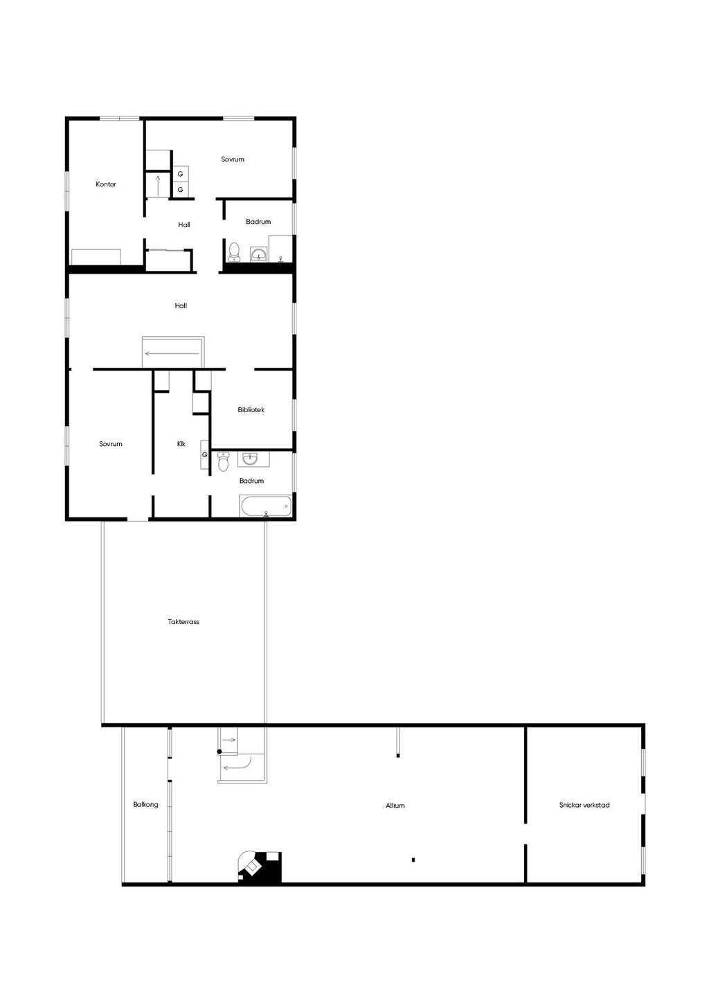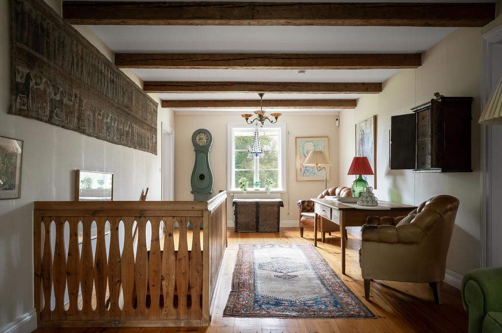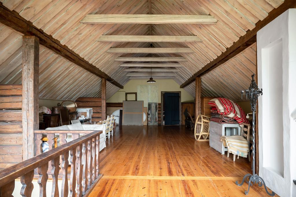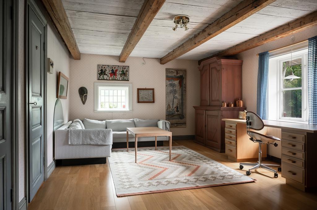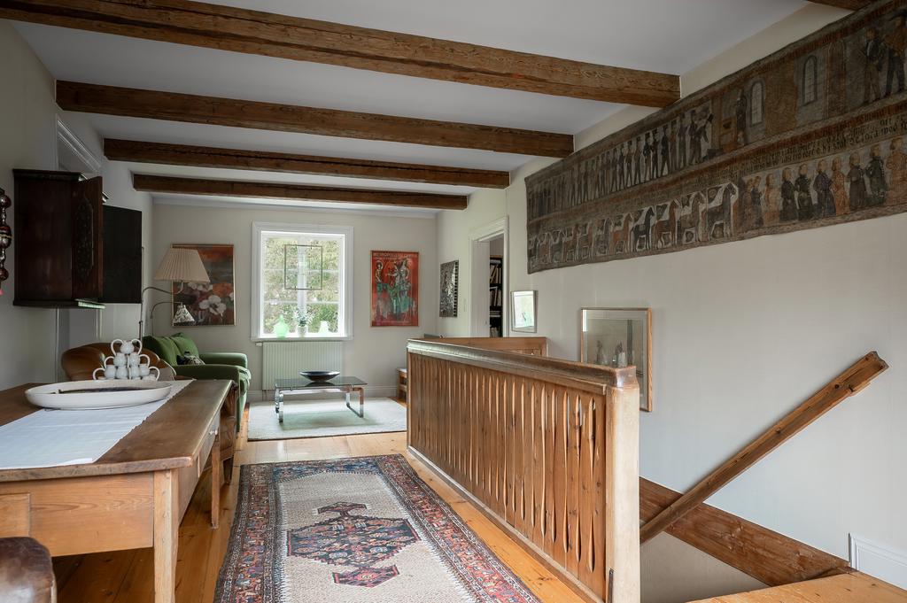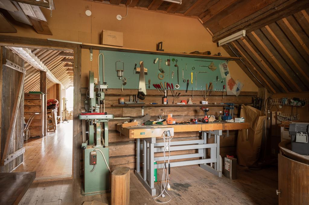 På övre plan, i den vinkelbyggda delen av huset, finns ett stort allrum som kan användas för riktigt stora sällskap, eller varför inte som en kreativ ateljé för den som behöver generösa utrymmen för sitt skapande. Här finns även ett stort utrymme som idag används som snickarverkstad, men som kan bli en del av ateljén eller förvandlas till ett extra sovrum – perfekt för den som vill ha flexibla lösningar i hemmet.