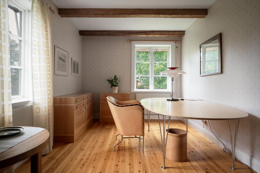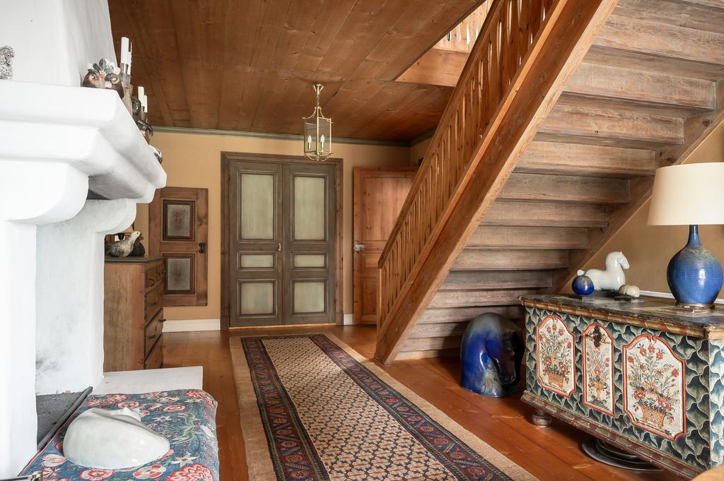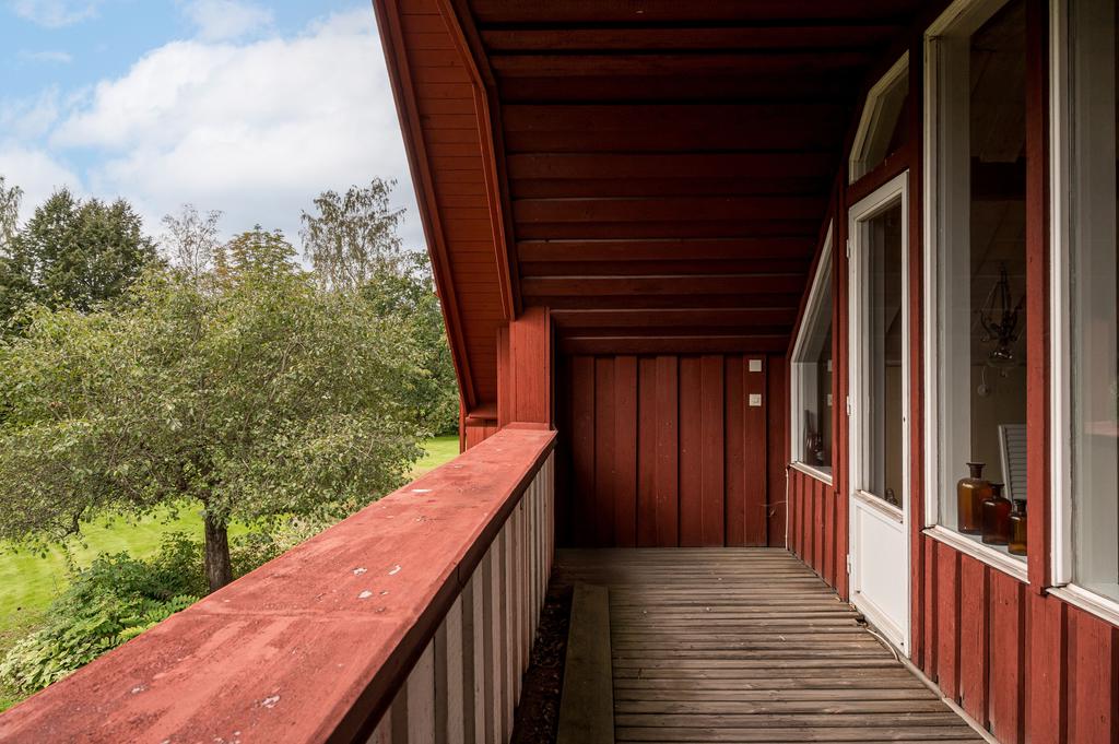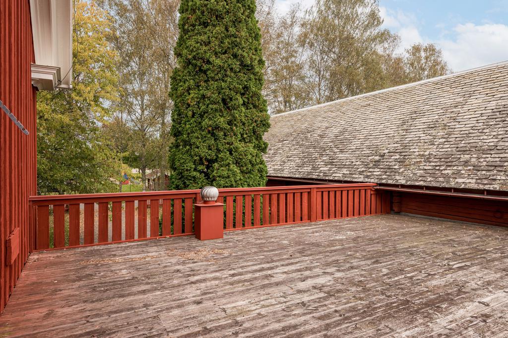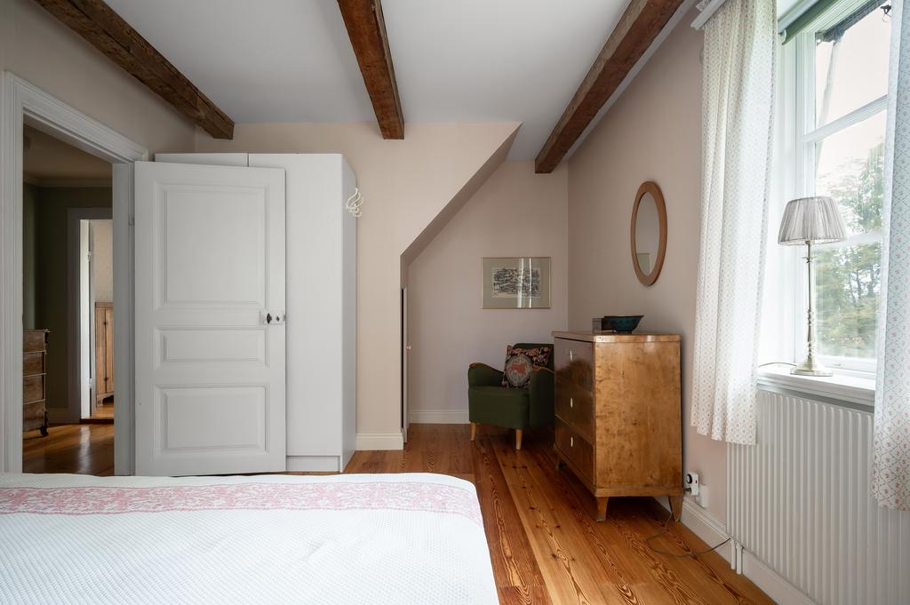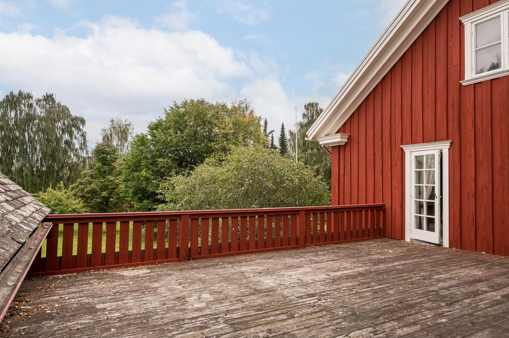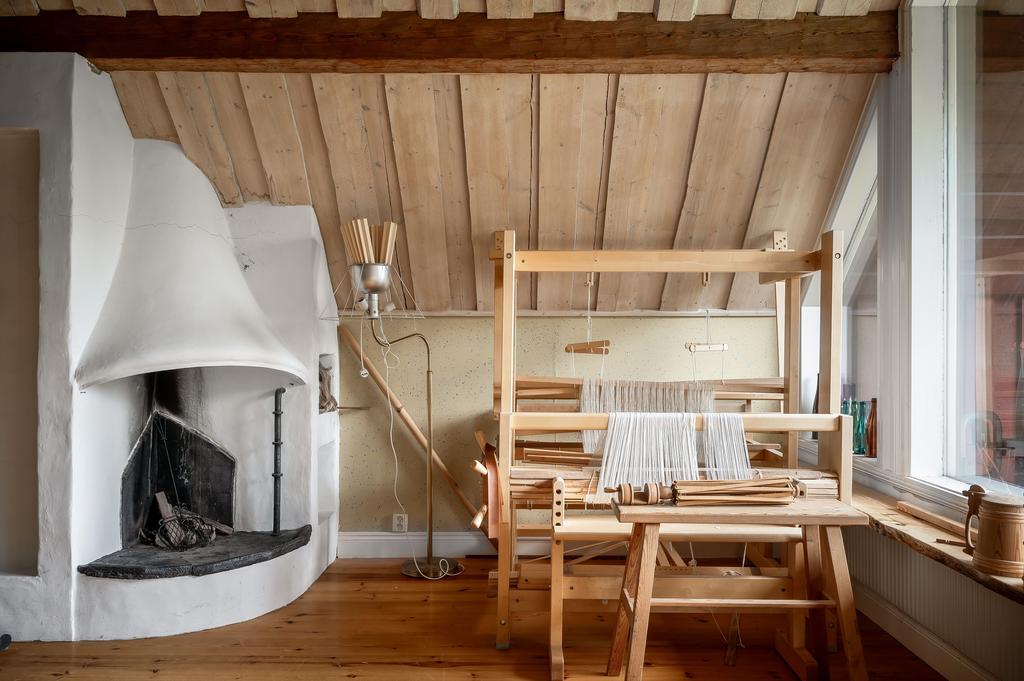 På övre plan, i den vinkelbyggda delen av huset, finns ett stort allrum som kan användas för riktigt stora sällskap, eller varför inte som en kreativ ateljé för den som behöver generösa utrymmen för sitt skapande. Här finns även ett stort utrymme som idag används som snickarverkstad, men som kan bli en del av ateljén eller förvandlas till ett extra sovrum – perfekt för den som vill ha flexibla lösningar i hemmet.