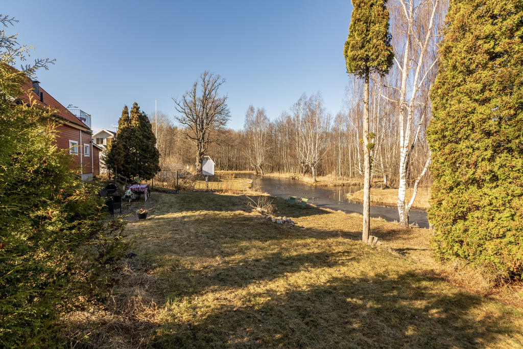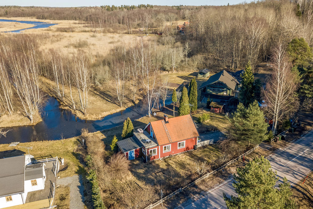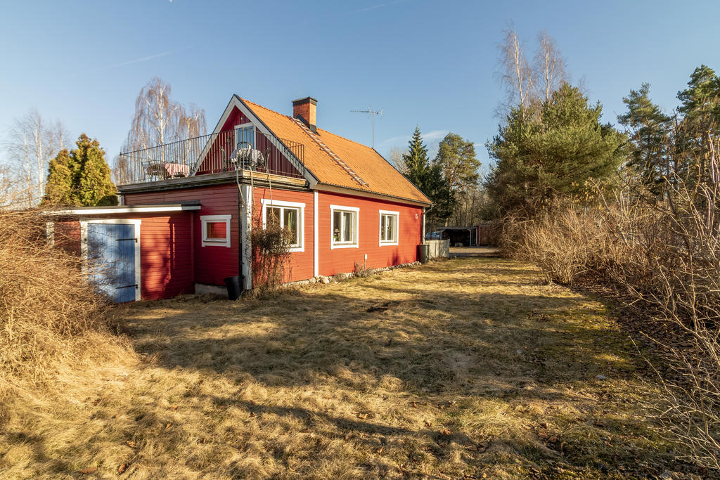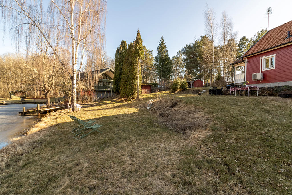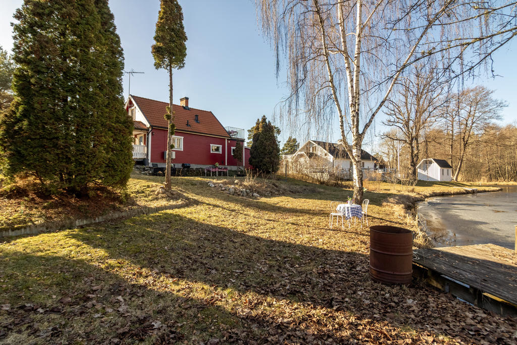 Strax intill Sandabadet finner vi Nyckelövägen 13. Redan på uppfarten känner man lugnet som vattnet skänker och fastighetens lantliga charm. Den faluröda villan har klassiskt vita knutar och nylagt tegeltak. Trädgården är uppväxt och helt insynsskyddad mot de få grannarna. Strax blommar påskens solgula forsythia, krokus och skilla i gräsmattan, därefter följer försommarens doft av schersmin och syrén. Björkarnas skira grönska i kontrast mot dess svart-vita stammar utmed kanalens blänkande vattenspegel gör att trädgården nästan känns som en Monet-tavla. Nere vid bryggan ligger båten förtöjd och i boden finns både fiskespön och flytvästar. I den lilla röda boden med den blå dörren finns reden kvar sedan den beboddes av 5 st höns som även strövade fritt i trädgården. Den omgivande skogen intill är en magisk lekplats och de öppna gräsytorna vid strandkanten har utrymme för både solstolar och sommarens kubbturneringar.