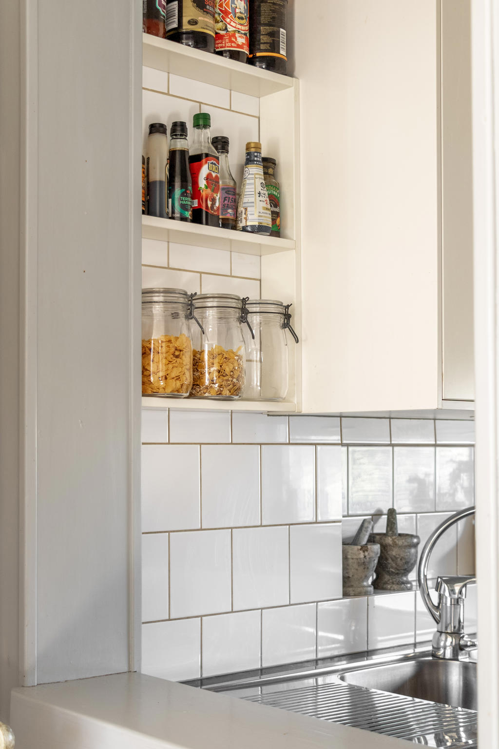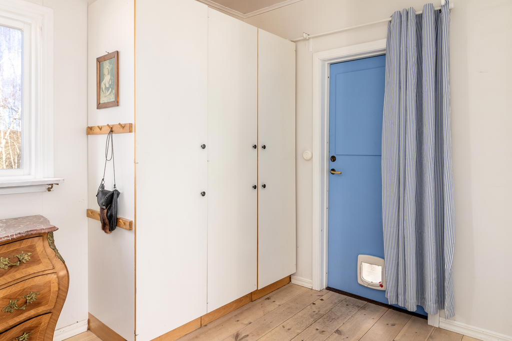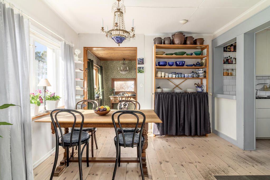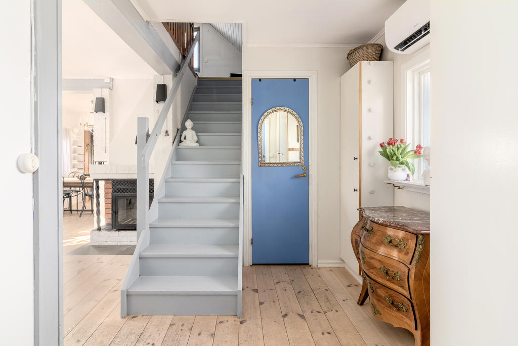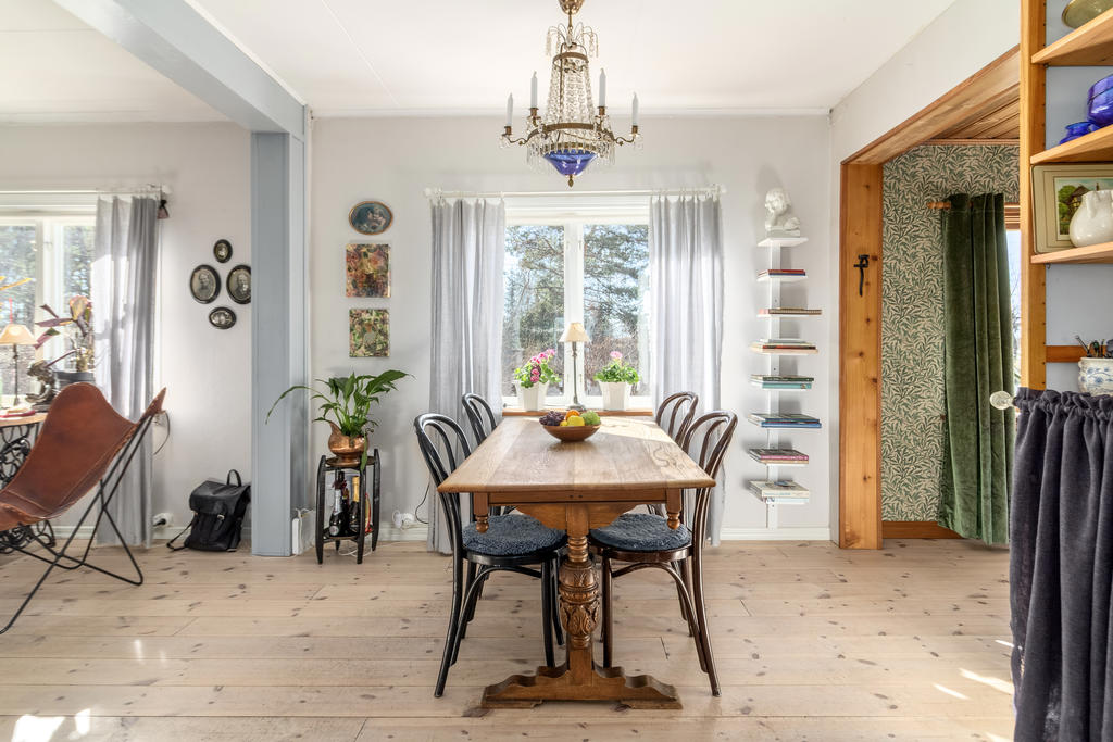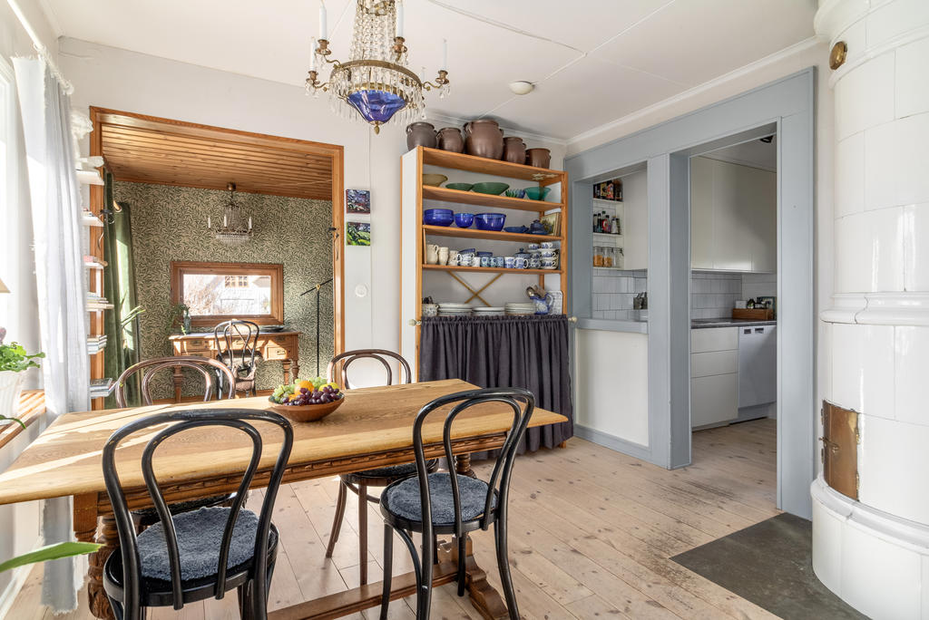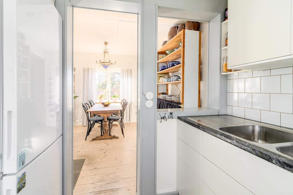Innanför farstukvisten nås ett mycket trivsamt socialt planerat hem. Hallen har bra förvaring i klädhängare och garderober för ytterkläder och skor. En liten toalett med dusch ligger i anslutning till hallen. Till vänster öppnar planlösningen upp mot vardagsrum och matrum i öppen planlösning. Vardagsrummet rymmer både en soffgrupp och läsfåtölj framför brasan i öppna spisen och matrummet rymmer matsalsmöbler för 8 personer intill den vackra kakelugnen. Den öppna planlösningen ger möjlighet att duka långbord för hela släkten under årets alla högtider. På golvet ligger ett ljust pigmenterat plankgolv och väggarna är ljust målade med snickerier i en sval gråblå nyans. Köket, som renoverades för 8 år sedan, är stilrent inrett med släta luckor och inbyggda vitvaror. Från fönstret har man perfekt utsikt över trädgården och kanalinloppets vackra björkallé. Vidare från matplatsen nås ett arbetsrum klätt i William Morris älskade Willow-tapet och en rymlig helkaklad tvättstuga med golvvärme.