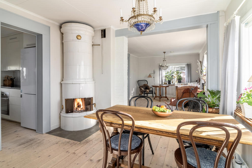 Kommunalt VA, anslutet till fibernät, uppvärmning med luftsvärmepump, braskamin och kakelugn.