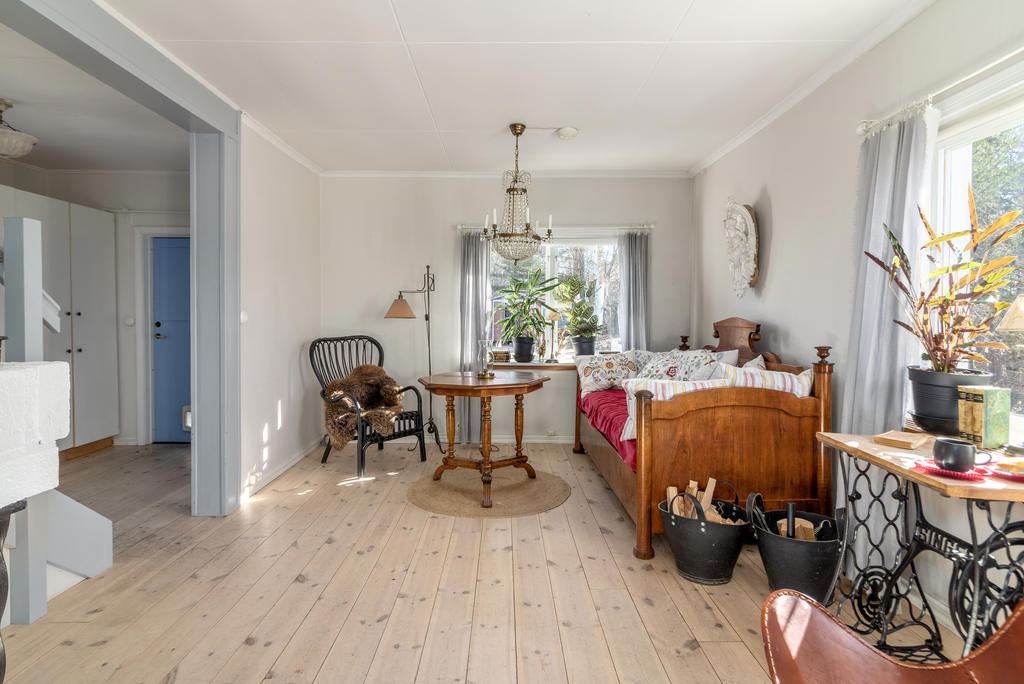 Allrum: trägolv, träpanel, utgång till balkong. Inbyggd nisch för sängplats samt platsbyggda skåp.
