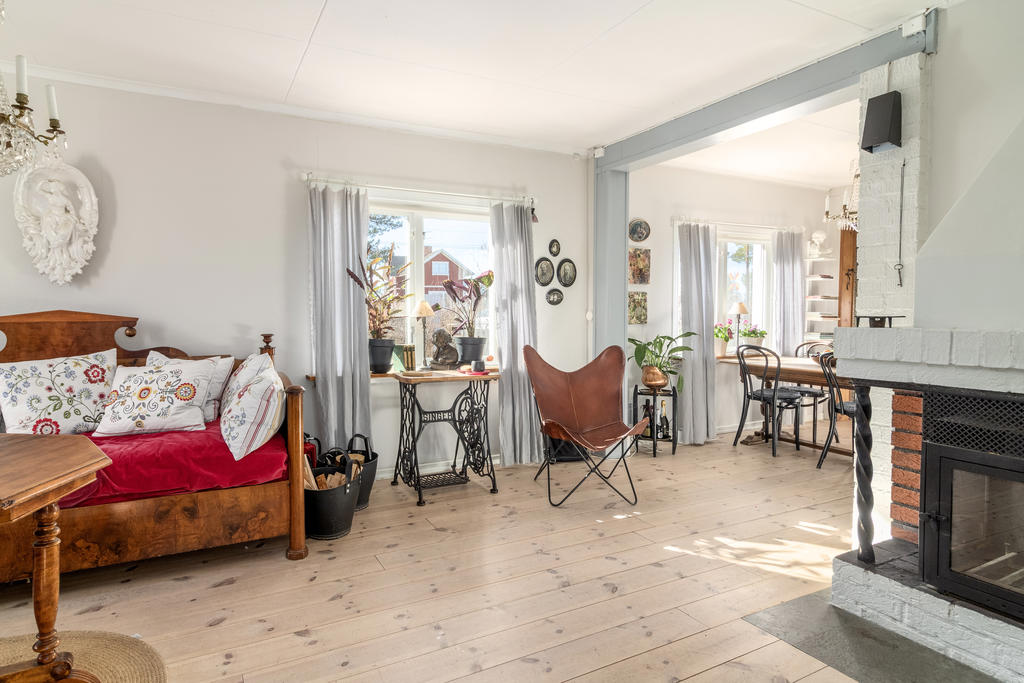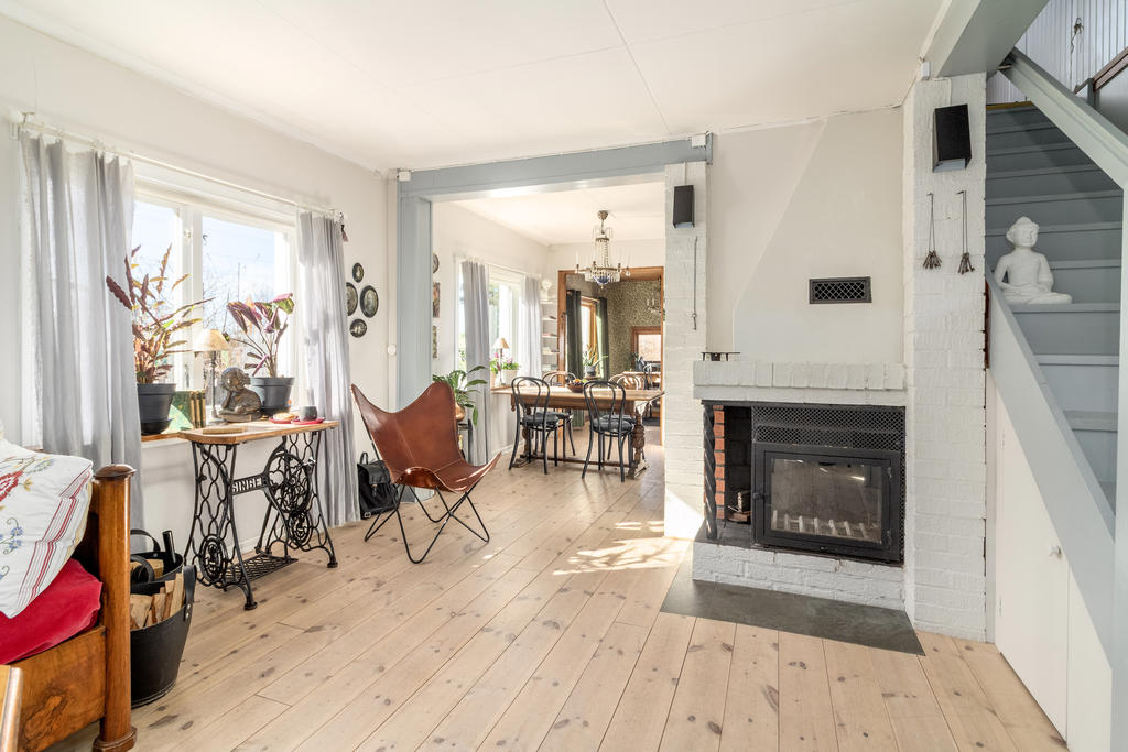 Vardagsrum: trägolv, målade väggar, öppen spis med insats.
