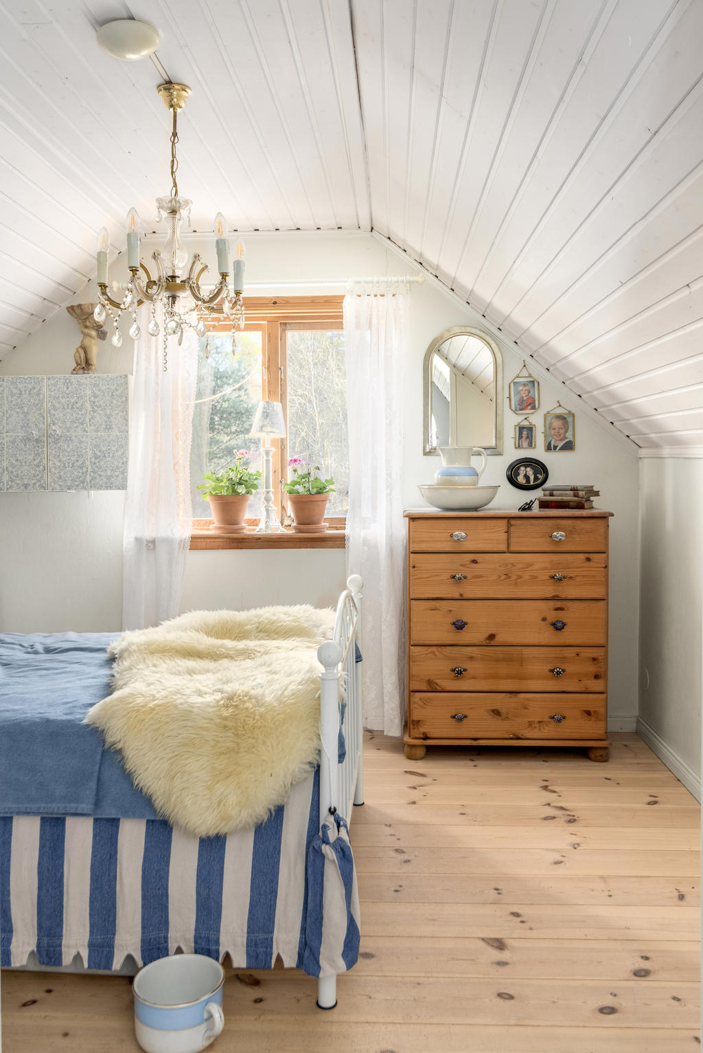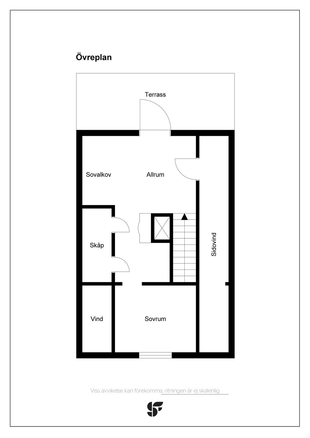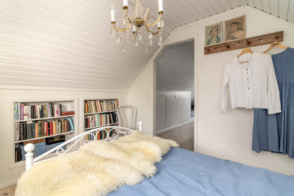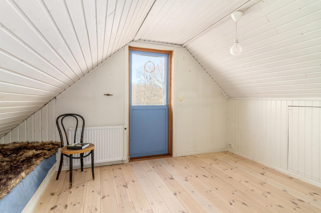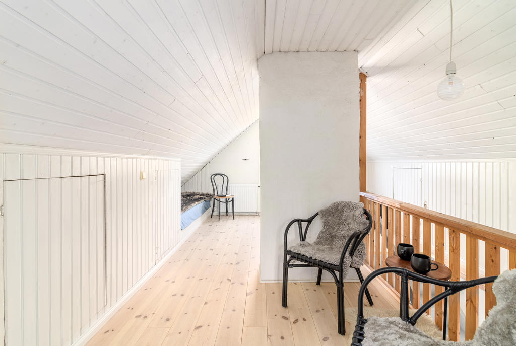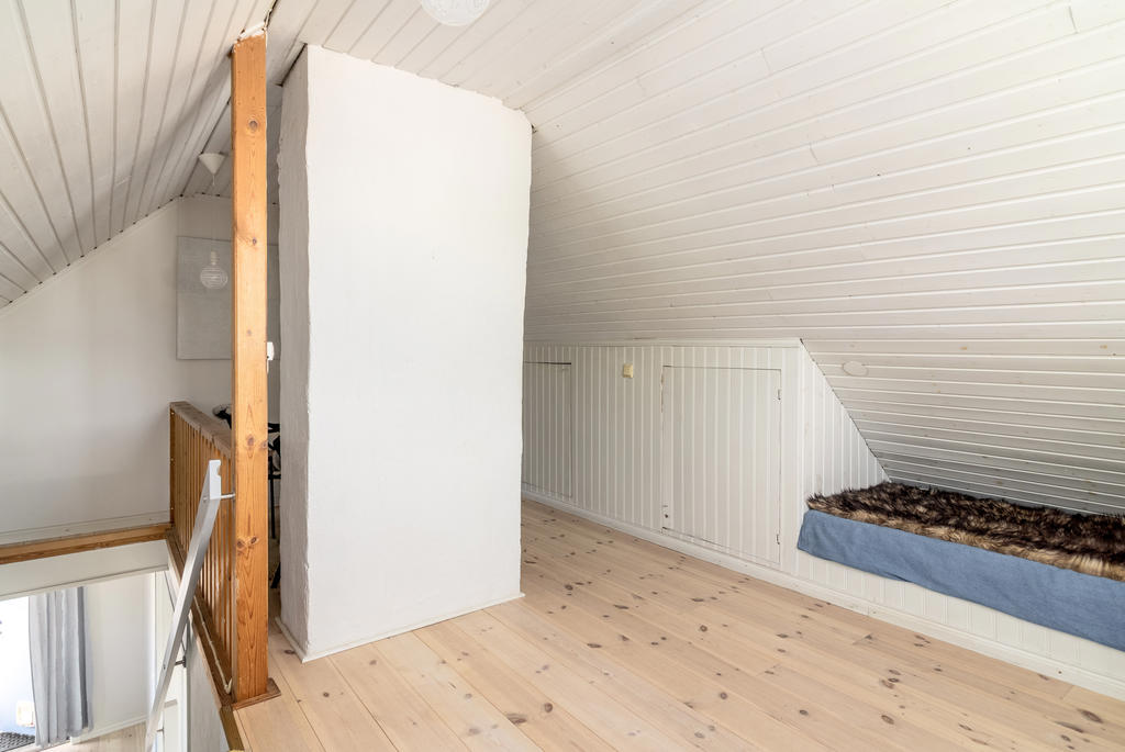 En trappa upp, nås ett allrum med infälld sängnisch och inbyggda skåp mot takfoten. Utanför dörren ligger en rymlig takterrass med sjöutsikt åt två håll. Här njuter man av den tidiga morgonsolen som gryr över kanalen och Mälaren i öster, och kvällssolen ända fram tills de sista strålarna sänker sig i Mälaren i väster.