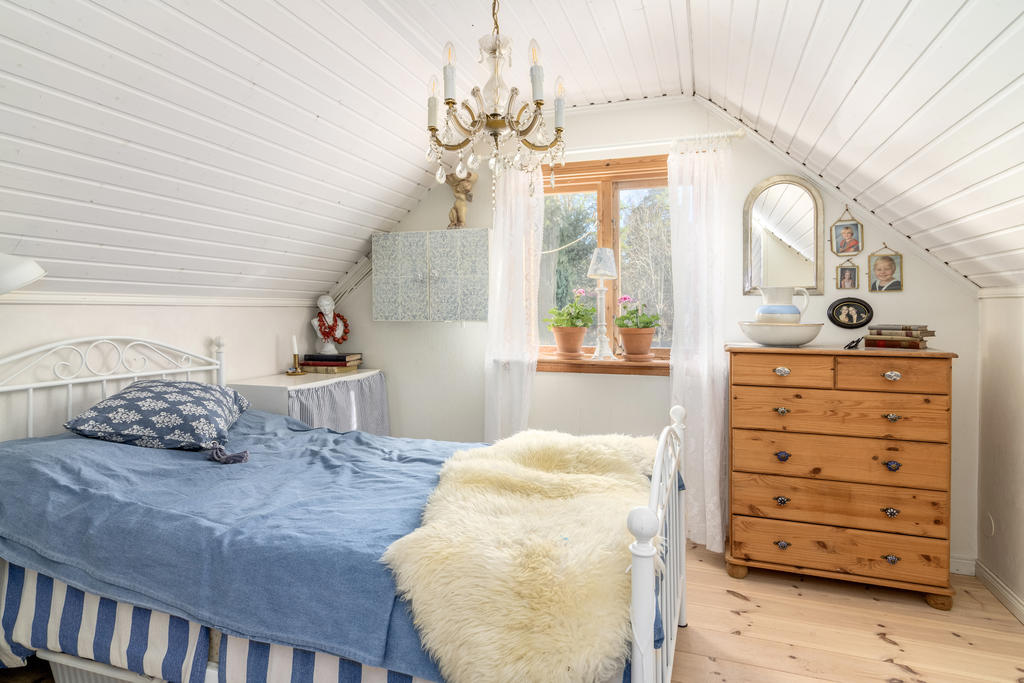 Sovrum 1: trägolv, målade väggar, inbyggd hylla.