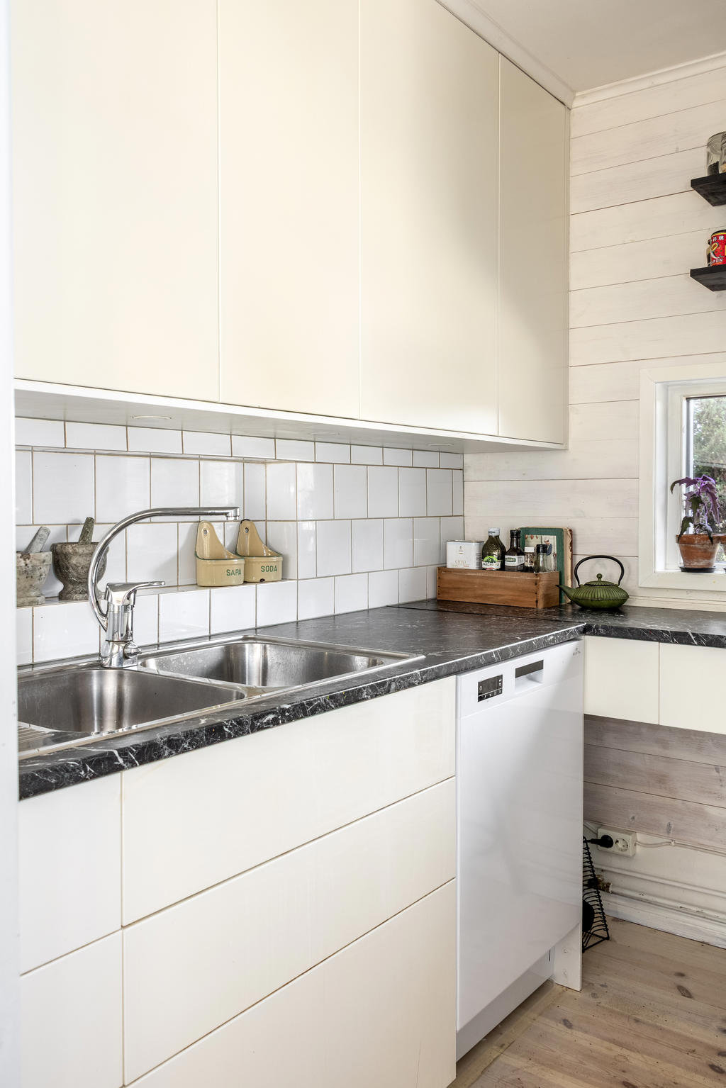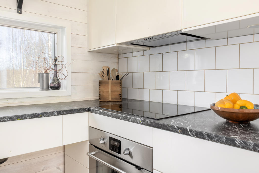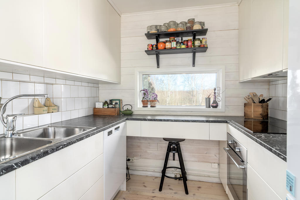 Kök/arbetskök: trägolv, träpanel, släta vita skåpluckor, vitt kakel mellan bänkskiva och överskåp. Utrustning: spishäll (IKEA), ugn (IKEA), FLÄKT (IKEA),diskmaskin (Electrolux) och kyl/frys (Hotpoint Ariston).