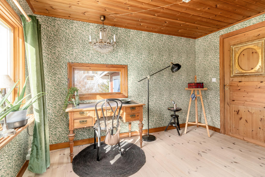 Arbetsrum/sovrum: trägolv, tapetserade väggar, 1 garderob, dörr in till tvättstugan.