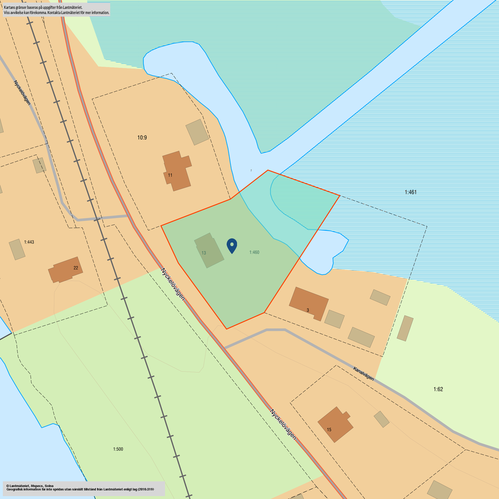 Kanalen är inte taxerad som sjö/strand därav är tomten taxerad som "Ej strand (Eller strandnära mer än 150 m)" men fastigheten löper över kanalen och en bit in på andra sidan kanalen. (se karta)