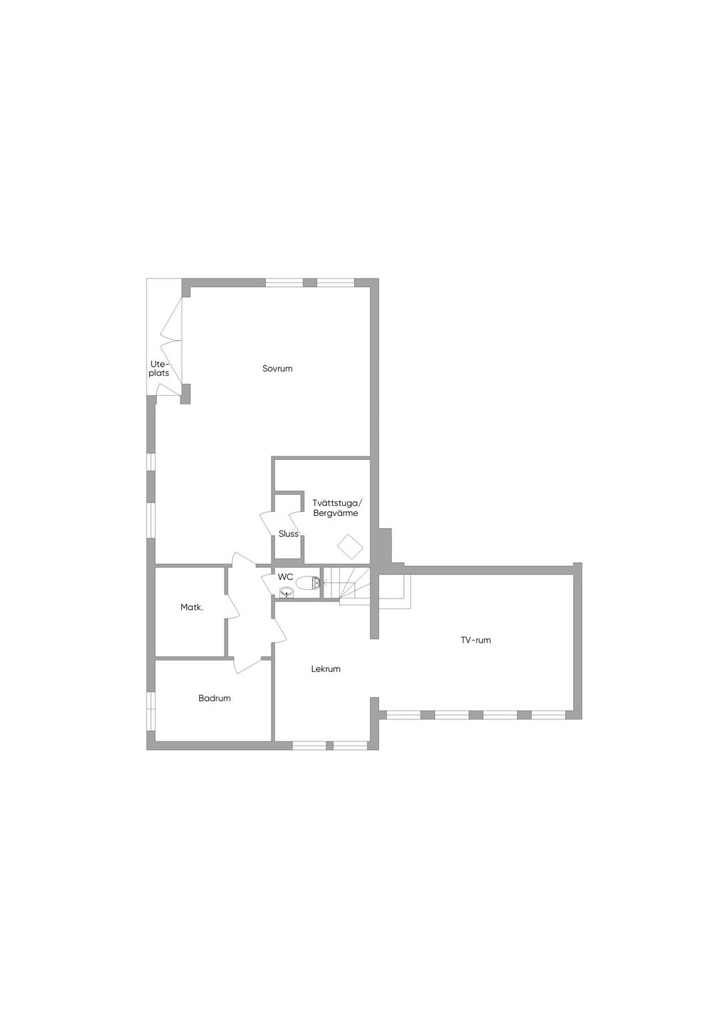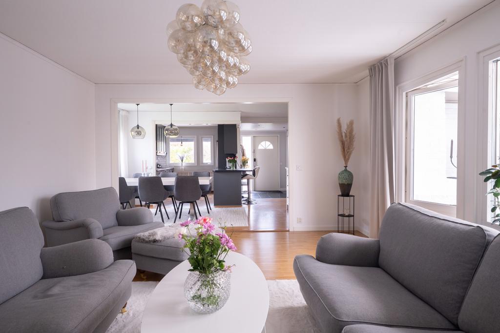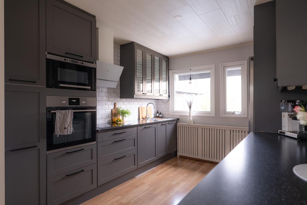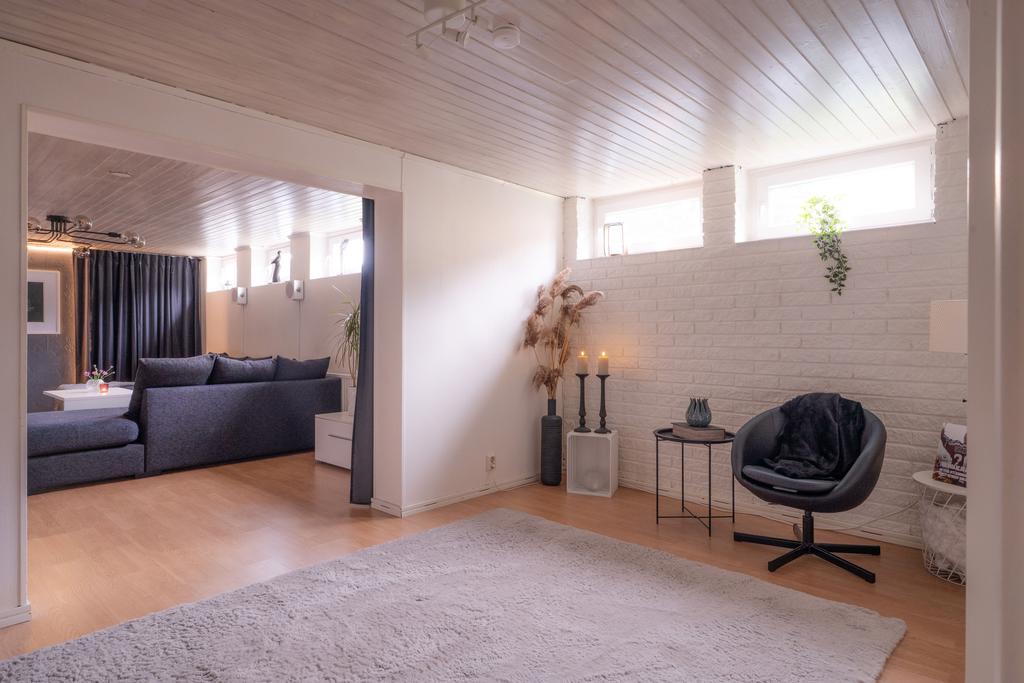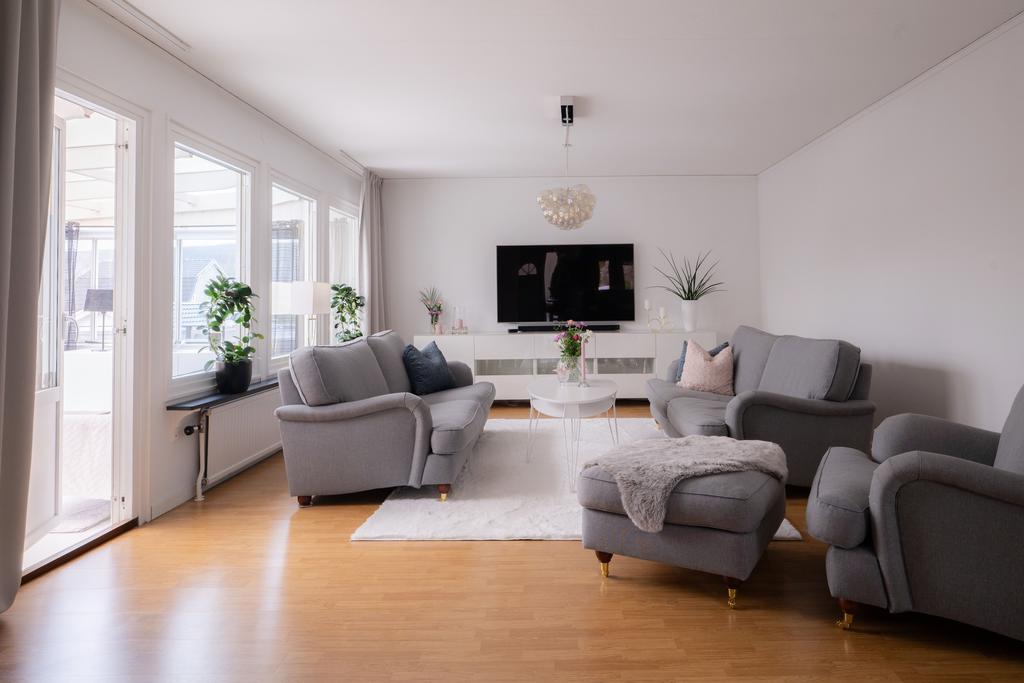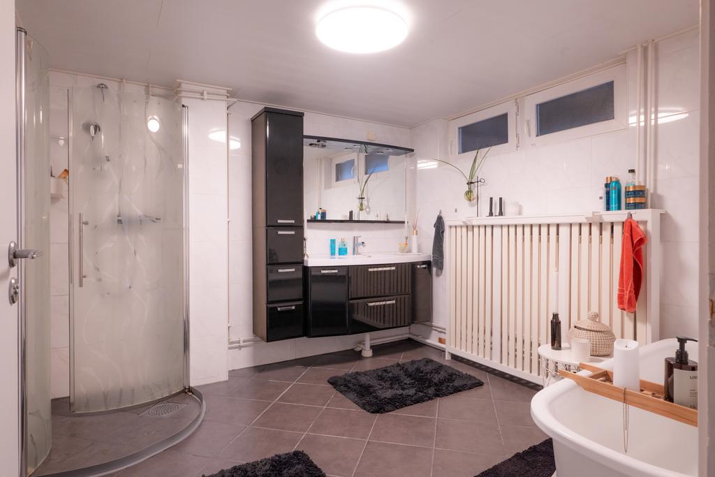 På entréplanet finns även flera sovrum samlade på ett praktiskt sätt, tillsammans med badrum och bra förvaringsmöjligheter. En trappa ner öppnar huset upp sig ytterligare med källarplanet – en yta som verkligen ger huset dess flexibilitet. Här finns stora möjligheter för exempelvis tv-rum, lekrum, hemmakontor eller gästrum, tillsammans med ytterligare badrum, tvättstuga och gott om förvaring. Ett hem som enkelt kan anpassas efter livets olika skeden.