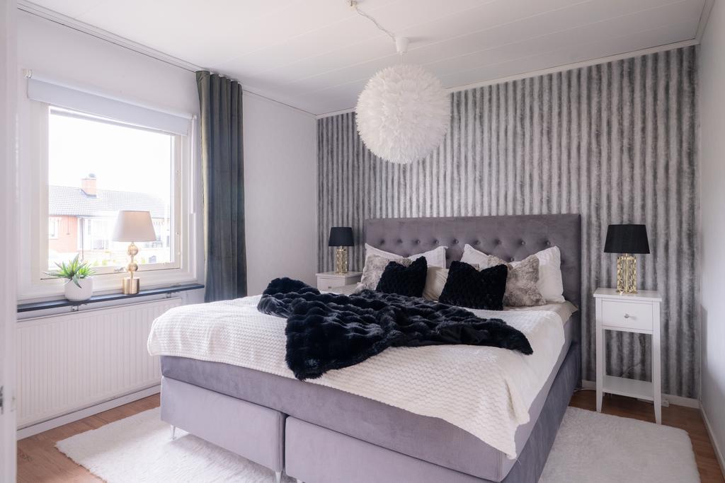 Tomten är lättskött och rymmer även två praktiska förråd som förenklar vardagen. Den svarta tegelfasaden ger huset ett stilrent och tidlöst uttryck, samtidigt som helhetskänslan är både modern och ombonad.