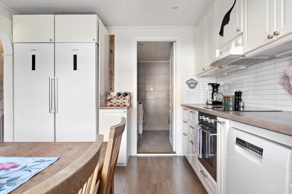 Vidare finner vi även ett fräscht kök med cremefärgade luckor, bröstpanel och ljusa väggar. Köket är utrustat med spishäll, ugn, spisfläkt där man även styr husets ventilation, kyl, frys samt diskmaskin. I anslutning till köket finns praktiskt tvättstugan med klinker och kakel. Där finns en mikrougn, ny tvättmaskin -25, grovvask, städskåp, varmvattensberedare samt förvaringsskåp.