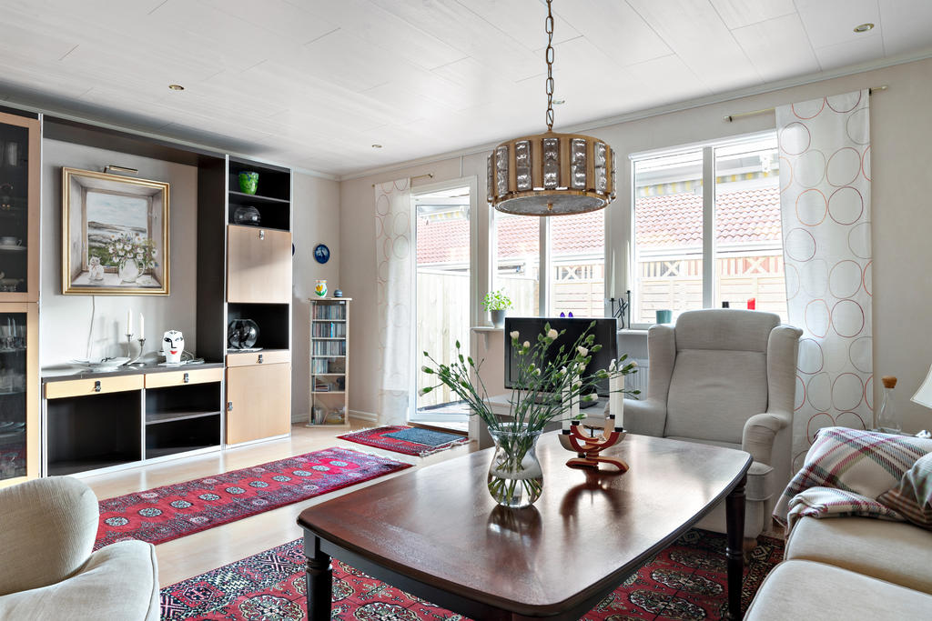 Trevligt rymligt vardagsrum med utgång till den stenlagda altanen i soligt söderläge med markis över fönsterpartiet.